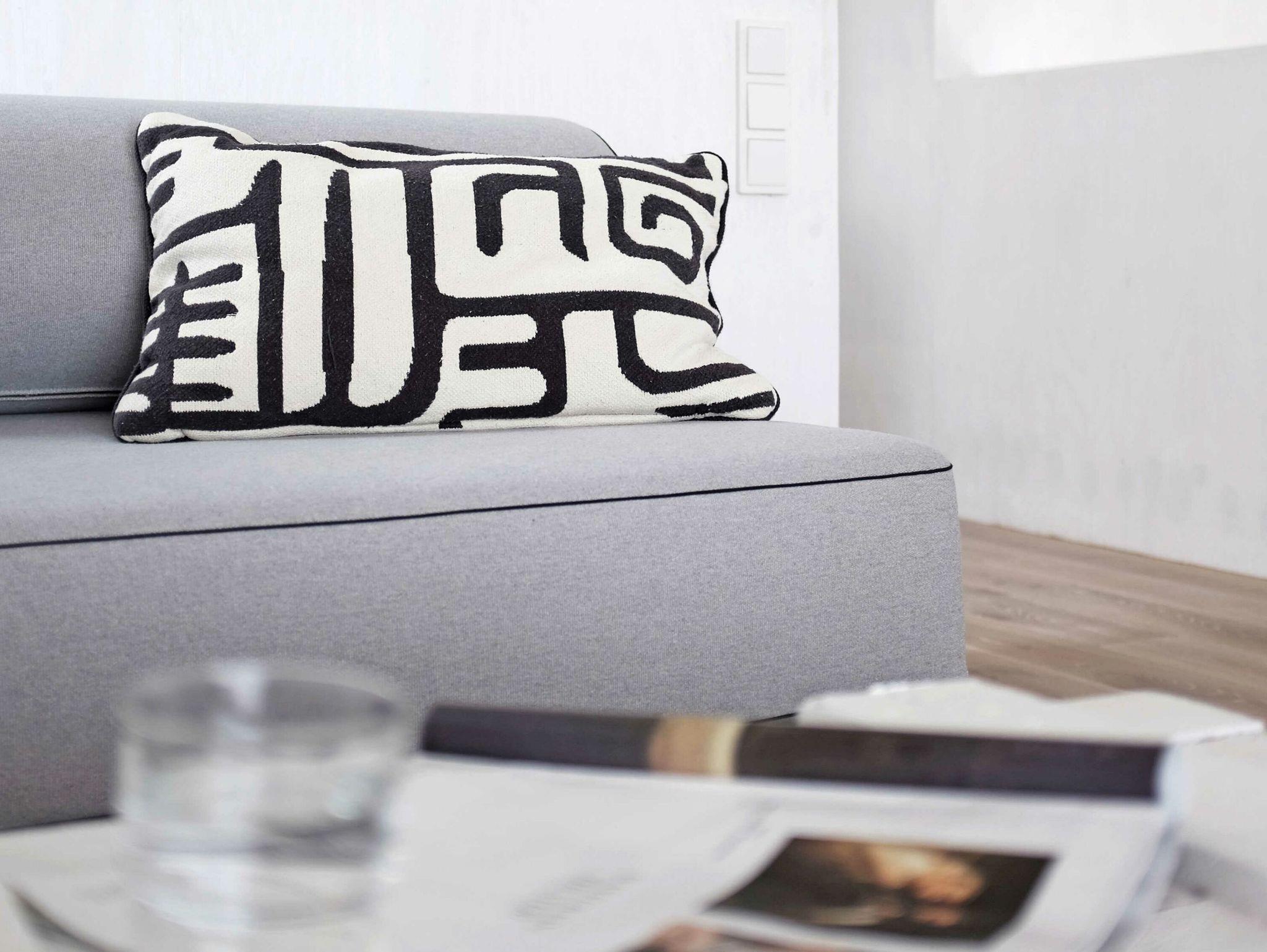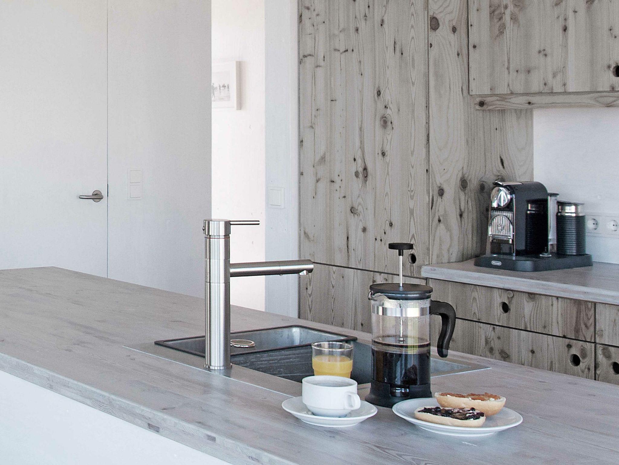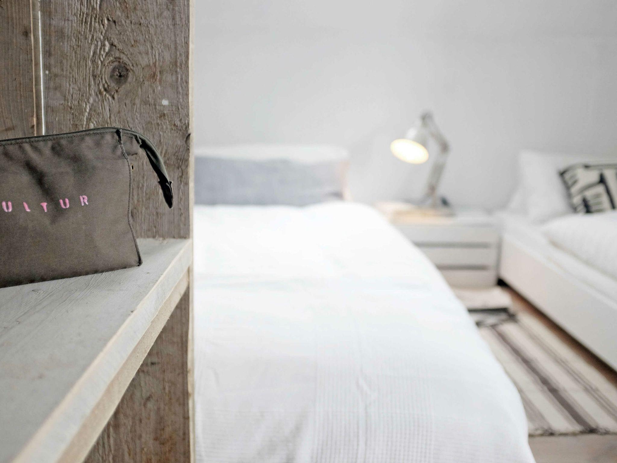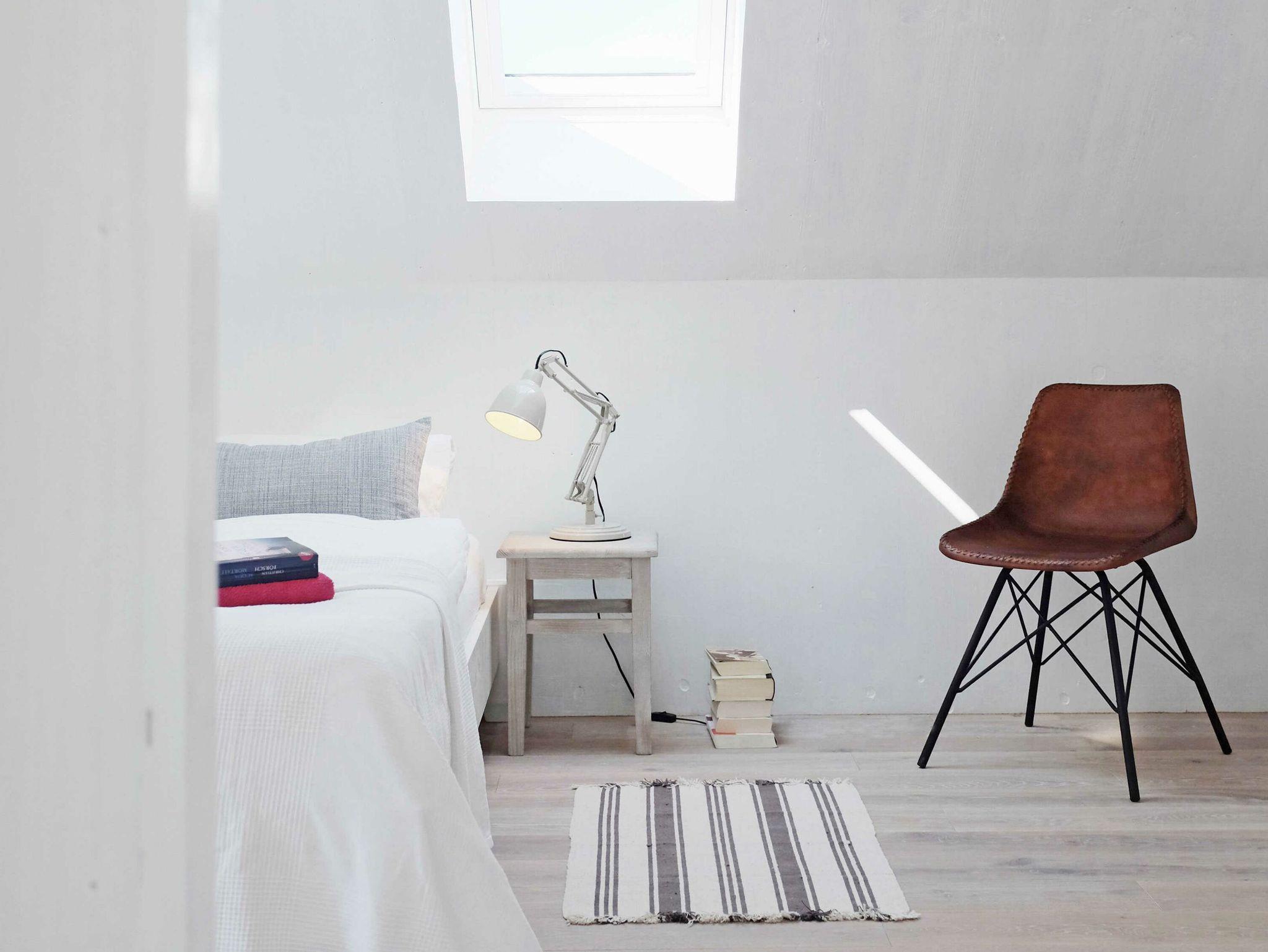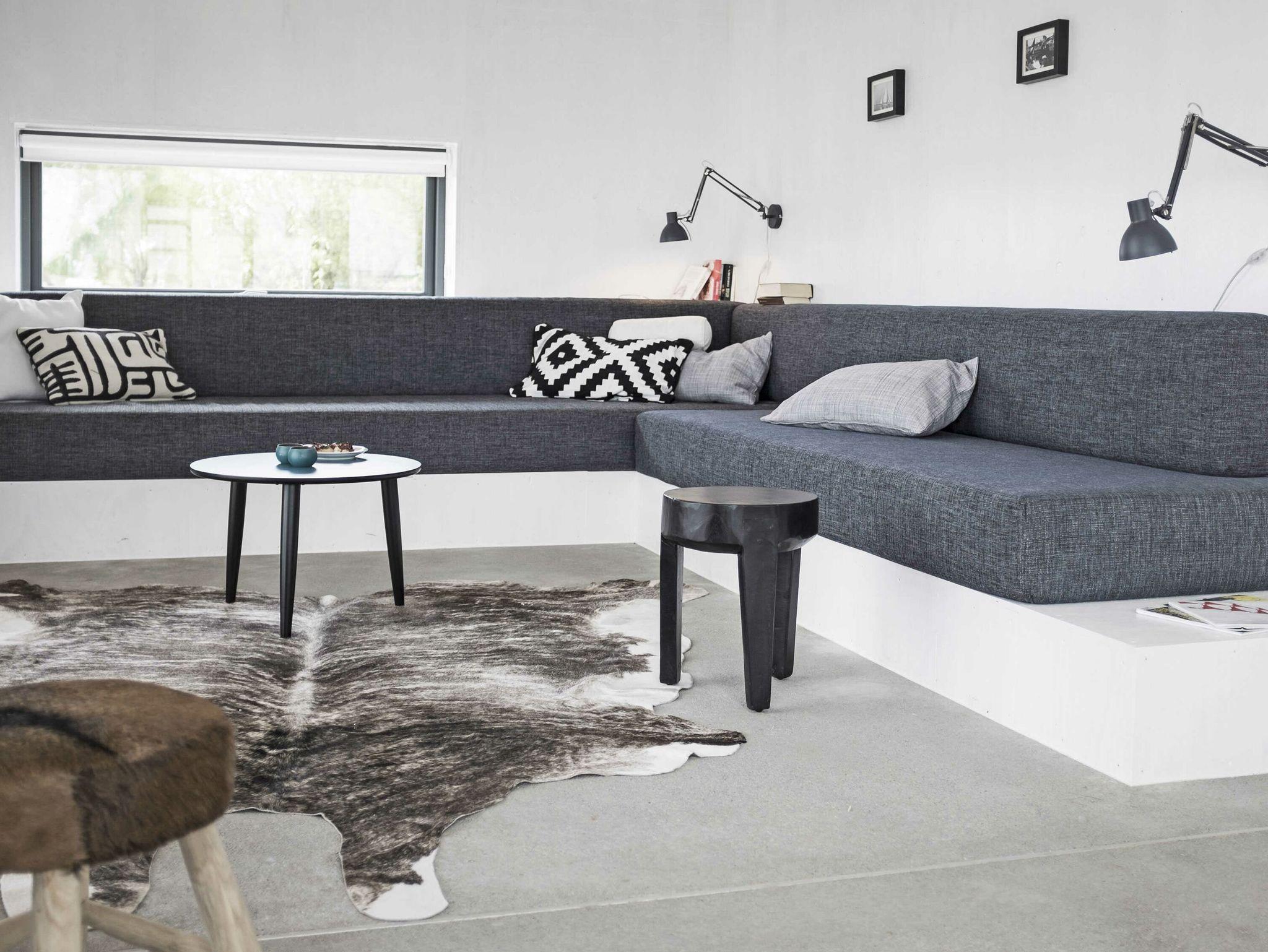 Die maßangefertigten dänischen Fenster mit großen Fronten und schlichten schiefergrauen Holzrahmen bilden einen interessanten Kontrast zu den weiß lackierten Seekieferplatten, mit denen die Innenräume verkleidet sind. Der Fußboden im Erdgeschoss besteht aus geschliffenem Sicht-Estrich, im oberen Stockwerk liegt Parkett aus gebürsteten, weiß gekalkten Eichendielen. Das gesamte Haus lässt sich über eine Fußbodenheizung angenehm temperieren und garantiert mit Kaminofen und Sauna das ganze Jahr über eine gemütliche Atmosphäre. Die Einrichtung besteht aus hochwertigen Designmöbeln, die dazu passende Farbpalette findet sich vor allem in den Tönen weiß, grau, mauve und petrol wieder.