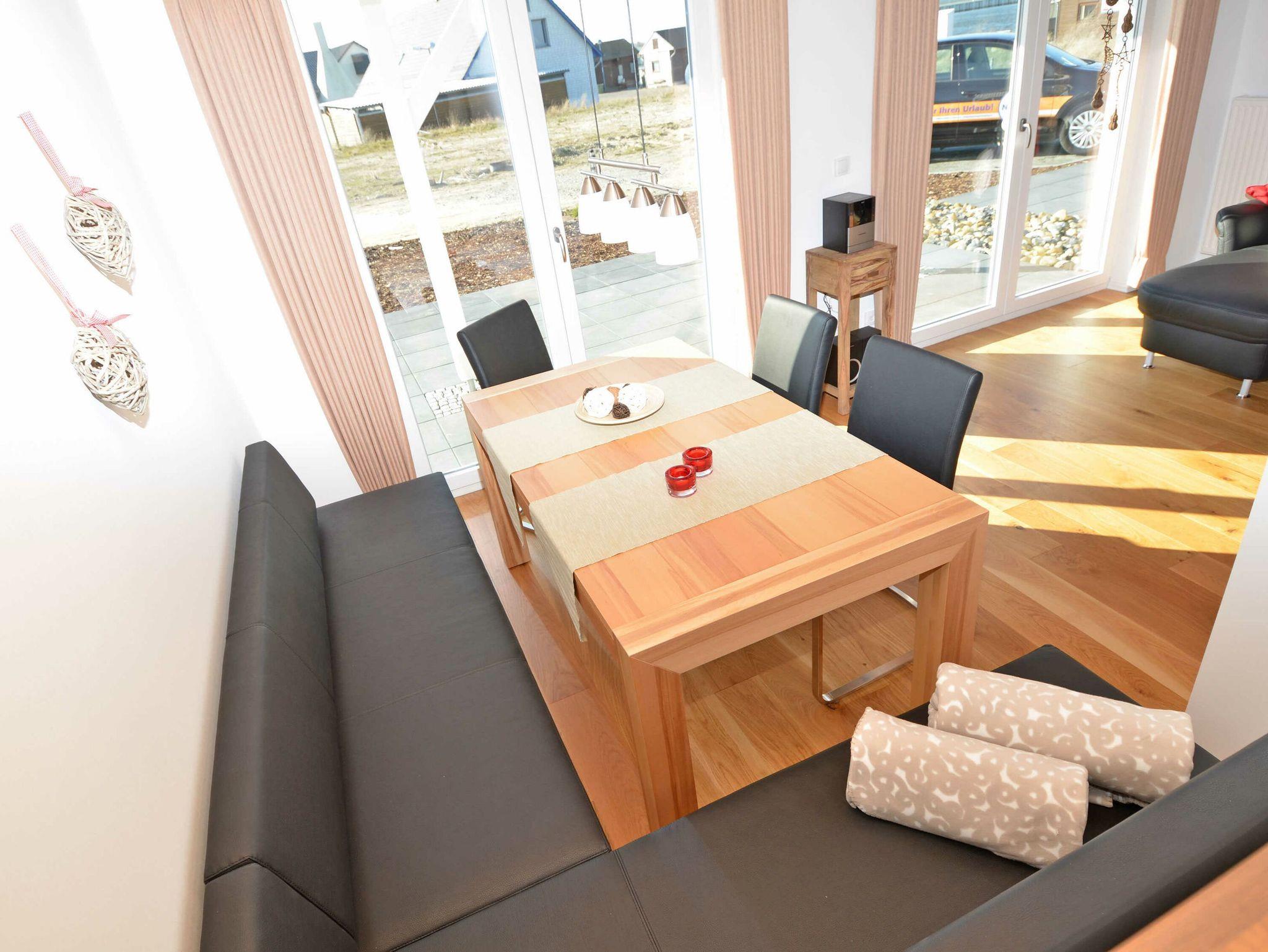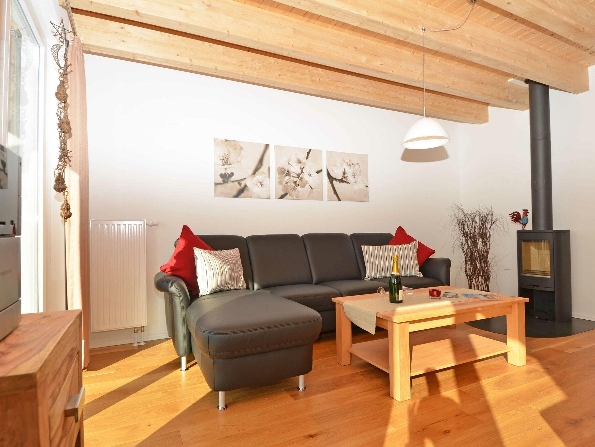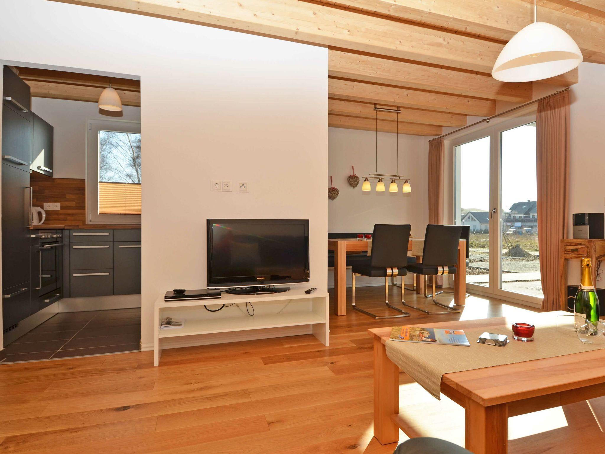 Im Erdgeschoß befindet sich das große Wohnzimmer mit der optisch vom Wohnbereich getrennten Einbauküche. Im Wohn-/Essbereich gibt es einen großen Esstisch ?in der Koje? für 8 Personen, eine großzügige Couchecke mit einem Kaminofen (das Holz ist bitte selbst mitzubringen), einen Flachbild-TV mit DVD-Player und eine Stereoanlage mit CD-Player.