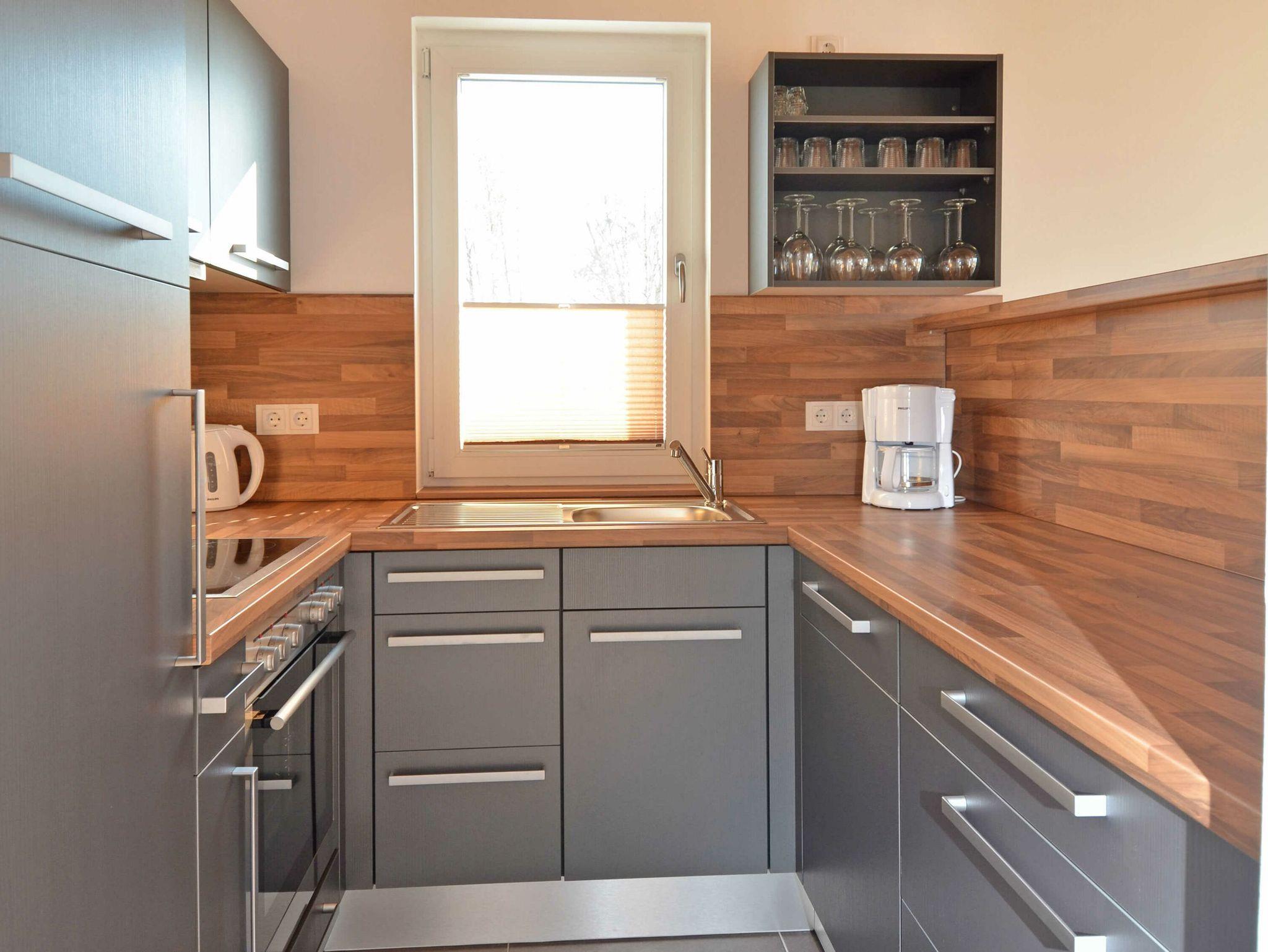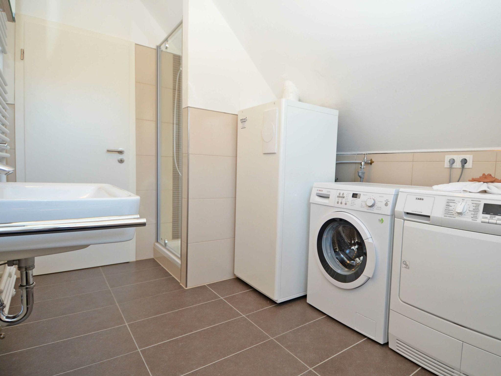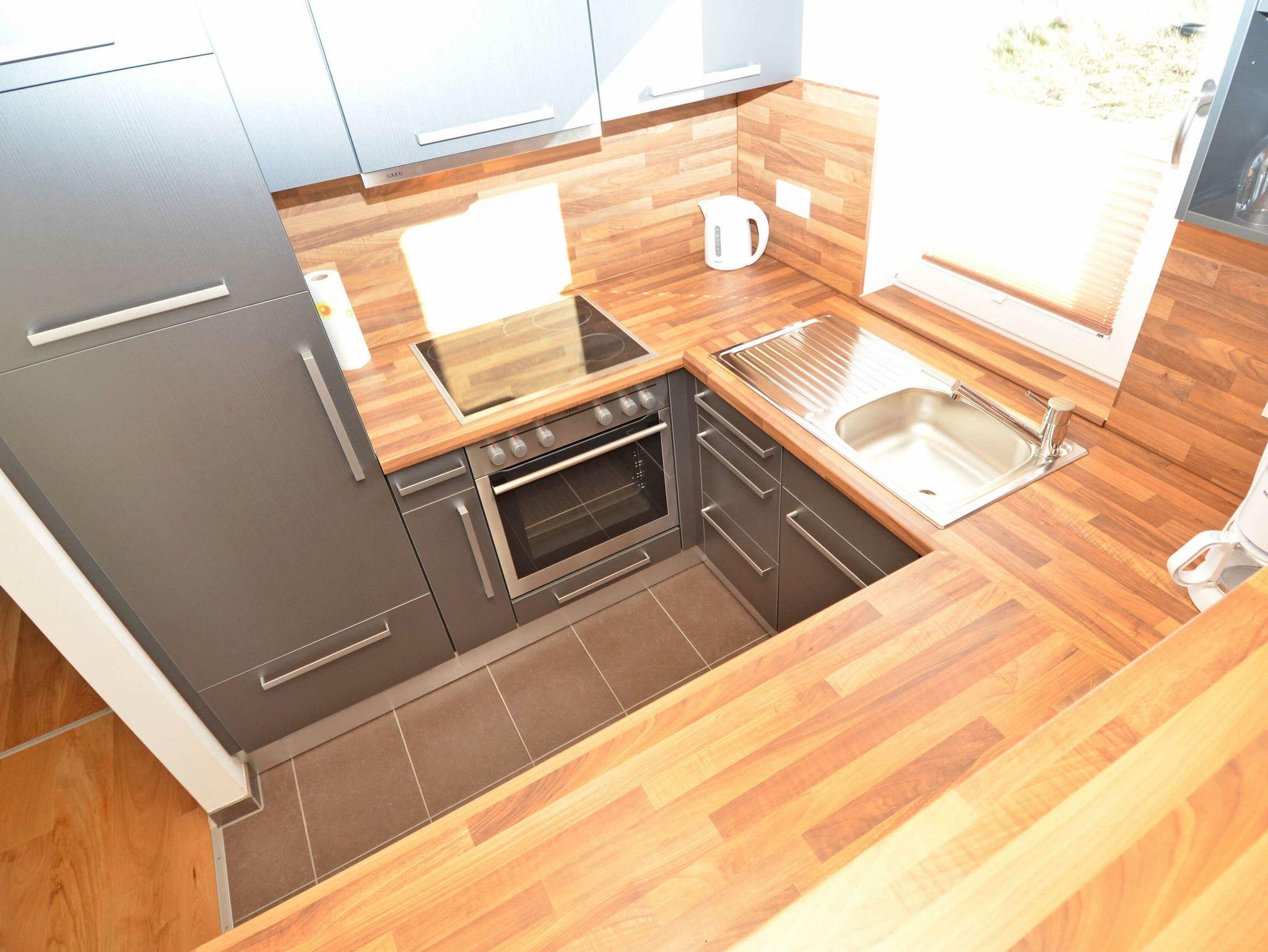 Die Küche ist komplett ausgestattet mit einem 4-Zonen-Cerankochfeld, einem Backofen, einem großen Kühlschrank mit Tiefkühlfach, einer Geschirrspülmaschine, einer Mikrowelle und diversem Kleininventar, das die gute Ausstattung komplettiert.