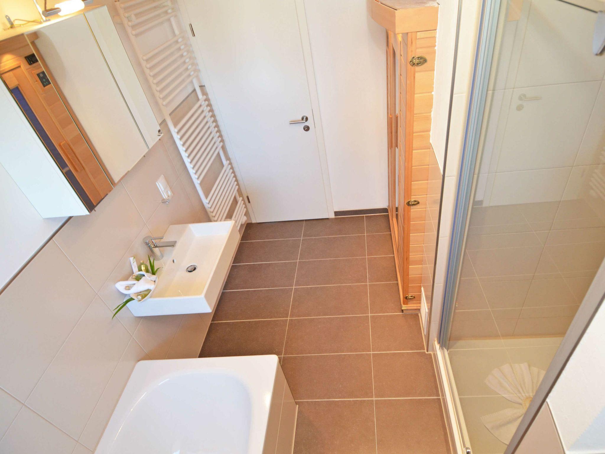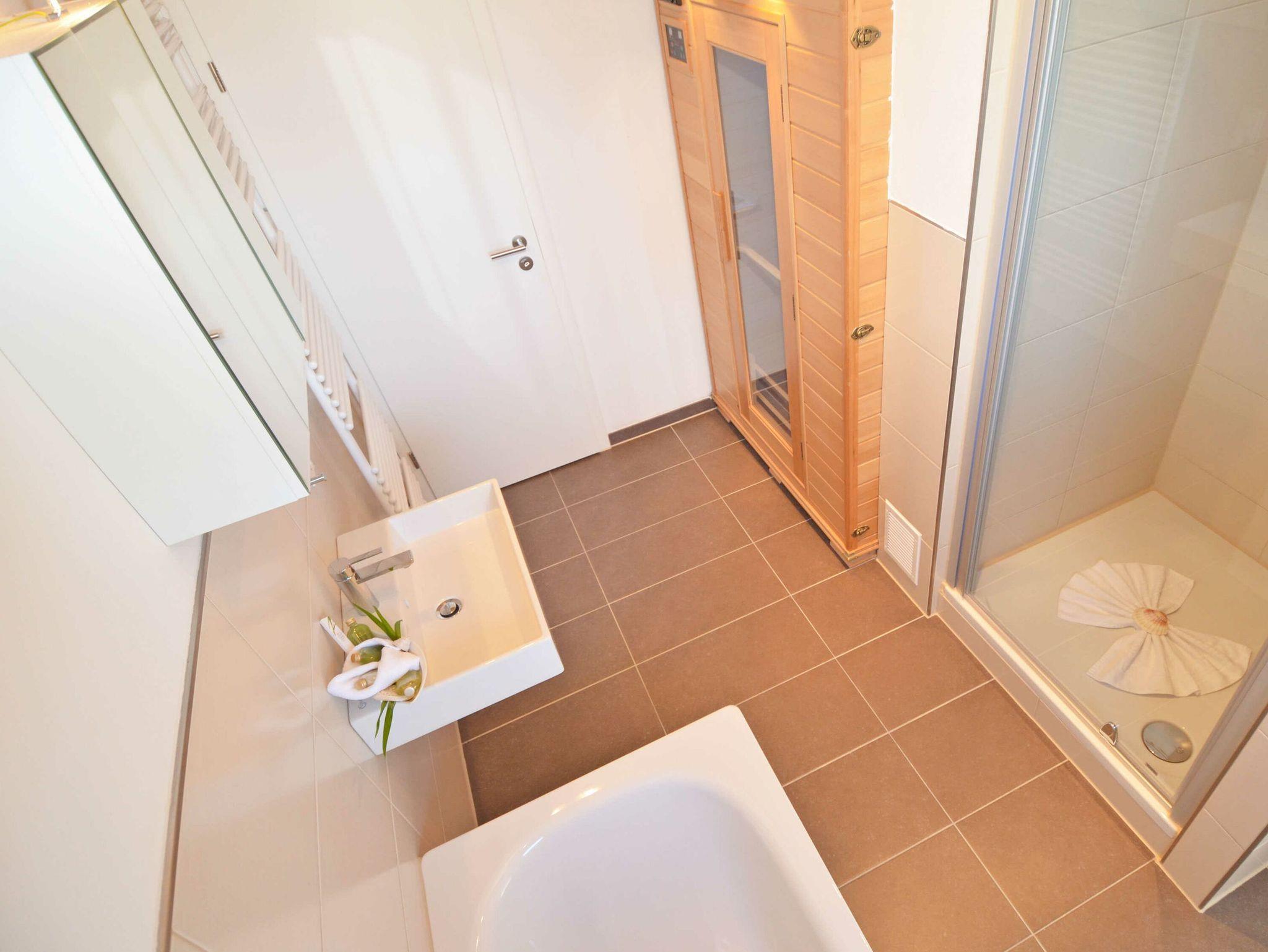 Im Erdgeschoss finden Sie außerdem ein modernes Badezimmer mit Dusche, Badewanne und einer Infrarot-Sauna sowie ein Schlafzimmer mit einem Doppelbett.