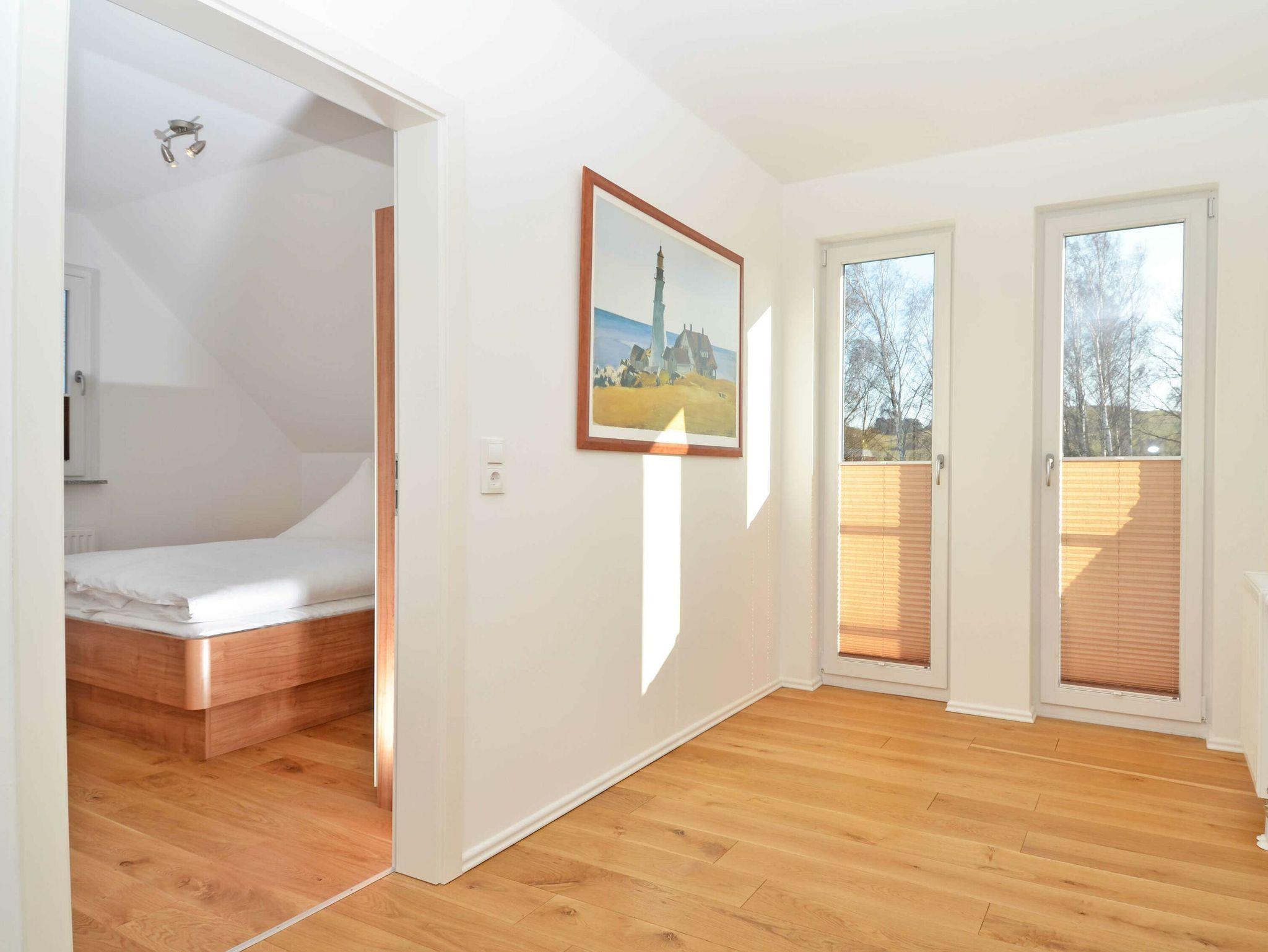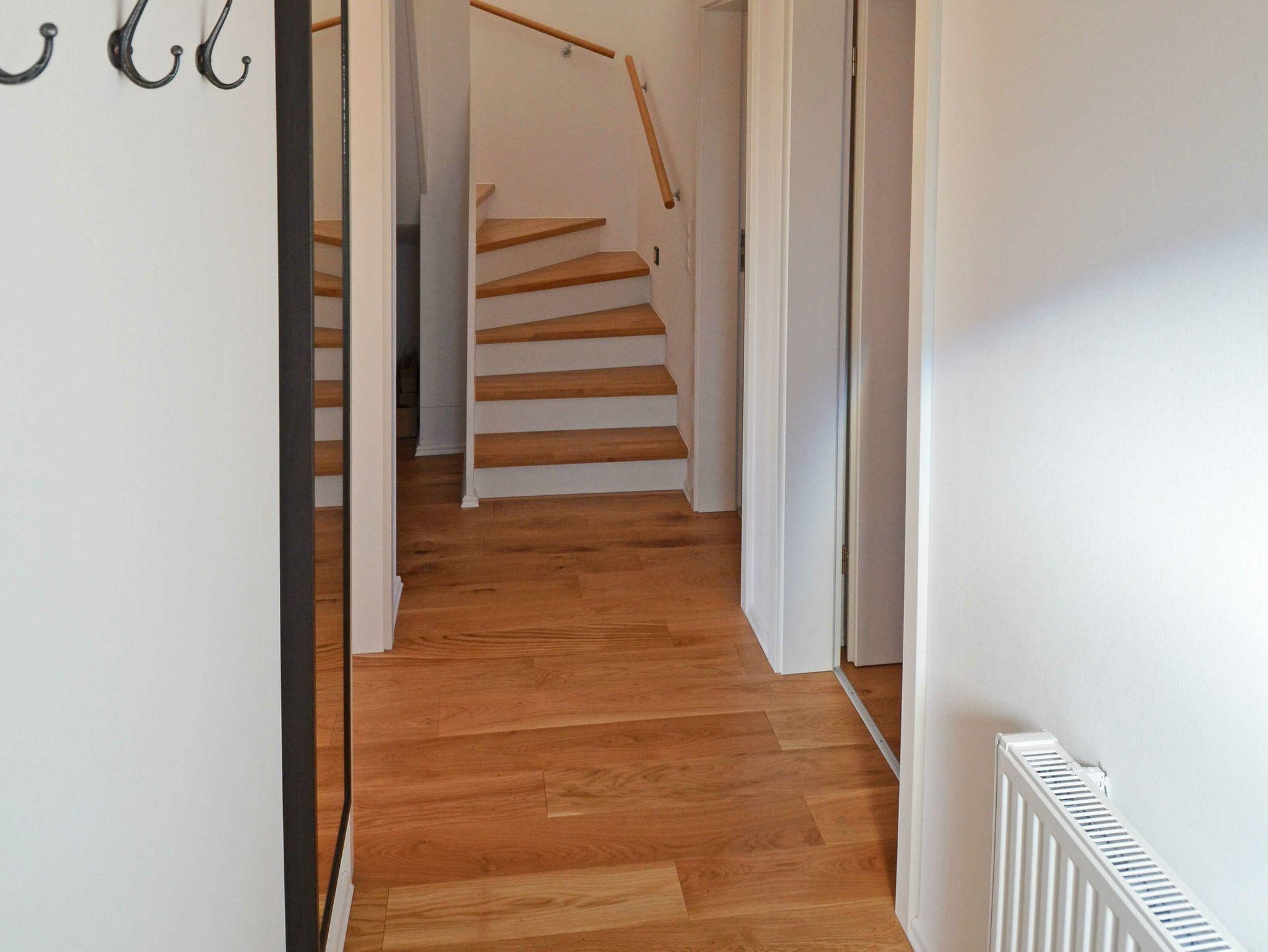 Das rechte Nichtraucher-Ferienhaus ?Kojenhus? hat ca. 130 m² Wohnfläche über zwei Ebenen verteilt mit 4 Schlafzimmern und einem ganz besonderen Wohnambiente. Es verfügt über eine möblierte Terrasse und einen kleinen Balkon zur Nord-West-Seite mit einem schönen Blick auf das Boddengewässer der Hagenschen Wieck und den Hafen von Gager. Die Balkon- bzw. Terrassenmöbel stehen saisonal - in der Regel von Mai bis Ende September - zur Verfügung.