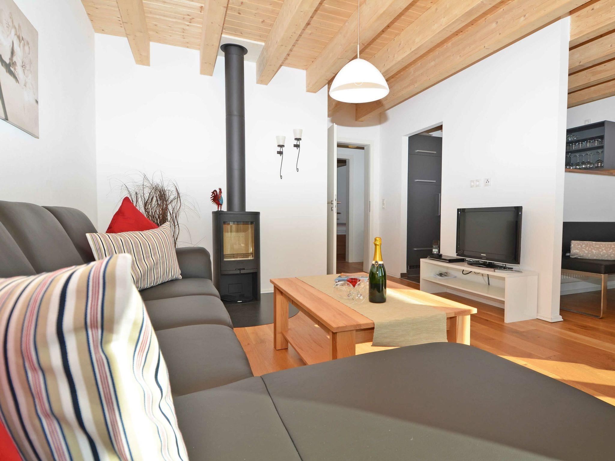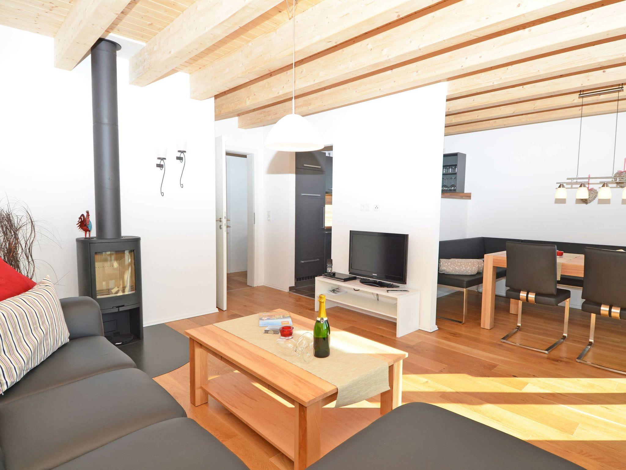 Im Erdgeschoß befindet sich das große Wohnzimmer mit der optisch vom Wohnbereich getrennten Einbauküche. Im Wohn-/Essbereich gibt es einen großen Esstisch „in der Koje“ für 8 Personen, eine großzügige Couchecke mit einem Kaminofen (das Holz ist bitte selbst mitzubringen), einen Flachbild-TV mit DVD-Player und eine Stereoanlage mit CD-Player.