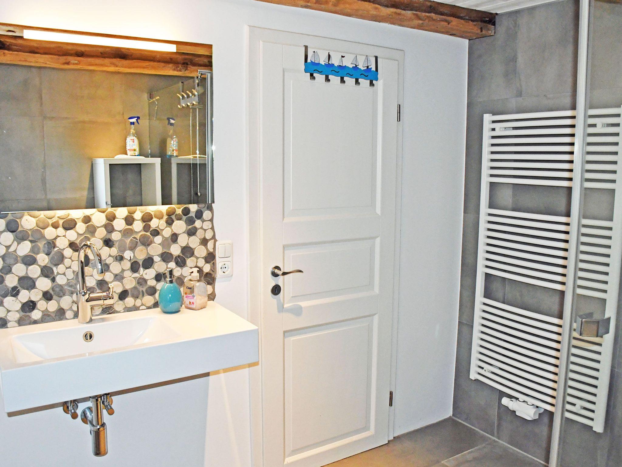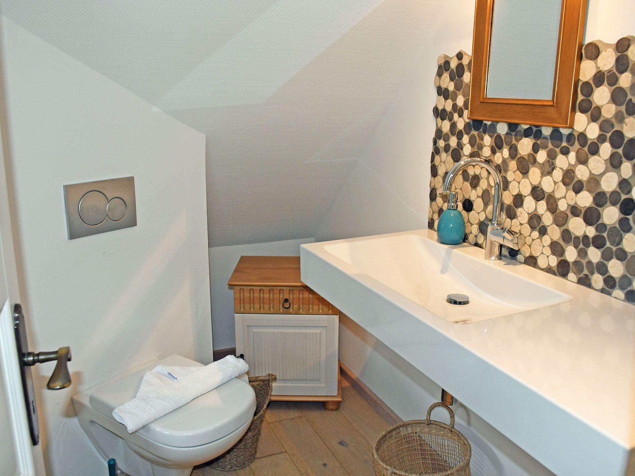 Das barrierefreie Badezimmer im Erdgeschoss ist mit Dusche, WC und Waschbecken ausgestattet. Im Obergeschoss befindet sich zudem ein kleines Gäste-WC.