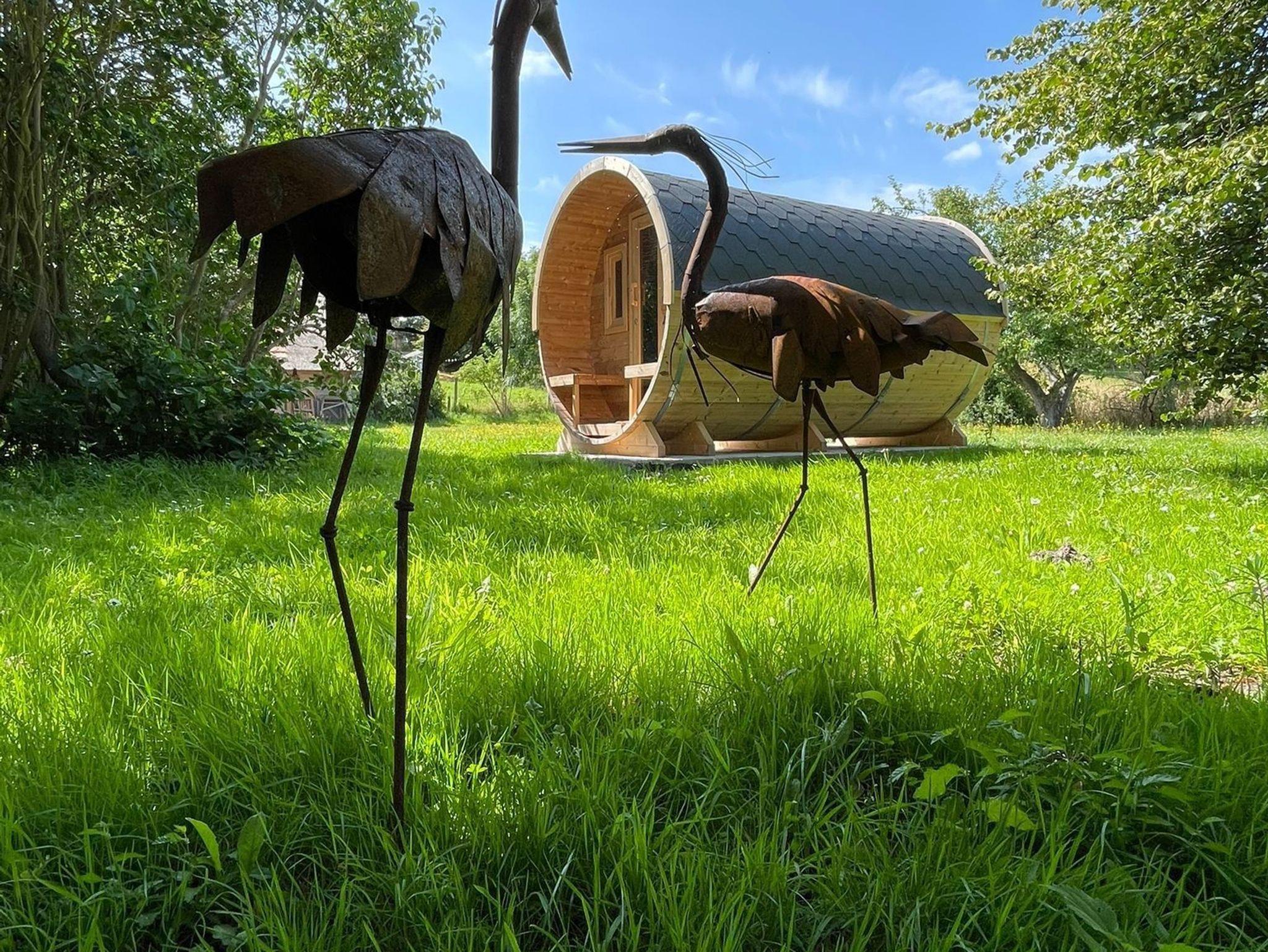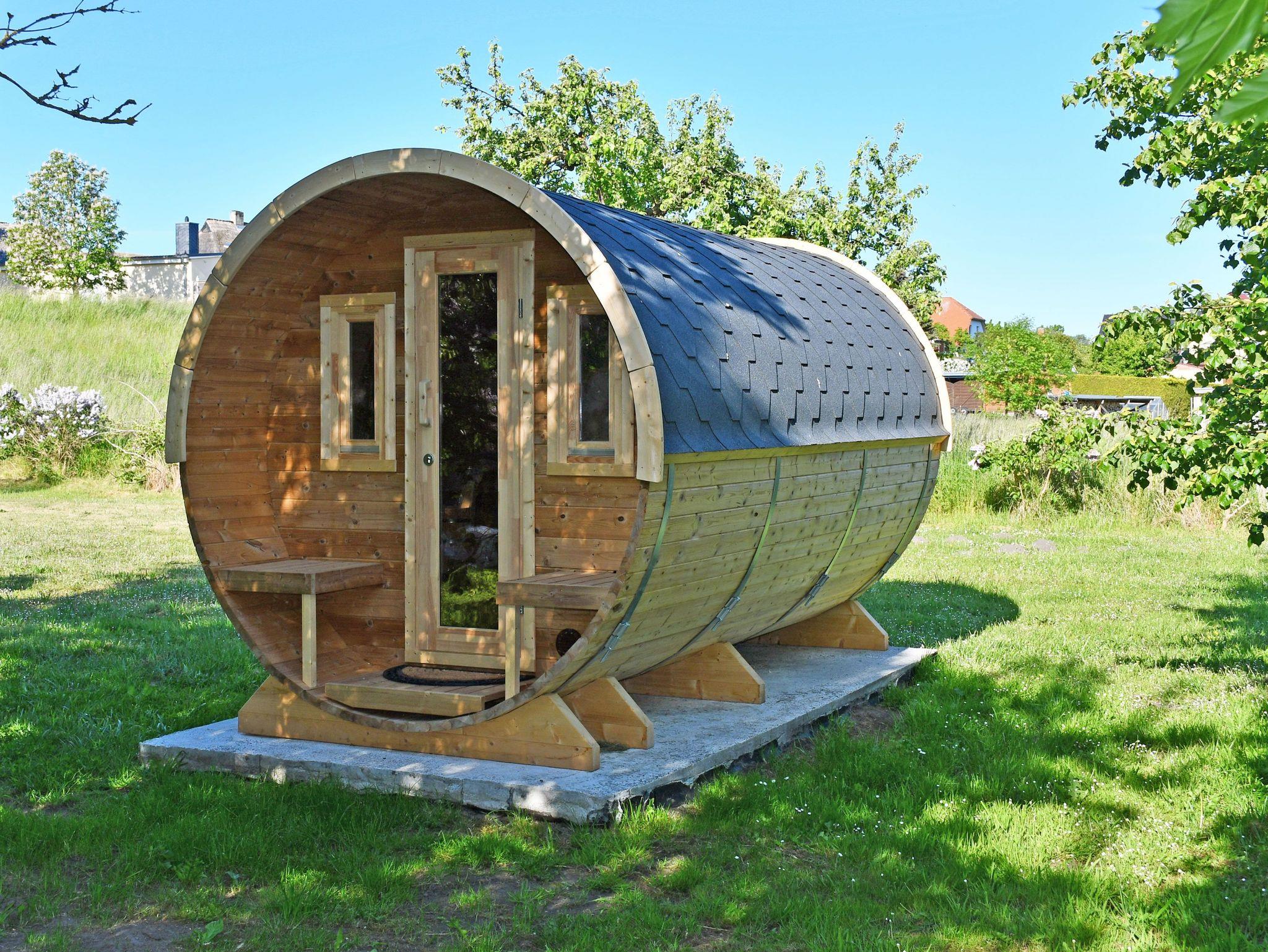 Im Garten befindet sich unsere Finn Art Fass-Sauna aus nordischem Fichtenholz. Die Fasssauna verfügt über ein Belüftungssystem, welches auf einer traditionellen, finnischen Bauweise beruht. Durch ihre runde Bauweise heizt sich die Sauna schnell auf und die Temperatur bleibt stabil. Über den elektrischen Saunaofen kann die Temperatur bis zu 100 Grad Celsius selbst reguliert werden. Die Sauna bietet Platz für bis zu 4 Personen und entsprechende Aufguss-Essenz wird für die Gäste bereitgestellt.