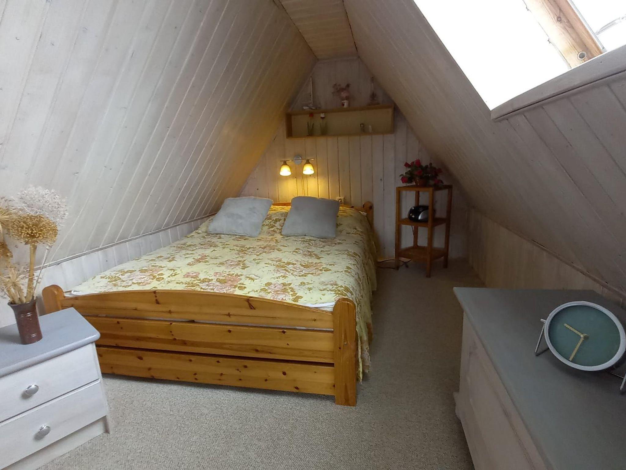 Das Ferienhaus verfügt in der unteren Etage über das gemülich eingerichtete Wohnzimmer mit der kleinen offenen Küche, Sowie dem Duschbad. In der oberen Etage, die über eine Raumspartreppe zu erreichen ist, befindet sich das Familienschlafzimmer mit 2 Doppelbetten.
