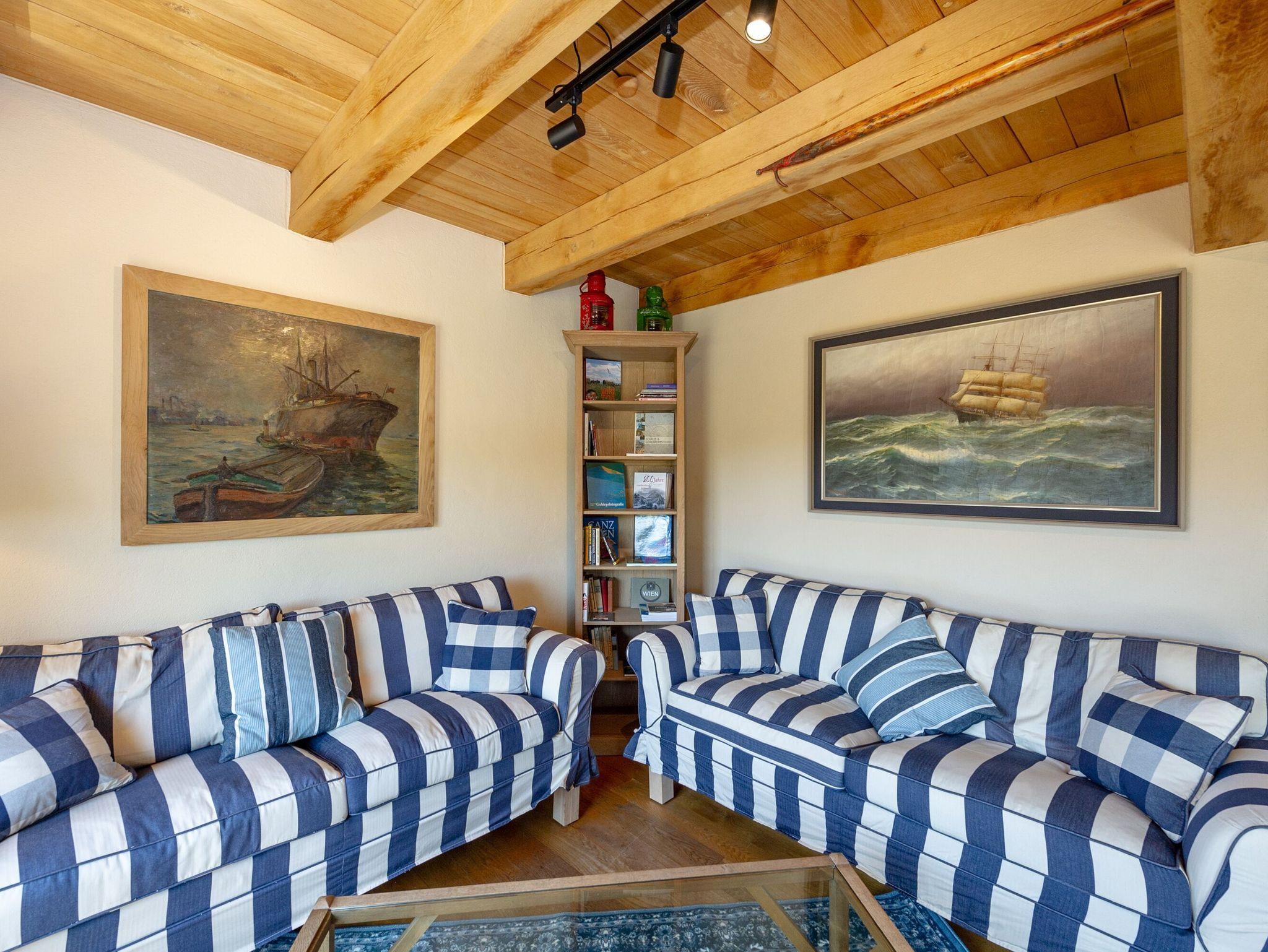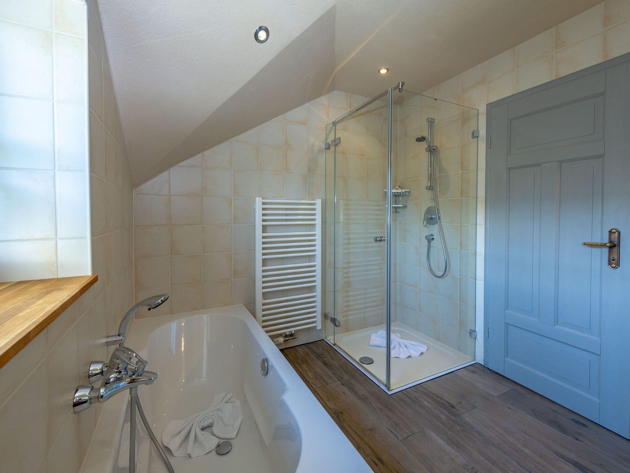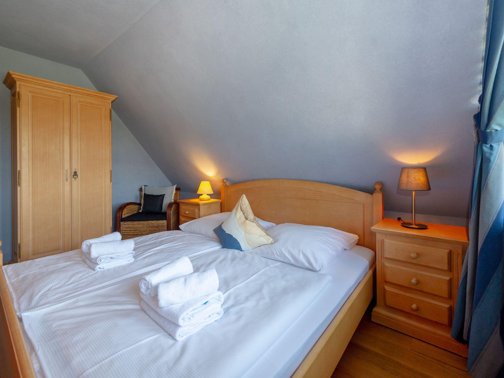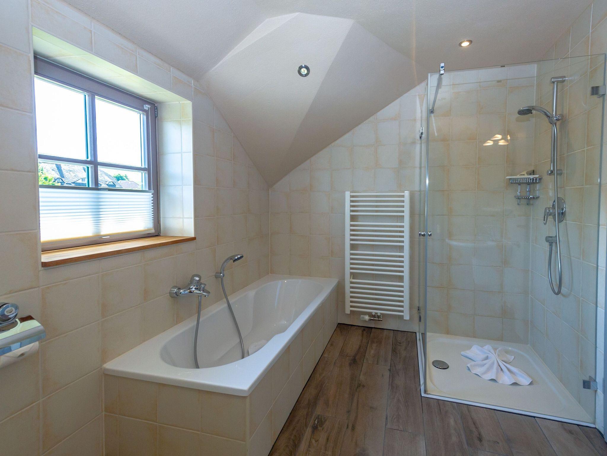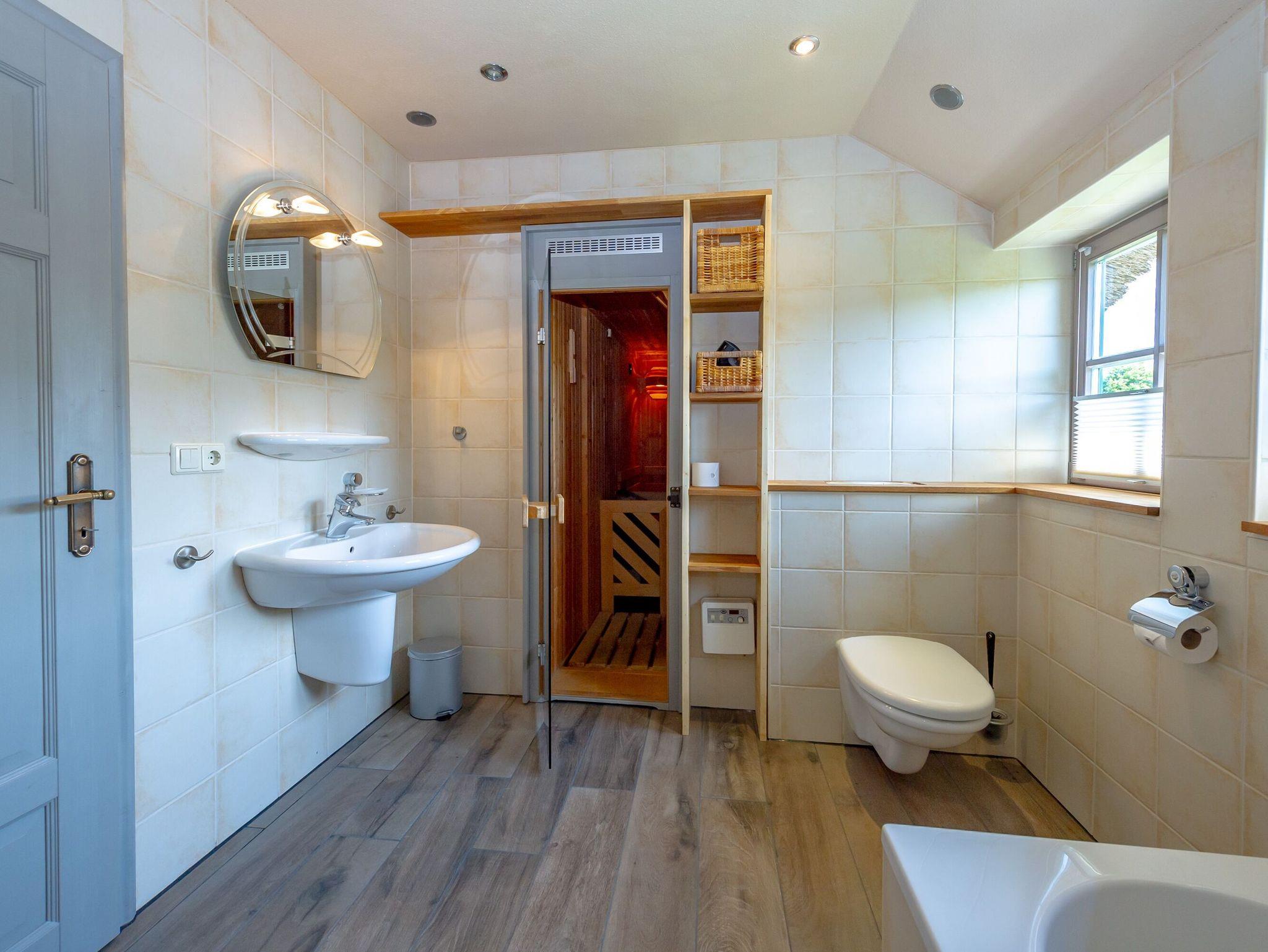 Im Obergeschoss warten die drei Schlafzimmer mit jeweils einem Doppelbett und genügend Stauraum für Ihre Urlaubsgarderobe auf Sie. Hier befindet sich auch das zweite Badezimmer mit Badewanne, Dusche und eigener Sauna.
