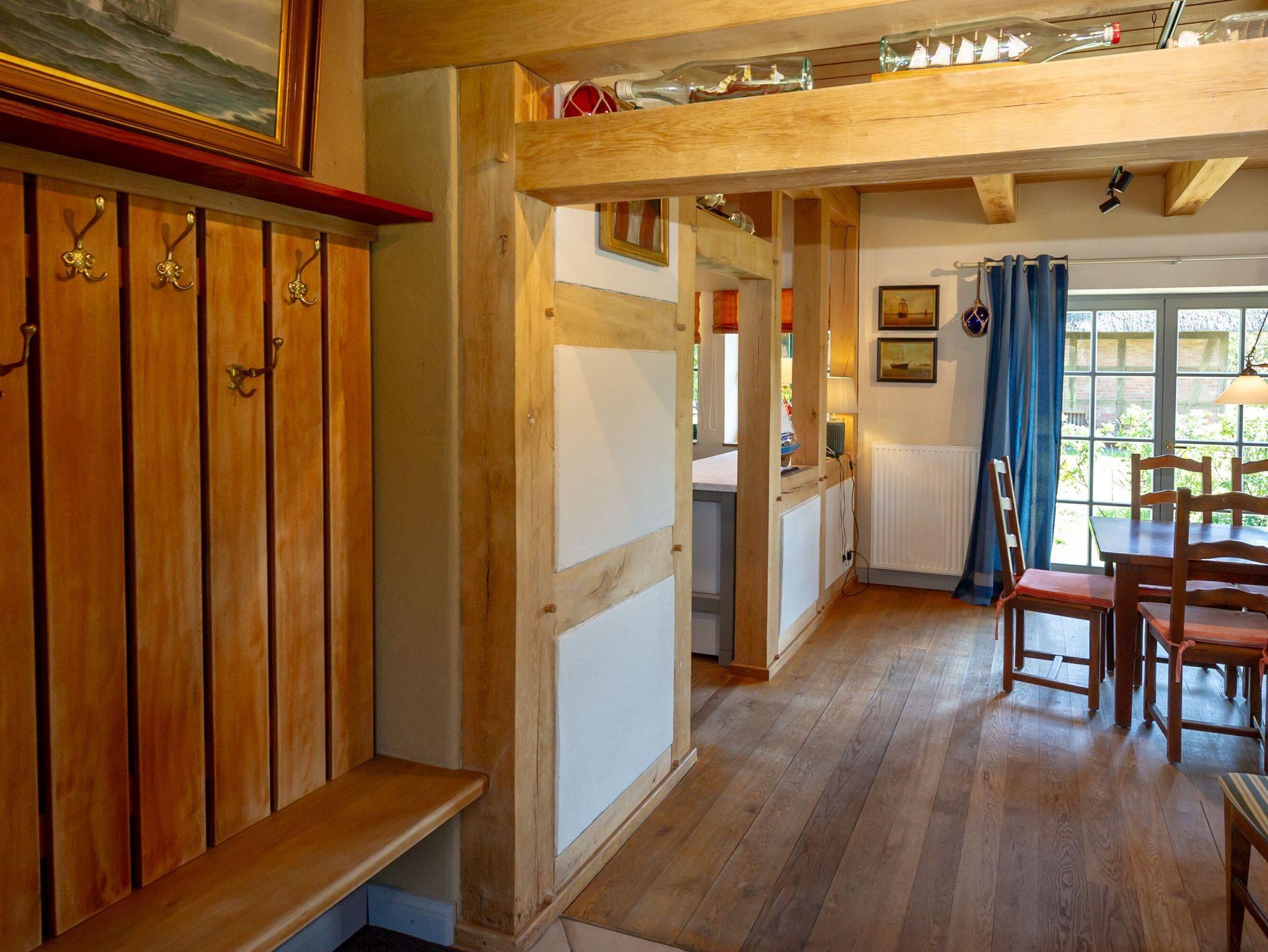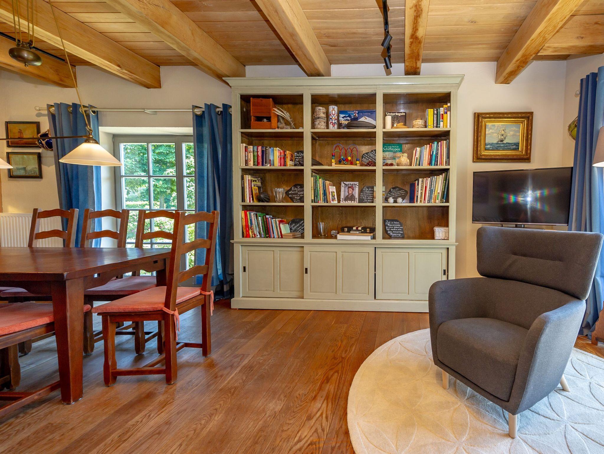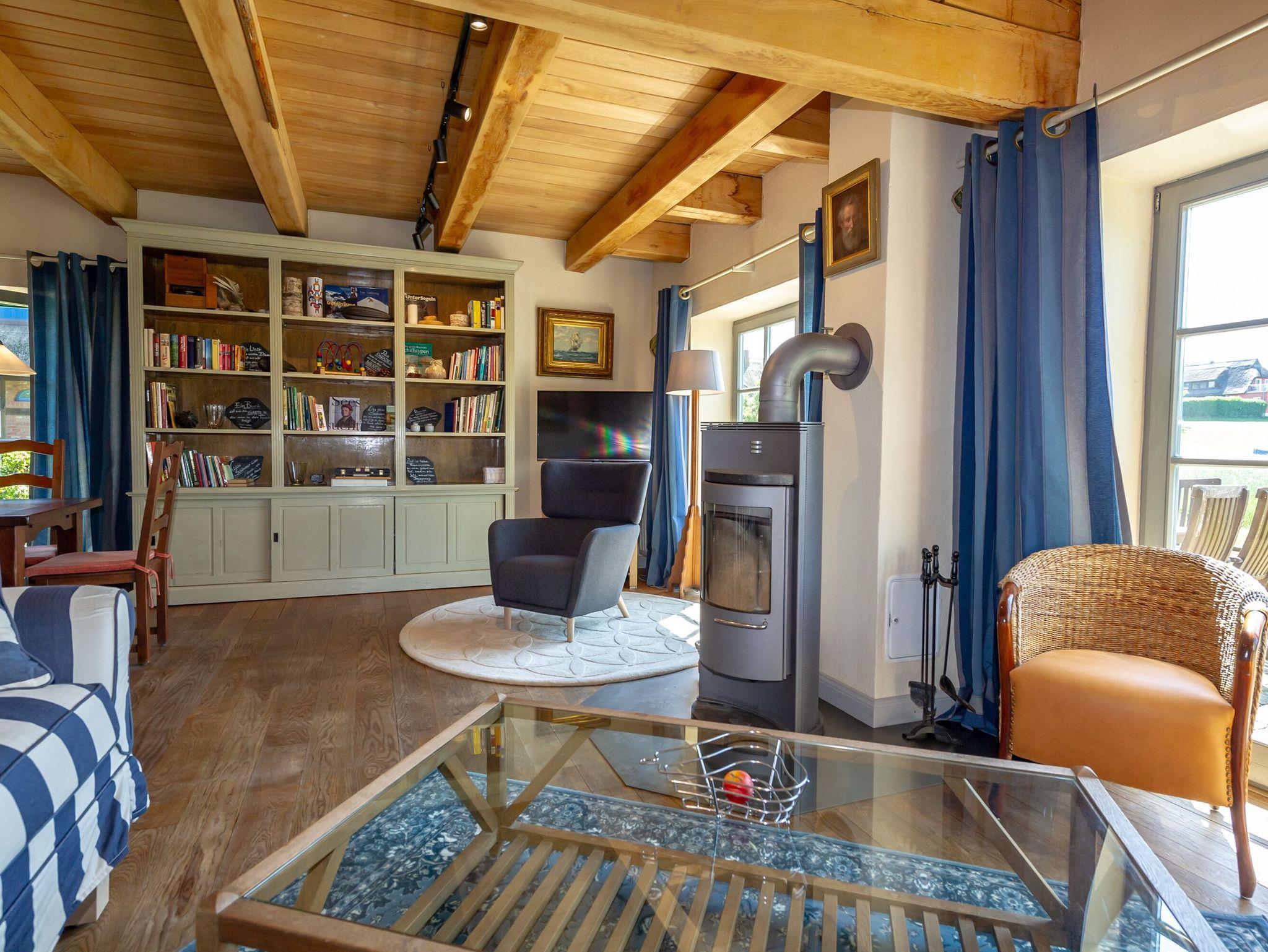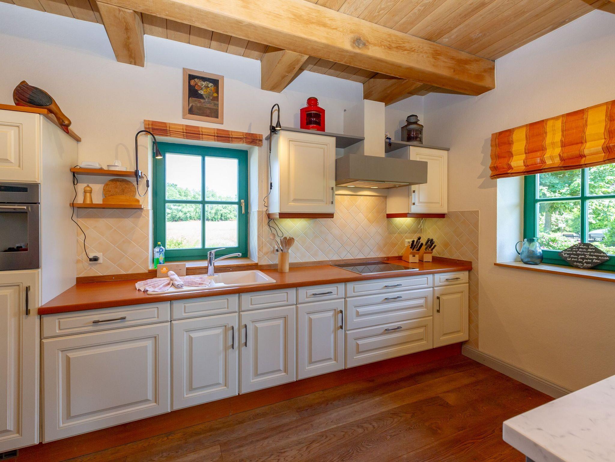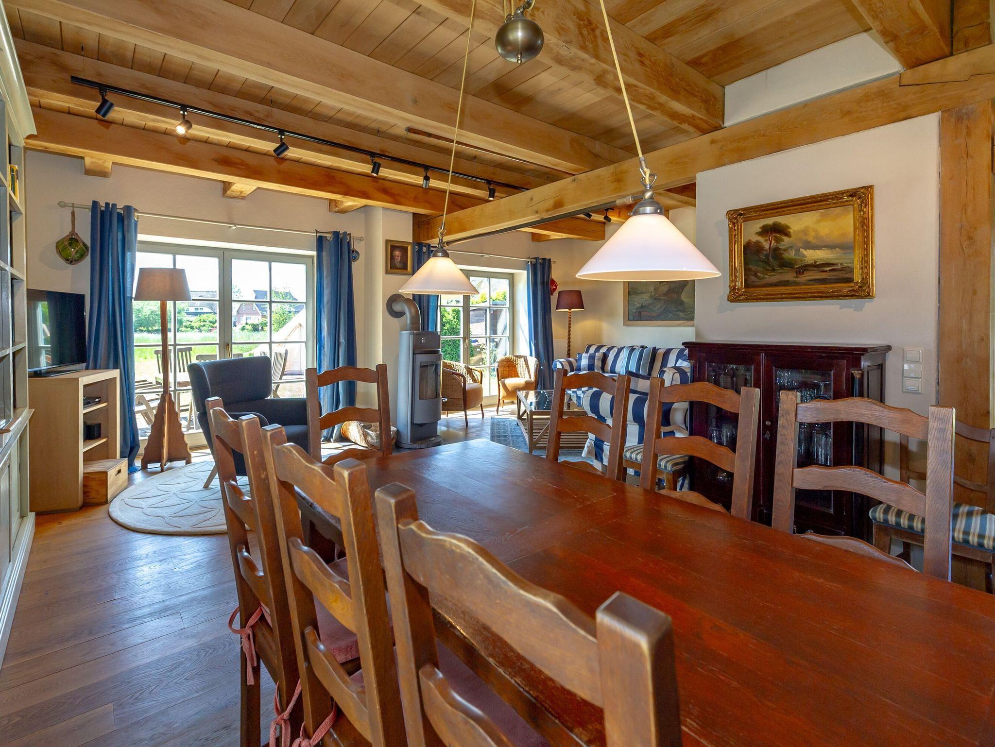 Dieses wunderschöne Ferienhaus bietet Ihnen auf zwei Etagen rund 110 m² Wohnfläche und ist hochwertig und komfortabel ausgestattet. Die beindruckenden Fachwerkbalken strahlen eine besonders gemütliche Atmosphäre aus. Im Erdgeschoss finden Sie den geräumigen Wohn- und Essbereich mit der offenen Küche vor. Ein großer Esstisch für 6 Personen, eine gemütliche Couchecke am Kaminofen sowie ein TV mit DVD-Player und Stereoanlage gehören zur Ausstattung.