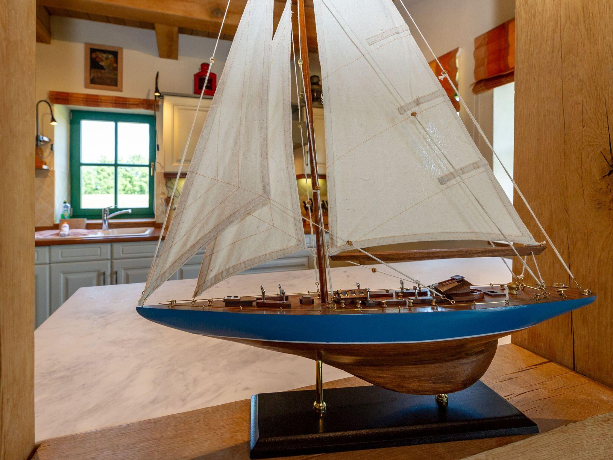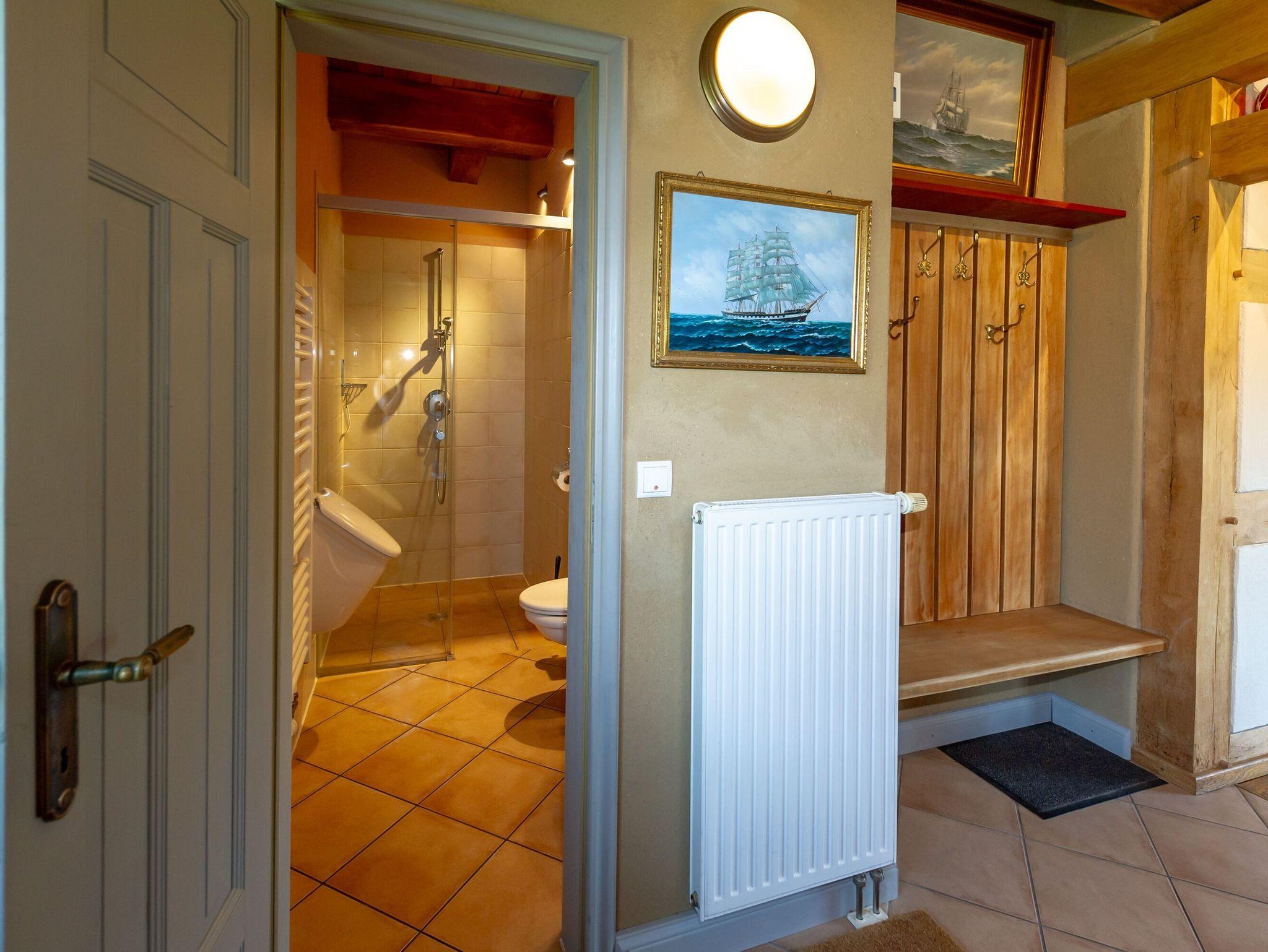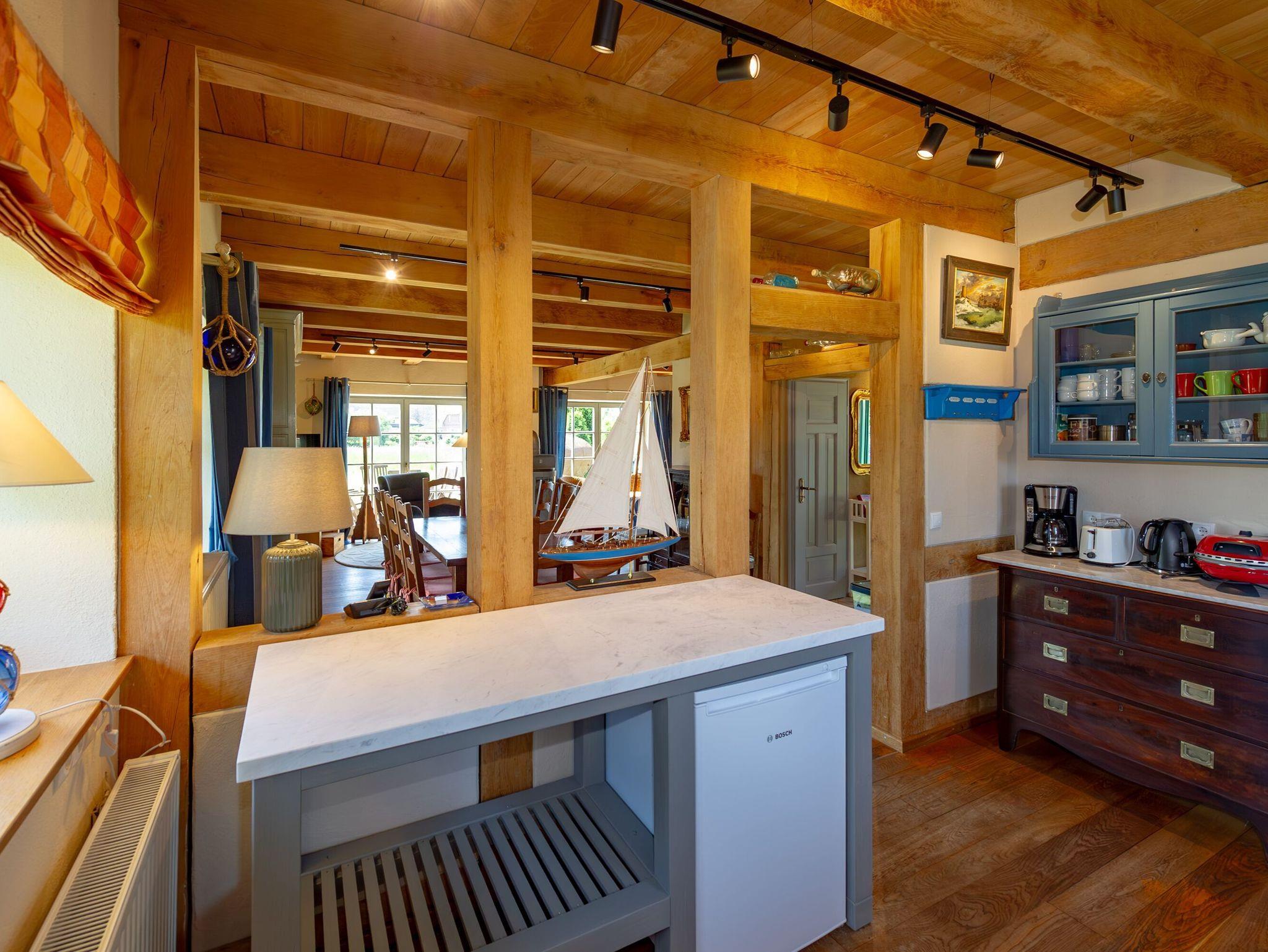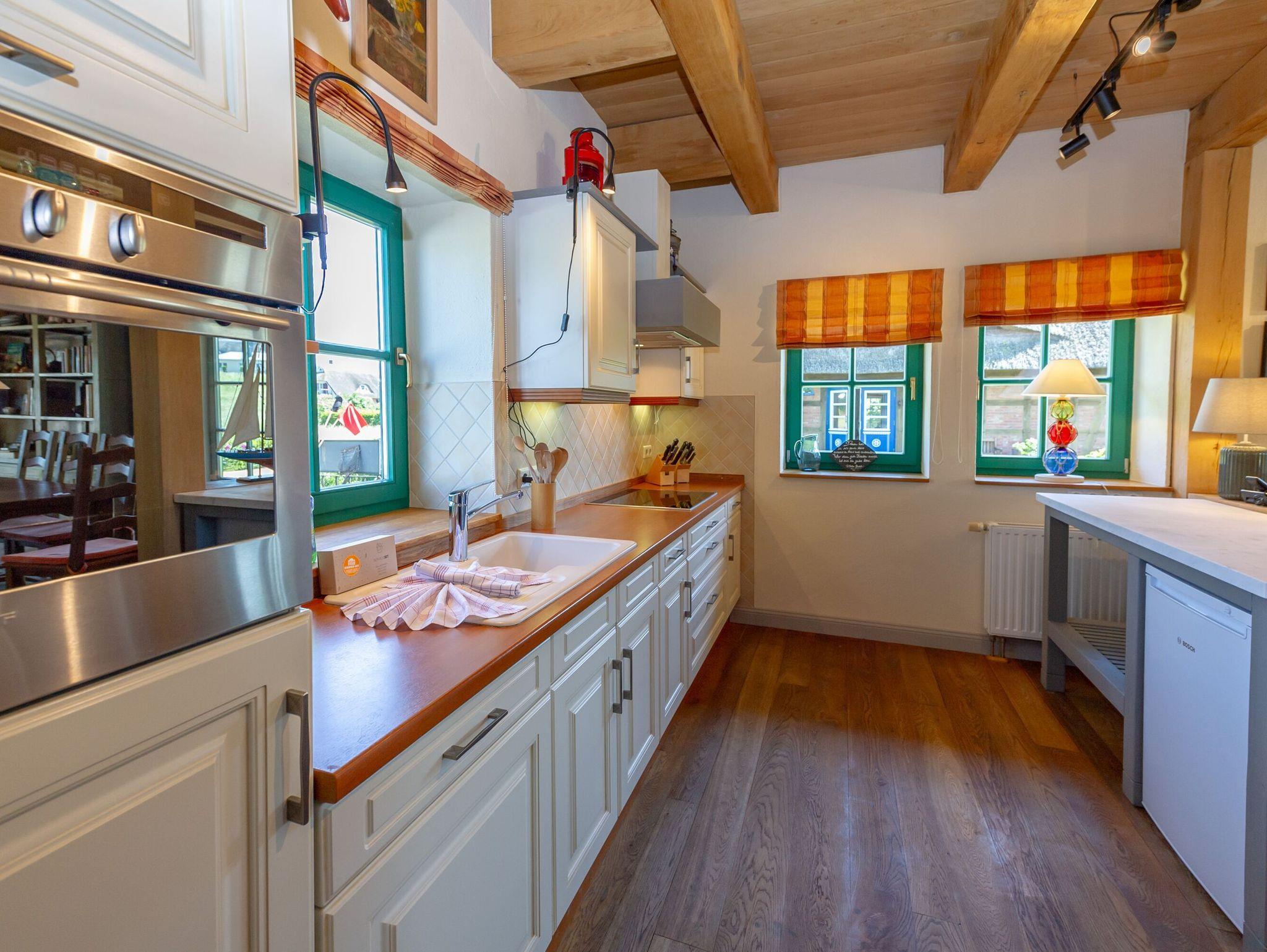 Die offene Küche verfügt über einen Backofen, einen Kühlschrank (ohne Gefrierfach), ein 4-Zonen-Cerankochfeld, einen Geschirrspüler, Wasserkocher, Kaffeemaschine, Toaster und diverses Kleininventar. Der nebenan befindliche Abstellraum beinhaltet eine Waschmaschine, einen Trockner, Bügelutensilien und eine Mikrowelle. Im Erdgeschoss gibt es außerdem ein Bad mit Dusche und WC unter offenen Holzbalken.