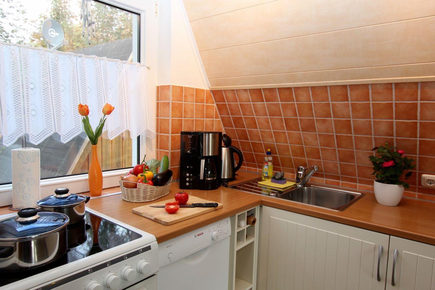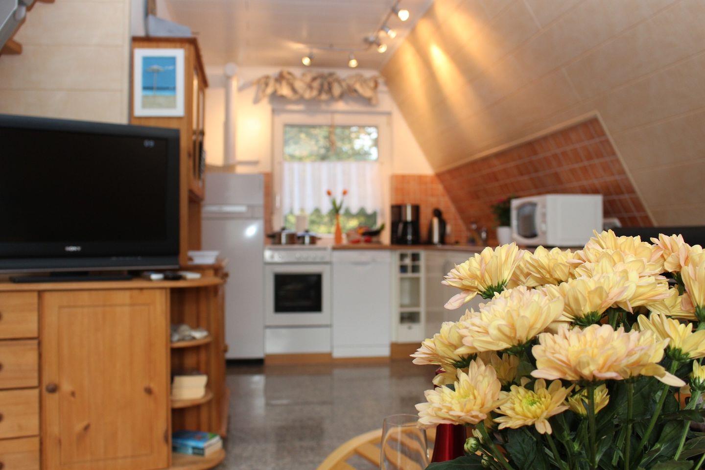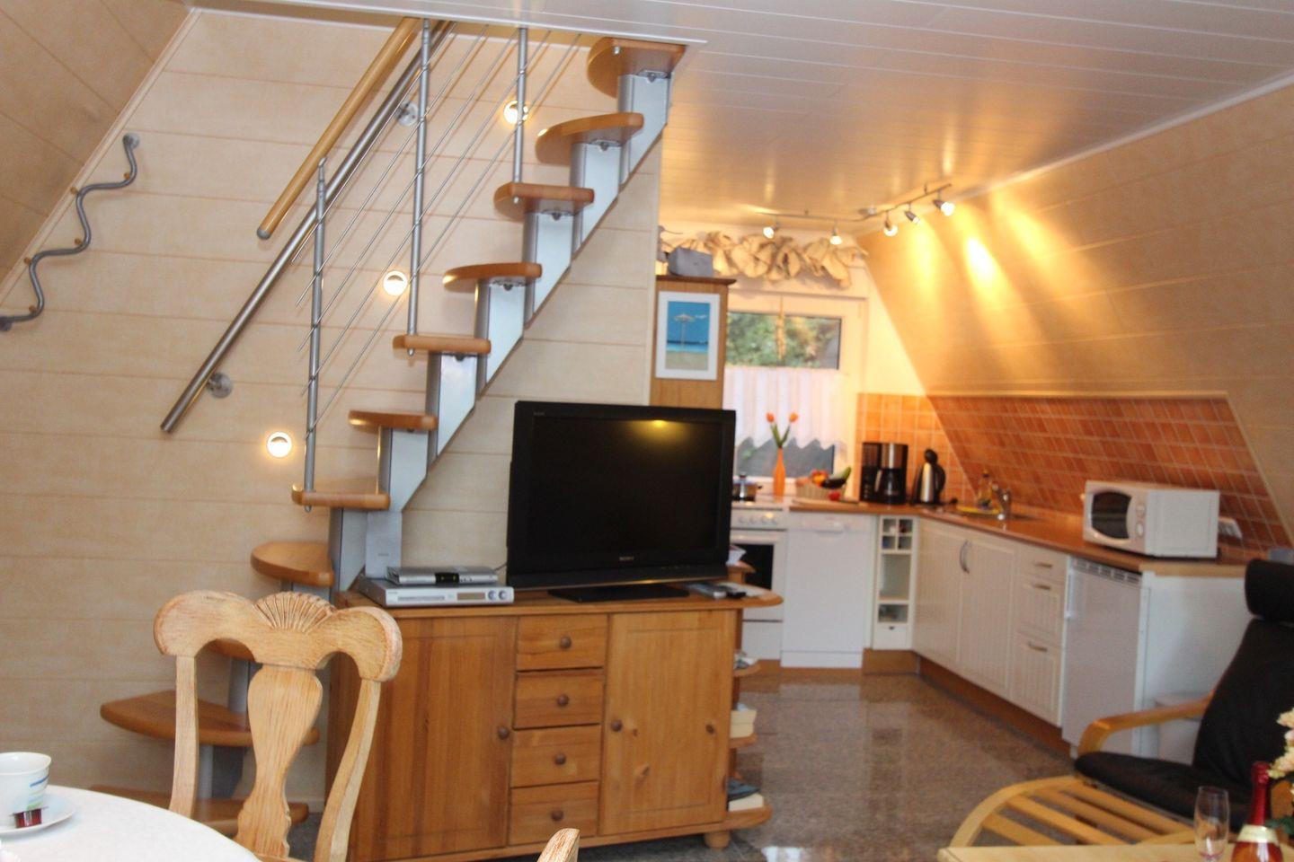 Im Erdgeschoss verfügt sie über einen Wohn-Essbereich mit offener Küche und ein Duschbad mit Waschmaschine. Die Küche verfügt über einen Herd mit Cerankochfeld und Backofen, einen Kühlschrank mit Gefrierfach sowie Geschirrspüler, Mikrowelle, Wasserkocher, Kaffeemaschine, Toaster und diverse Küchenutensilien. Zur Unterhaltung nutzen Sie einen Flachbild-TV und einen Blu-ray Player mit CD/Radio-Funktion.