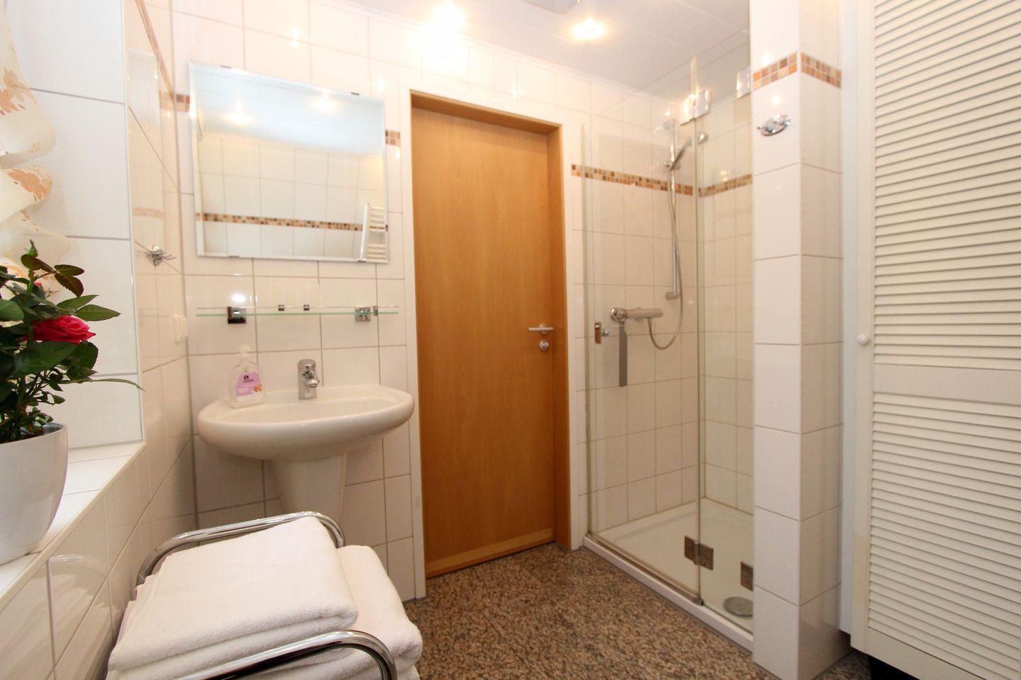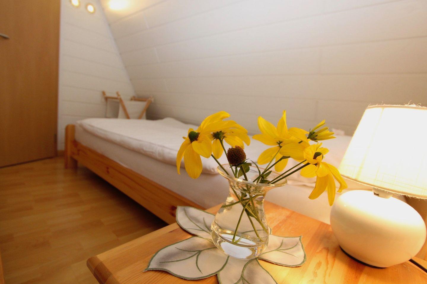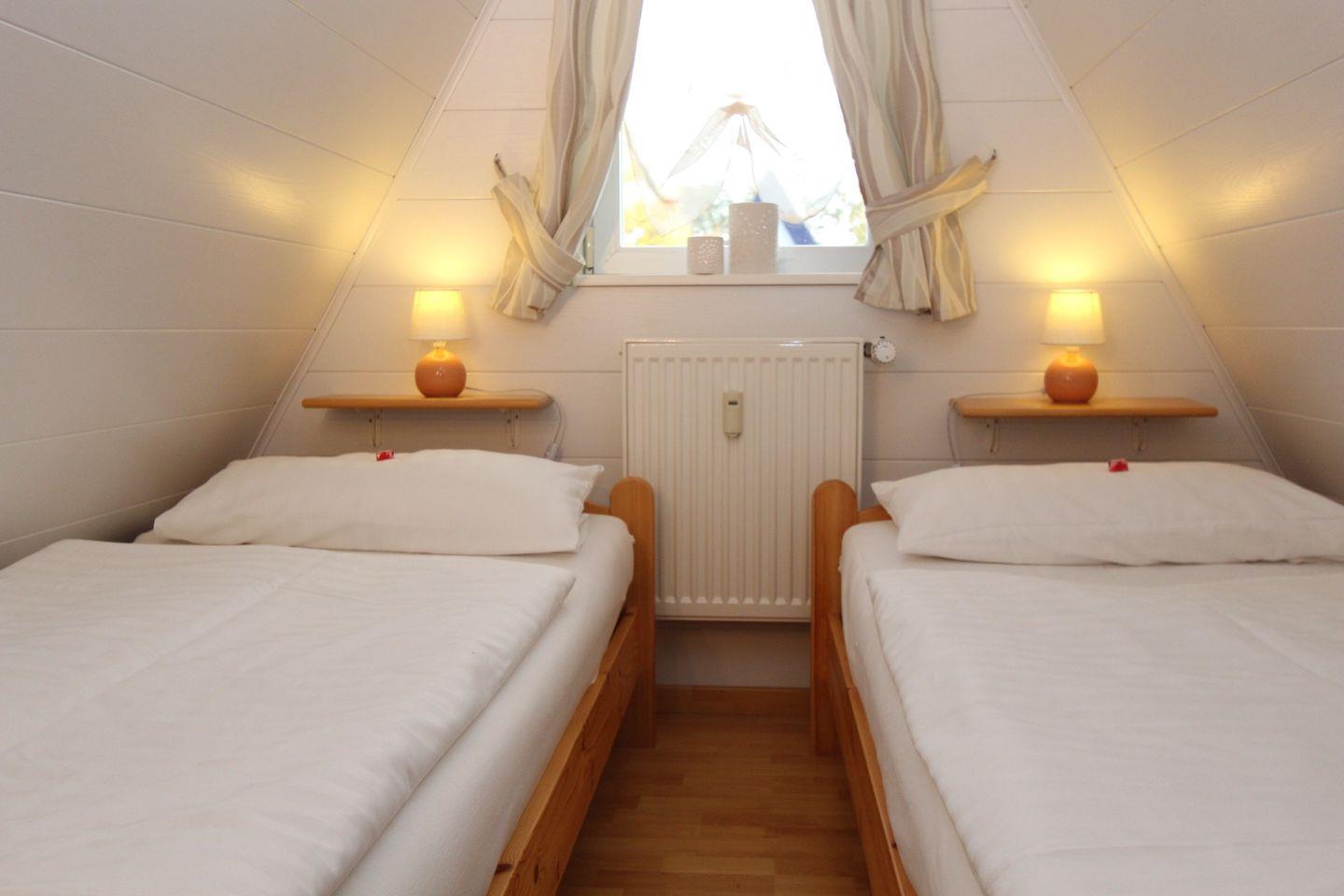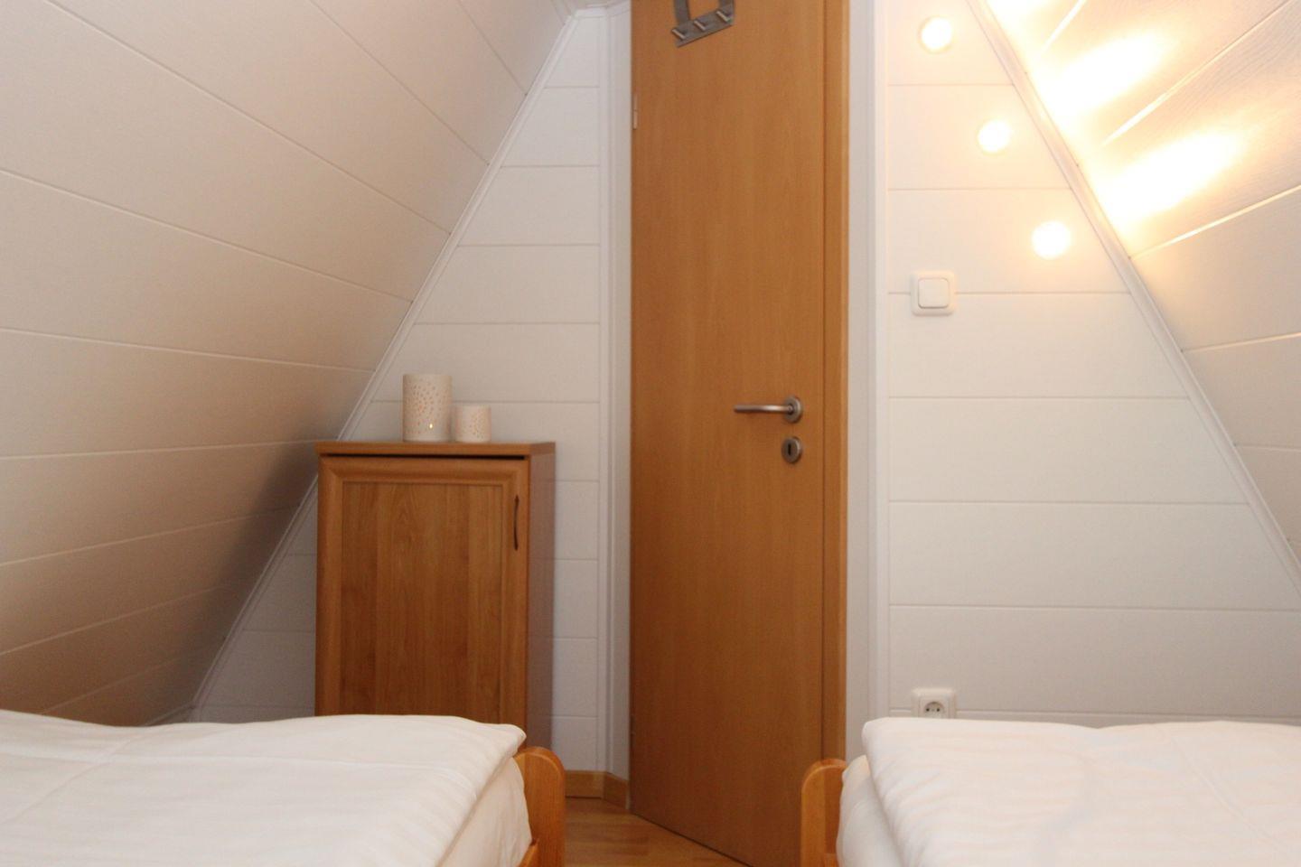 Über eine schmale Treppe gelangen Sie in den Schlafbereich im 1. OG. Hier befinden sich 2 Schlafzimmer mit Dachschrägen und je 2 Einzelbetten.