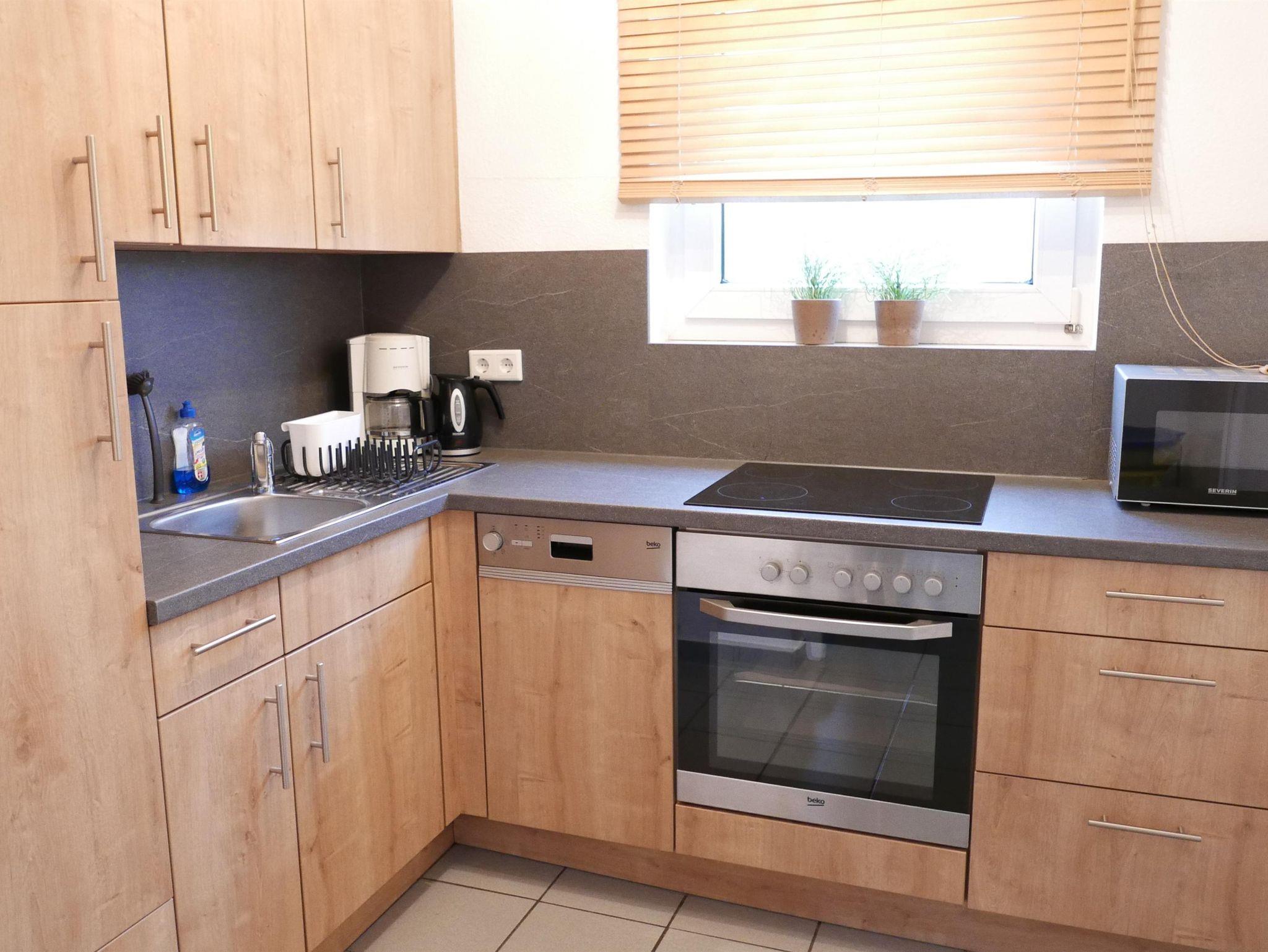 • Küche mit Elektroherd, Kühlschrank und Geschirrspüler, sowie einer Grundausstattung an Kochgeschirr und Besteck. Von der Küche abgehend eine Abstellkammer mit Waschmaschine.