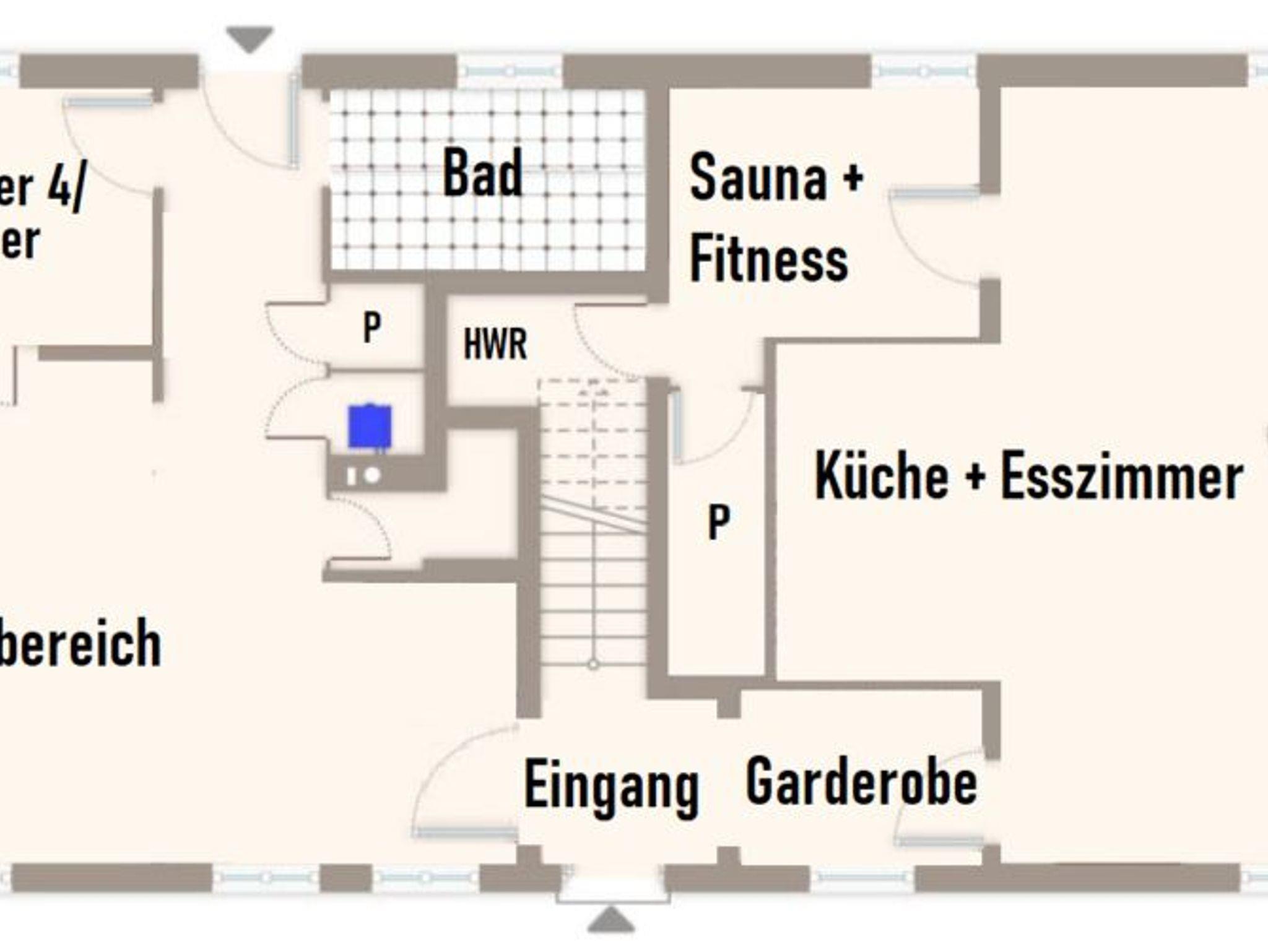 Sauna/Fitnessraum: 4 Personen Infrarotsauna, Ergometer, Hantelbank, Boxsack, Klimmzugstange.