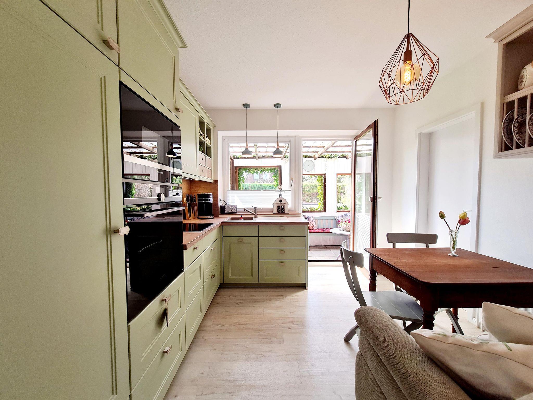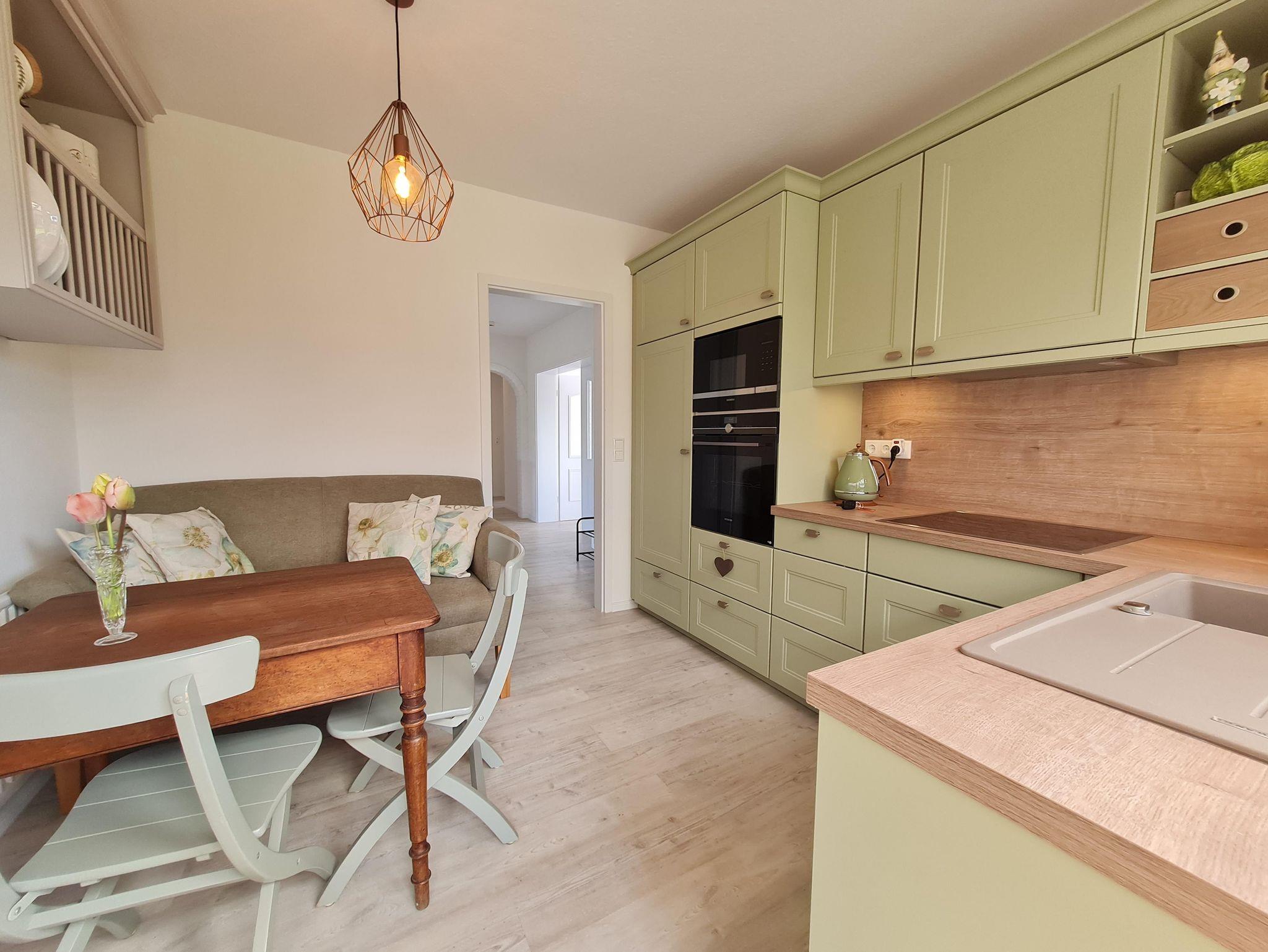 • Komplette ausgestattete Küche im Landhausstil mit Backofen und Dampfgarerfunktion, Mikrowelle, Ceran-Feld, Geschirrspüler und Sitzgruppe mit gemütlicher Sitzbank, Speisekammer