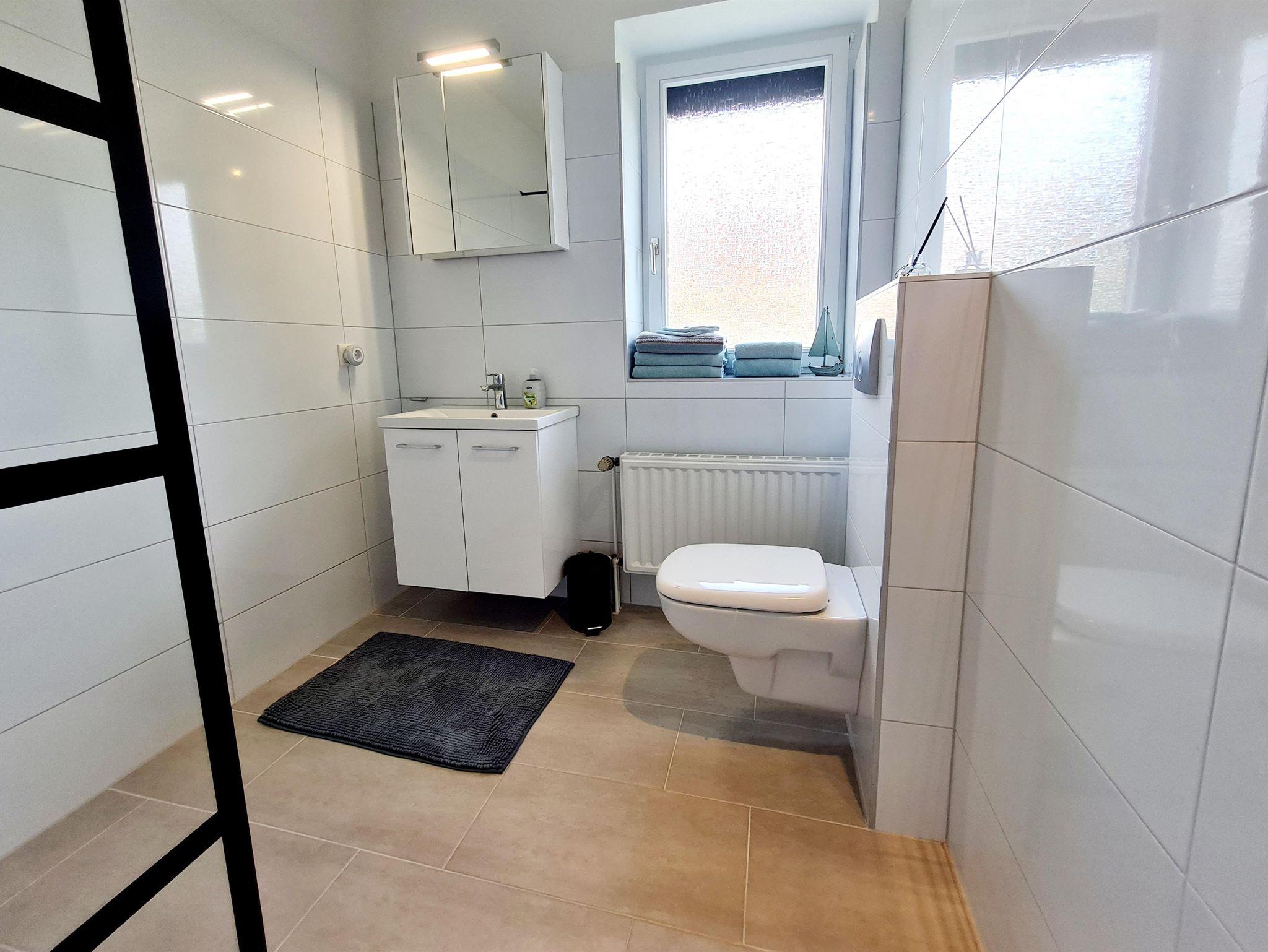 • Modernes Tageslichtbad mit Duschbad, ebenerdiger Dusche und Fußbodenheizung
