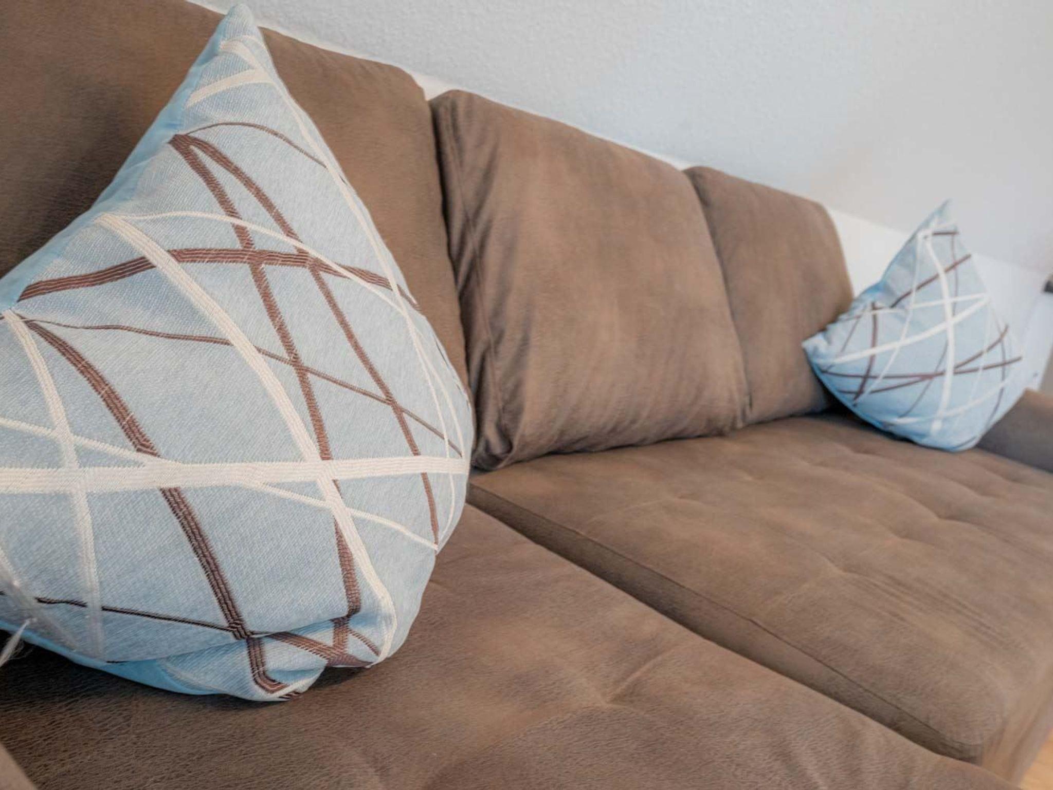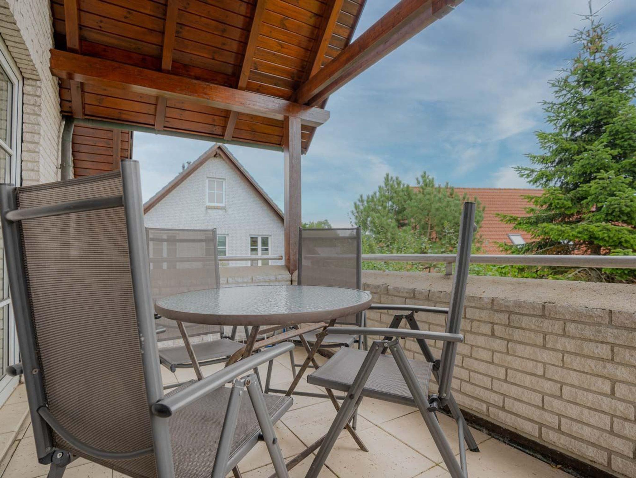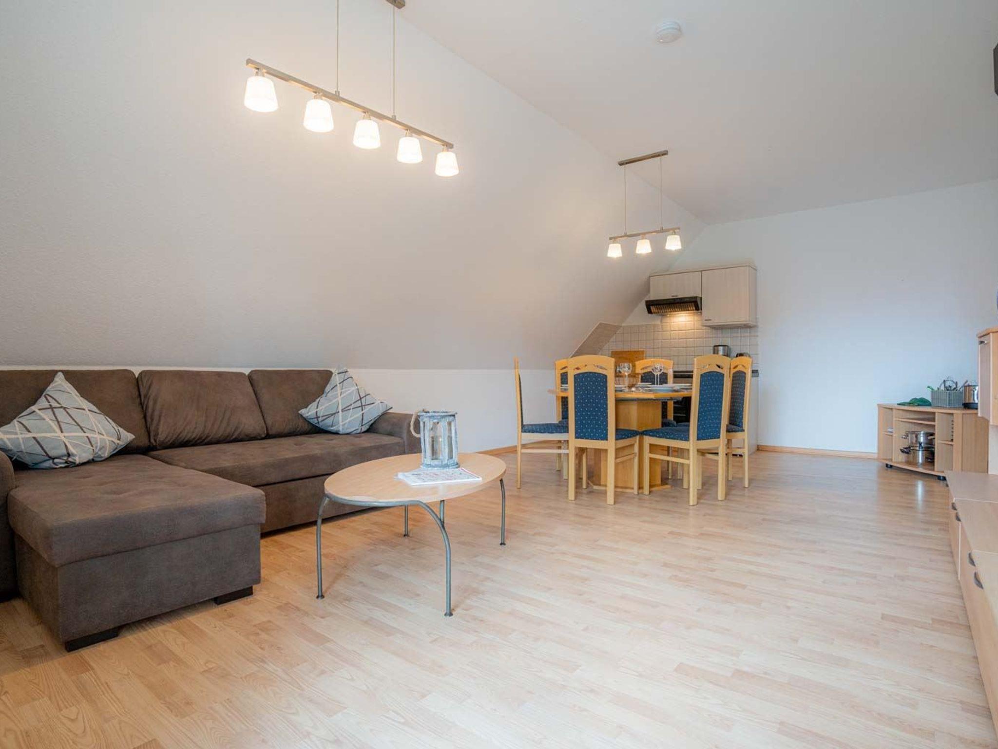 Wohnzimmer mit einem ausziehbaren Schlafsofa (150x200cm), 2 Sesseln, SMART-TV (Sat), Bluetooth-Soundbar, Stereo-Kompaktanlage und Esstisch mit 6 Stühlen. Direkter Zugang zum möblierten, überdachten Balkon nach Südosten. Offene Küche mit Backofen, Geschirrspüler und Kühlschrank mit Gefrierfach.