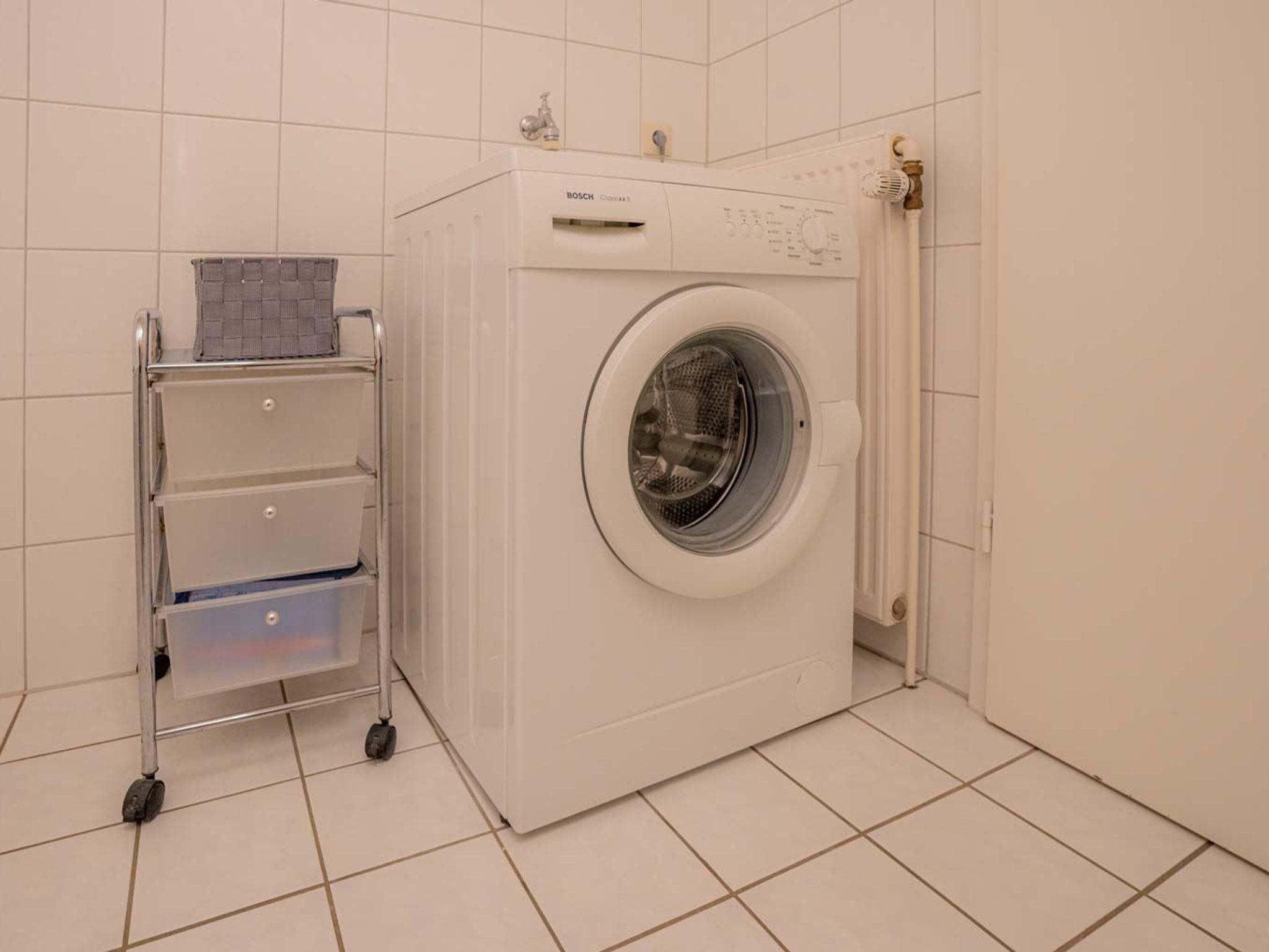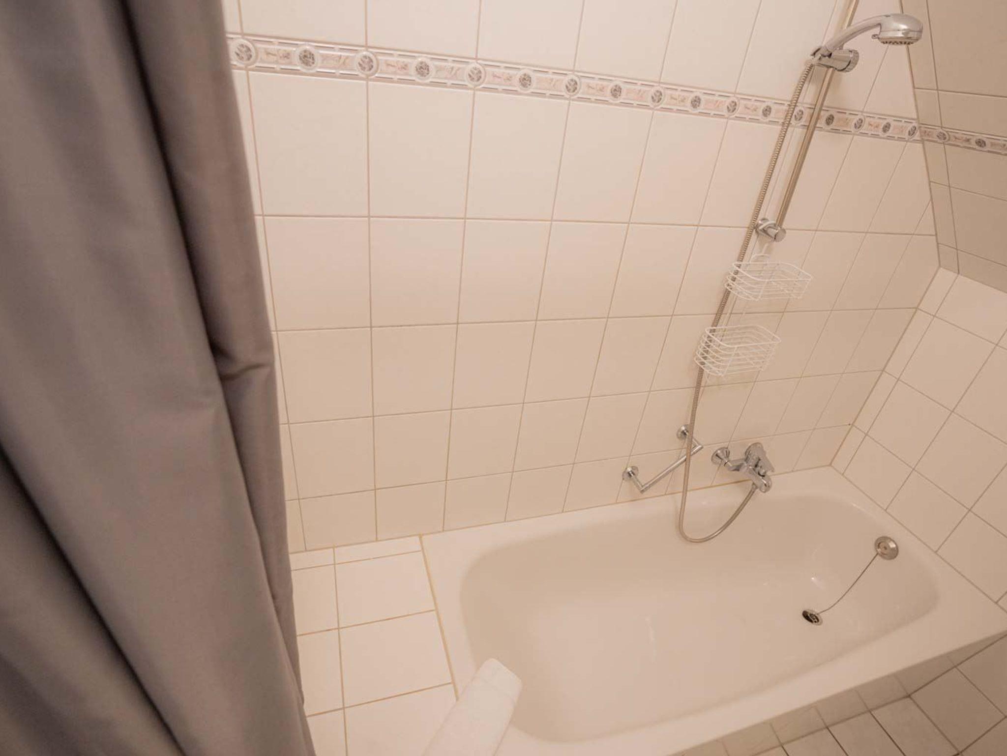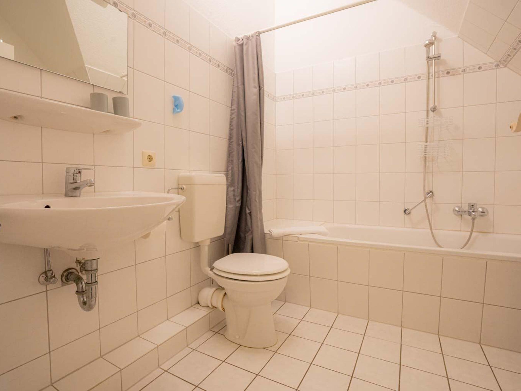 Badezimmer (Vollbad) mit Badewanne mit Duschhandstück, WC, Föhn und Waschmaschine.