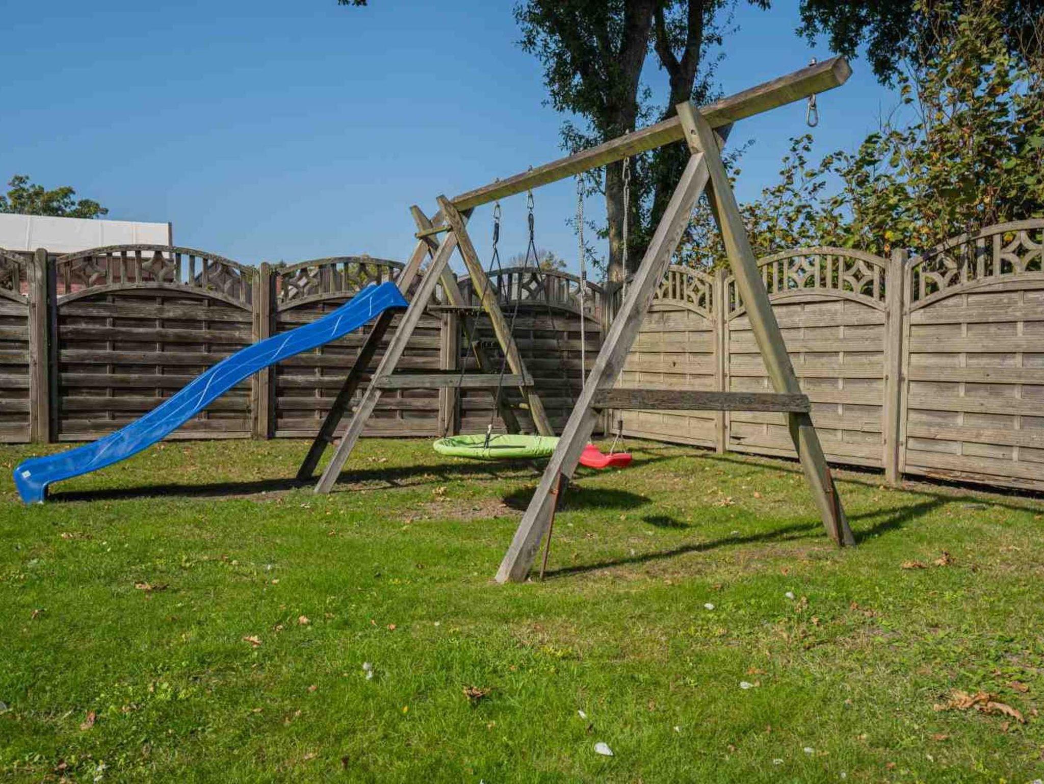 Großer gemeinschaftlicher Gartenteil mit überdachtem Grill-Bereich und Kinderspielgeräten. Der Bereich ist eingezäunt.