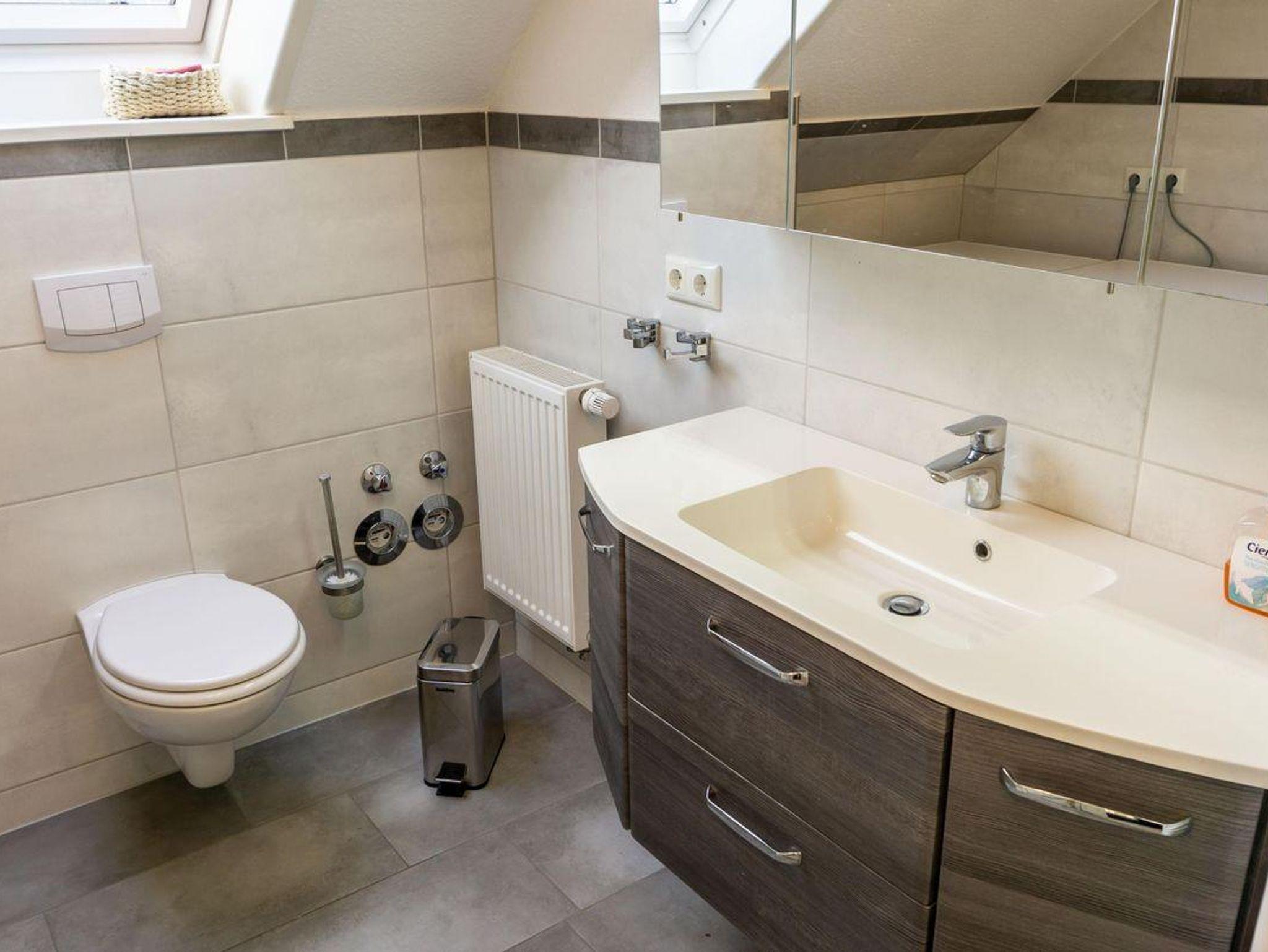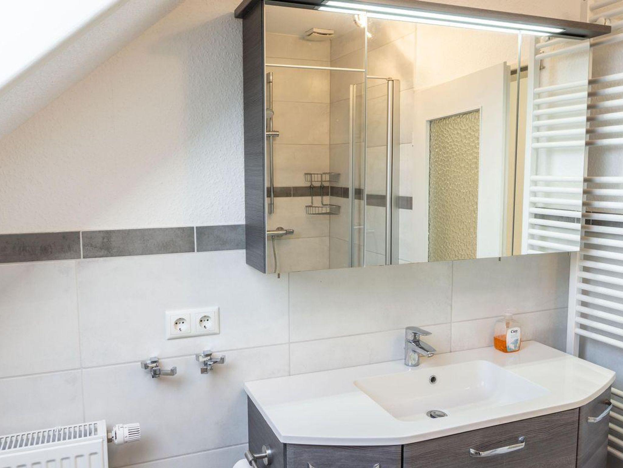 Das Badezimmer ist modern gestaltet und bietet eine bodengleiche Dusche, ein WC, ein Waschbecken, einen großen Spiegel sowie einen separaten Kosmetikspiegel. Praktische Ausstattungen wie Haartrockner und ein Fenster für Tageslicht runden den Komfort ab.