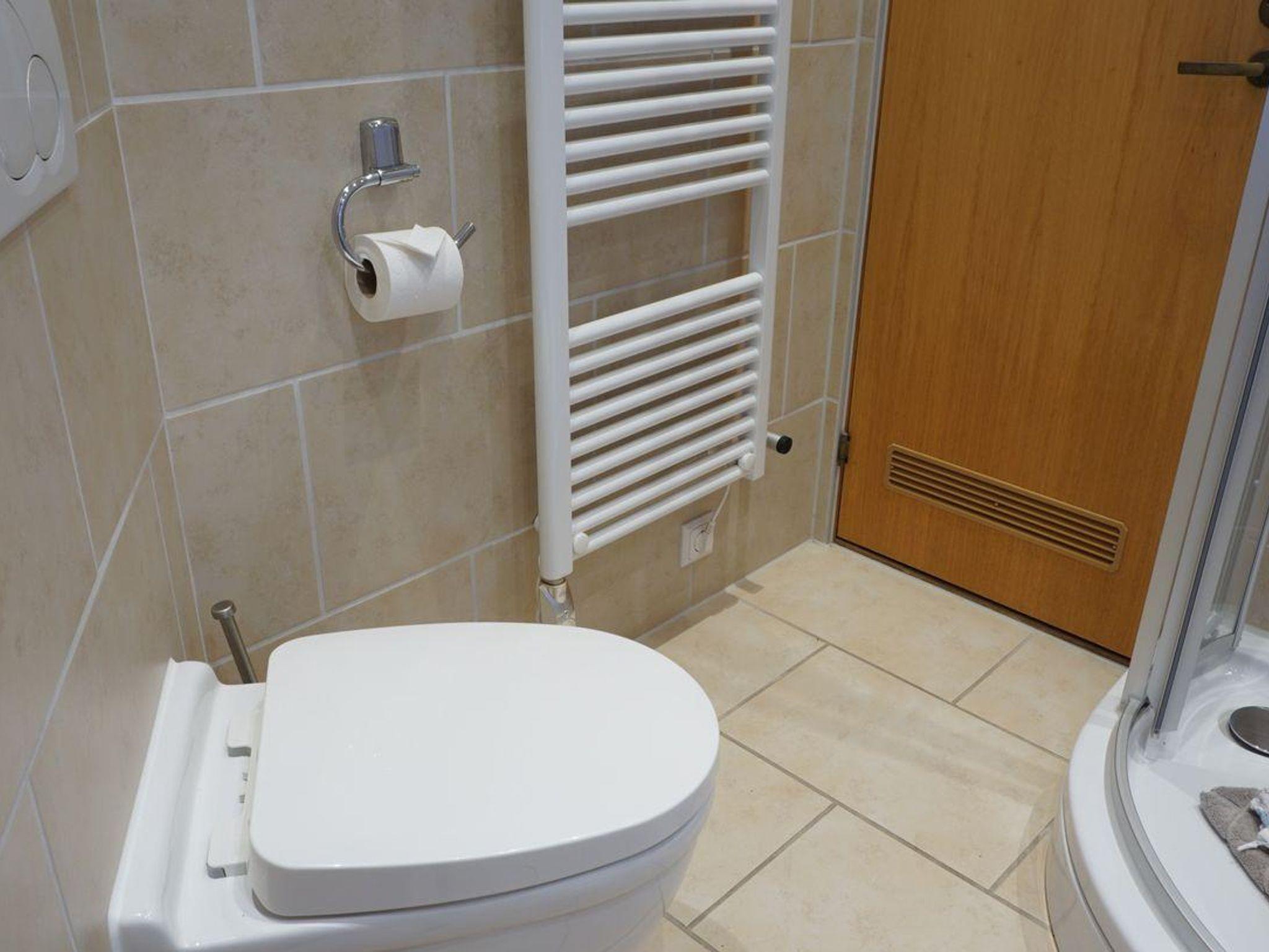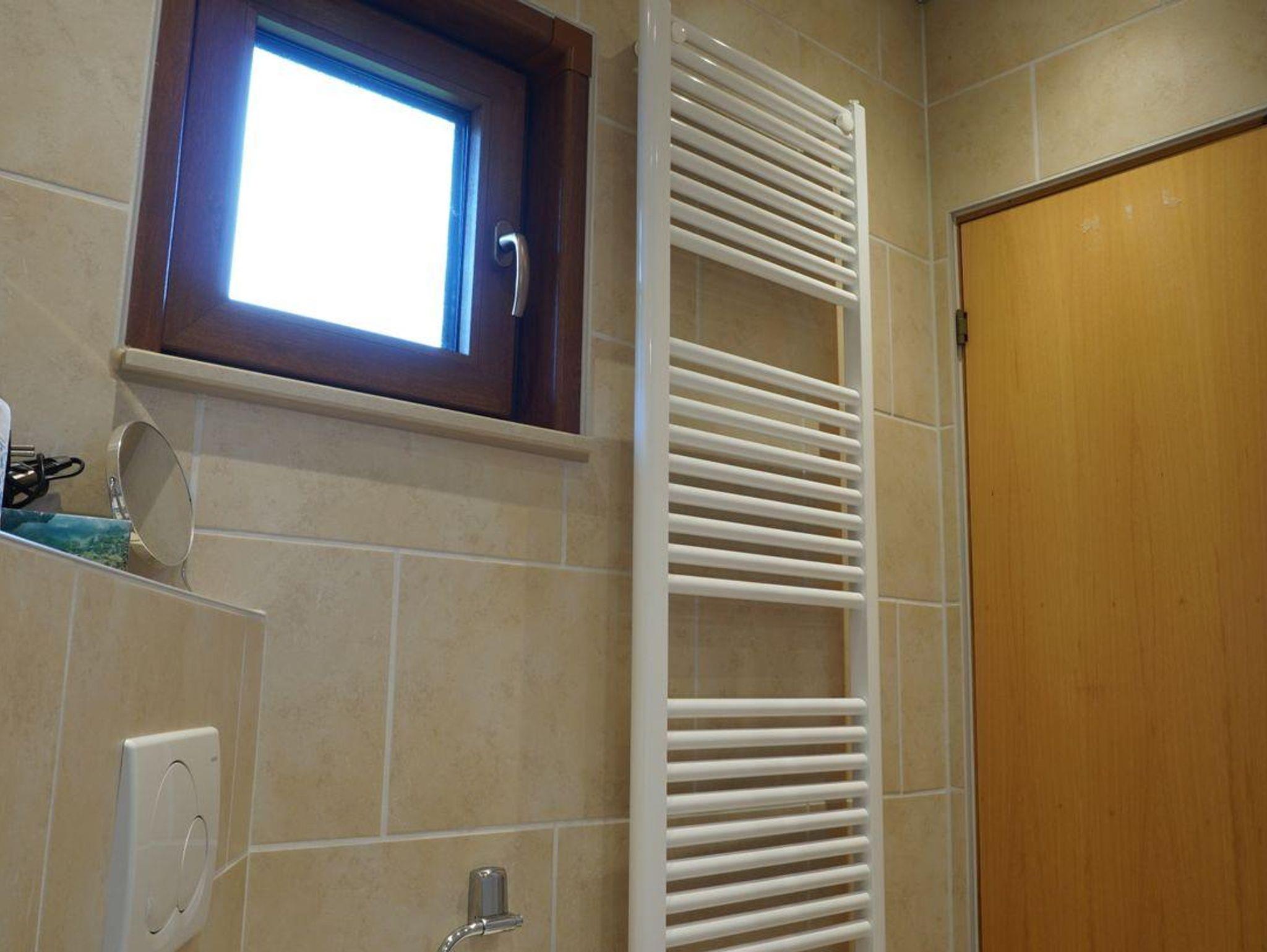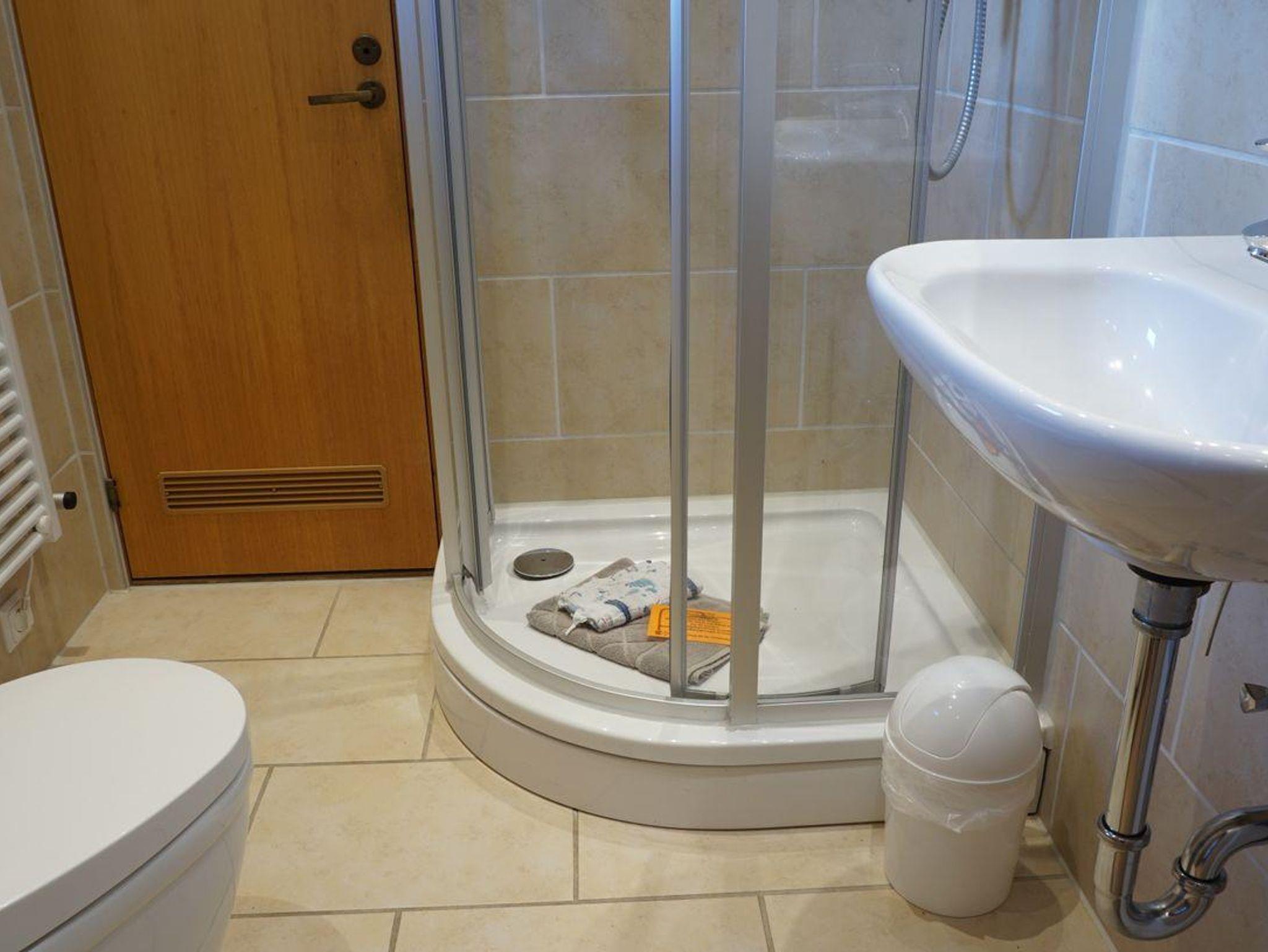 Das Duschbad ist mit einem Waschbecken, Wc, Spiegel und einem Fön ausgestattet.