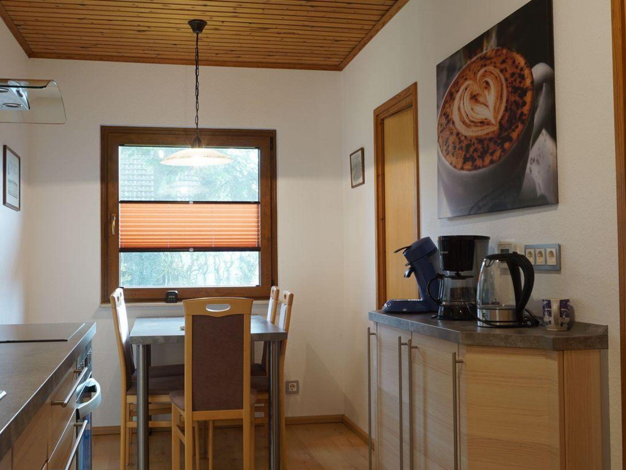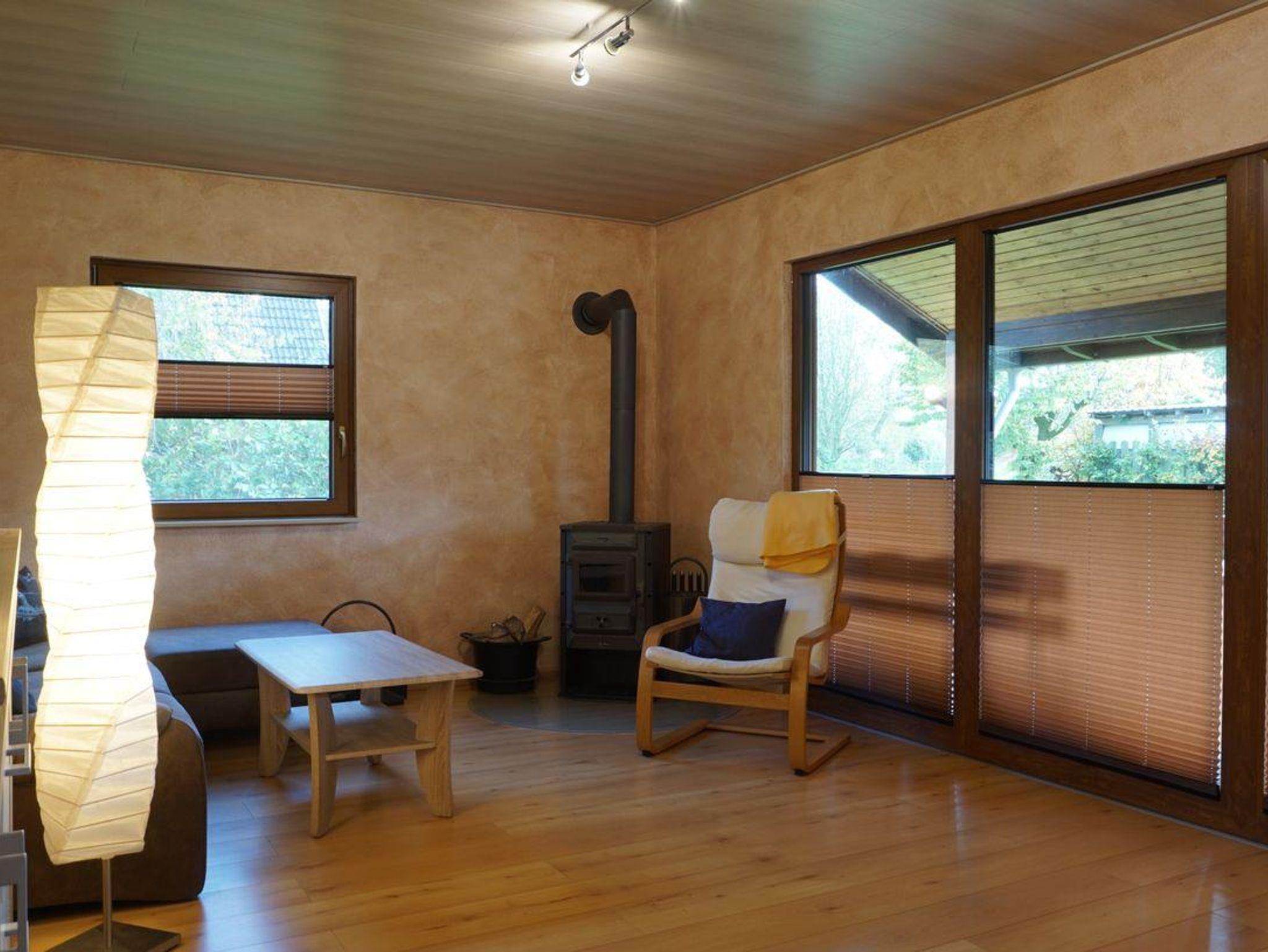 Im offenen Wohnbereich lädt eine gemütliche Sofaecke mit TV zum Entspannen ein. Ein Kaminofen sorgt für wohlige Wärme an kühleren Tagen. Für diejenigen, die auch im Urlaub arbeiten müssen, steht ein Schreibtisch mit Internetzugang bereit. Die offene Küche ist komplett ausgestattet mit Kühlschrank, Gefrierfach, Ceranfeld, Backofen, Geschirrspülmaschine, Kaffeefiltermaschine, Mikrowelle, Wasserkocher und Toaster. Am kleinen Esstisch in der Küche können Sie Ihre Mahlzeiten genießen.