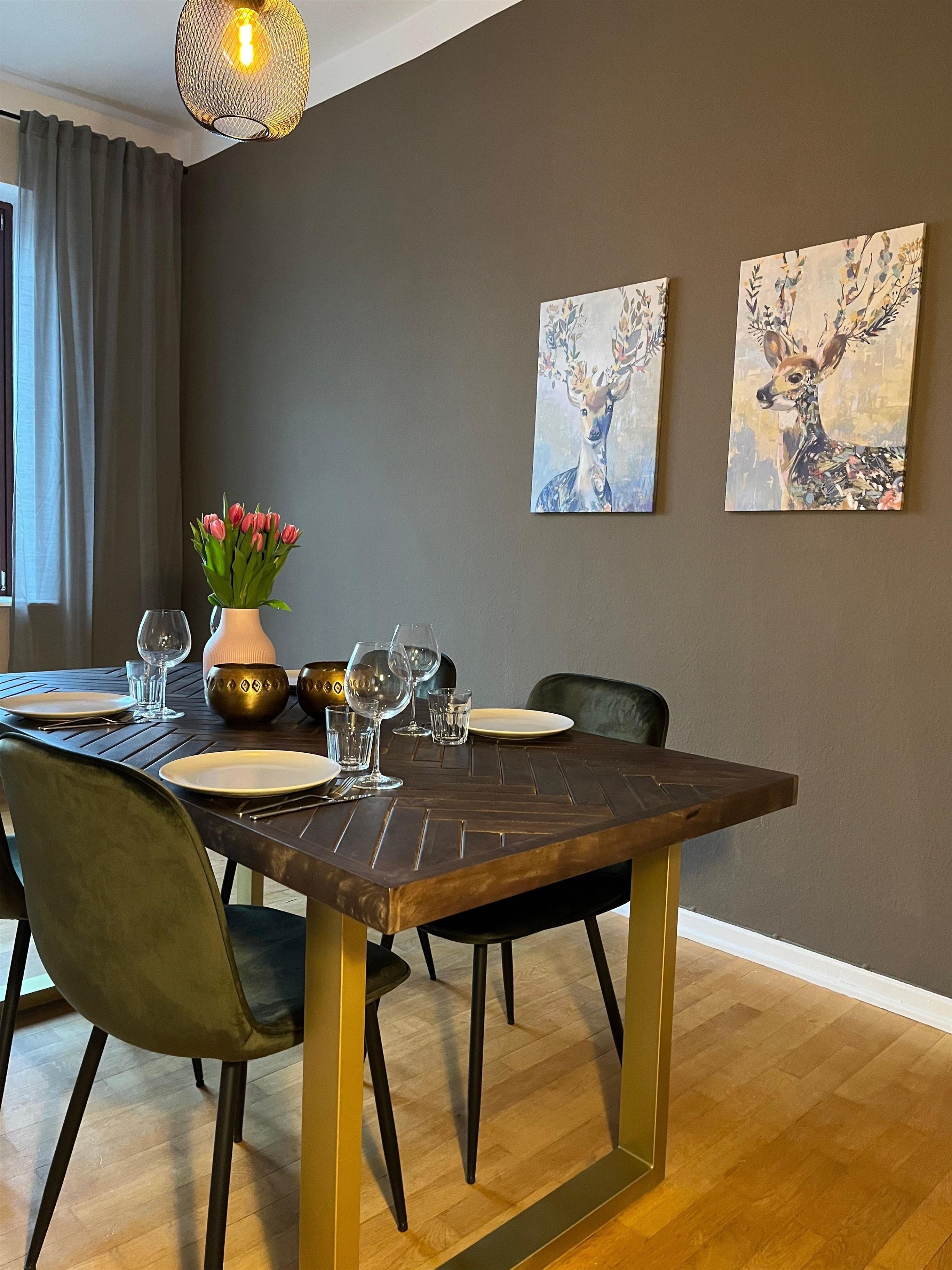 Hanna´s Place bietet auf 127 qm jede Menge Raum, um sich wohl zu fühlen. Ob mit der Familie oder den Freunden kannst Du es Dir hier gut gehen lassen. Zwei Schlafzimmer, ein Bad mit Dusche und Badewanne sowie eine weitere Toilette, eine Küche sowie das Ess- und Wohnzimmer stehen zur Verfügung. Darüber hinaus gehört zum Appartment eine großzügige Terrasse, die sowohl Morgens als Abends in der Sonne liegt. Die Wohnung ist großzügig und gemütlich. Die warmen Farben sorgen sofort für Wohlfühlstimmung. In der vollausgestatteten Küche macht Kochen Spaß. Kühlschrank, Backofen, Herd, Kaffeemaschine und Wasserkocher sind vorhanden. Ebenso werden Bettwäsche, Handtücher und Küchentücher für den Aufenthalt zur Verfügung gestellt. Die Wohnung teilt sich auf in ein großes Wohnzimmer mit Fernsehen, ein separates Esszimmer, eine Küche mit Sitzmöglichkeit, eine großer Balkon mit Sitzmöbeln, ein Schlafzimmer mit einem Doppelbett, einem weiteren Schlafzimmer mit zwei Einzelbetten, ein Bad mit Dusche und Badewanne sowie eine weitere separate Toilette. In großen Einbauschränken gibt es jede Menge Platz für Gepäck und Kleidung. WLAN ist vorhanden. Im Erdgeschoss des Hauses befindet sich ein Fitness Studio, dass von den Gästen der Wohnung kostenfrei genutzt werden kann.