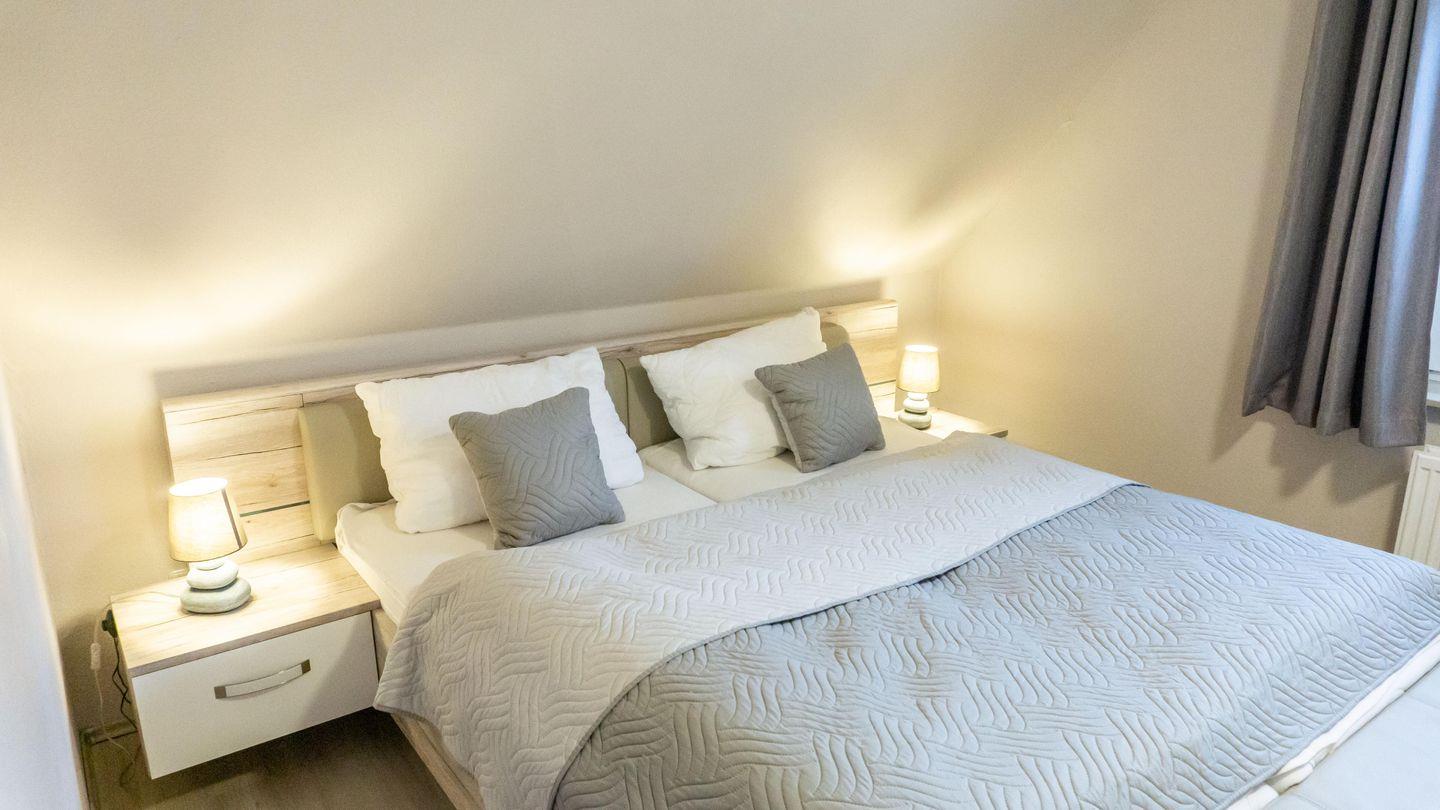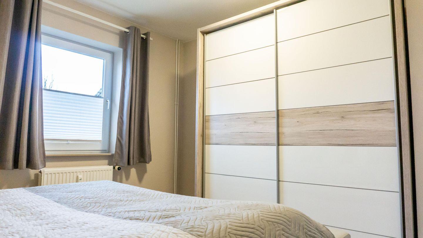 Schlafzimmer mit Doppelbett (180 x 200 cm) und Kleiderschrank.