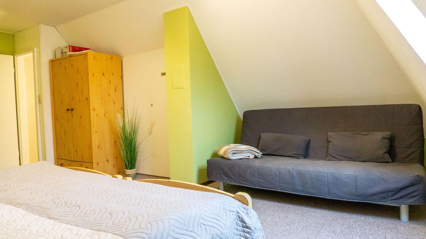 Schlafzimmer mit zwei Einzelbetten (zum Doppelbett zusammengestellt) und Schlafsofa.