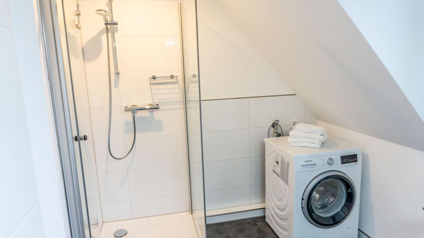 Duschbad mit ebenerdiger Dusche, Waschbecken, WC und Waschmaschine.