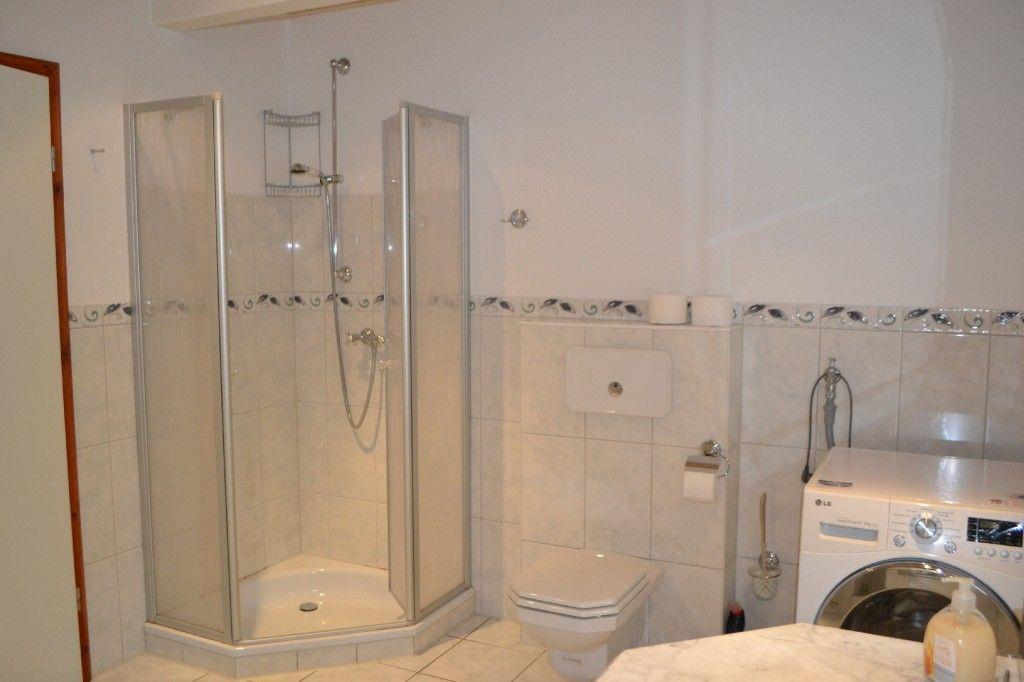 Badezimmer mit Dusche und Badewanne, Föhn, Waschmaschine, Wäscheständer