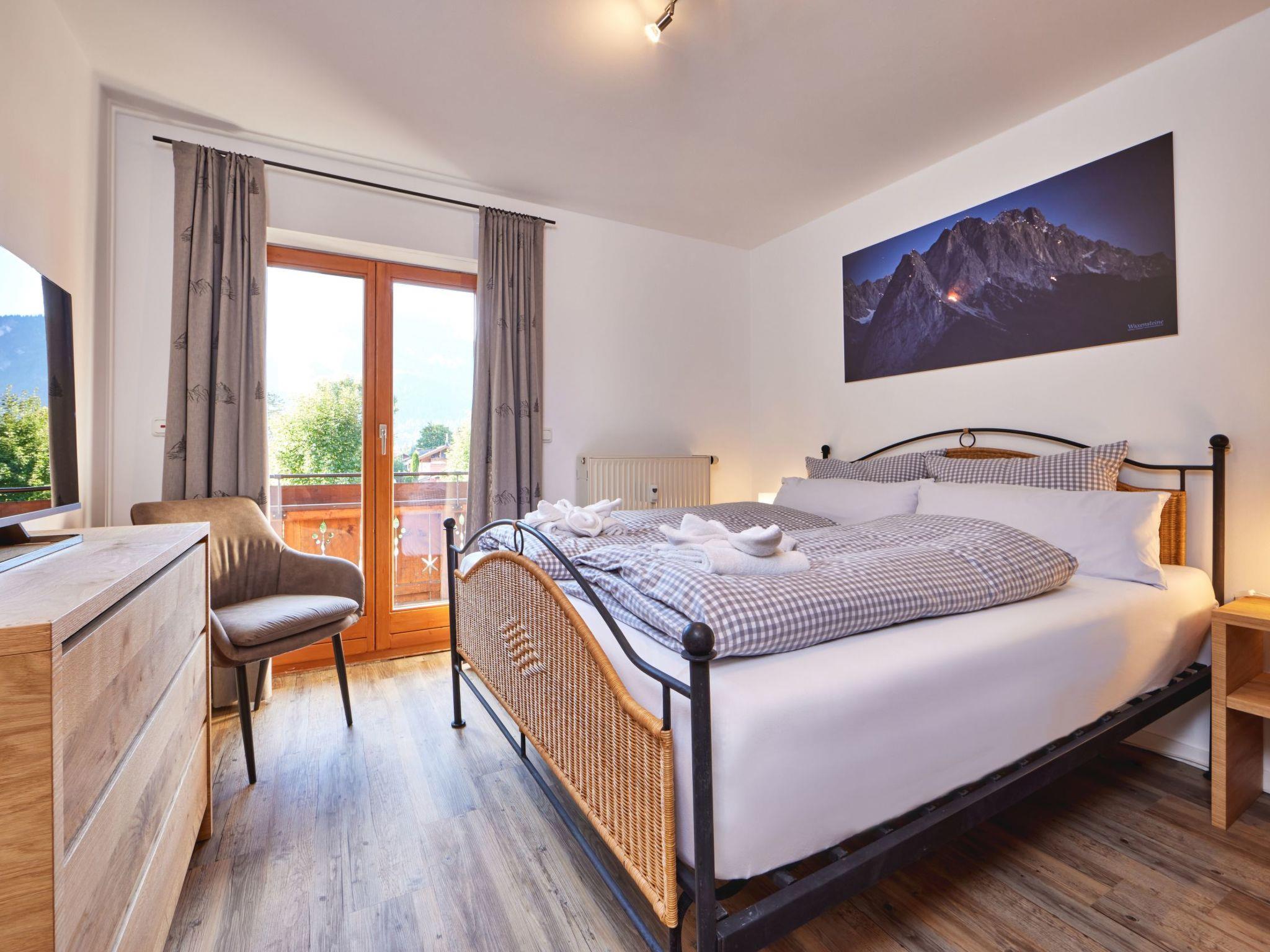 The large, fully covered balcony accessible from the living-dining area offers a panoramic view over the meadows along the southern outskirts and the Werdenfelser and Tyrolean mountains.