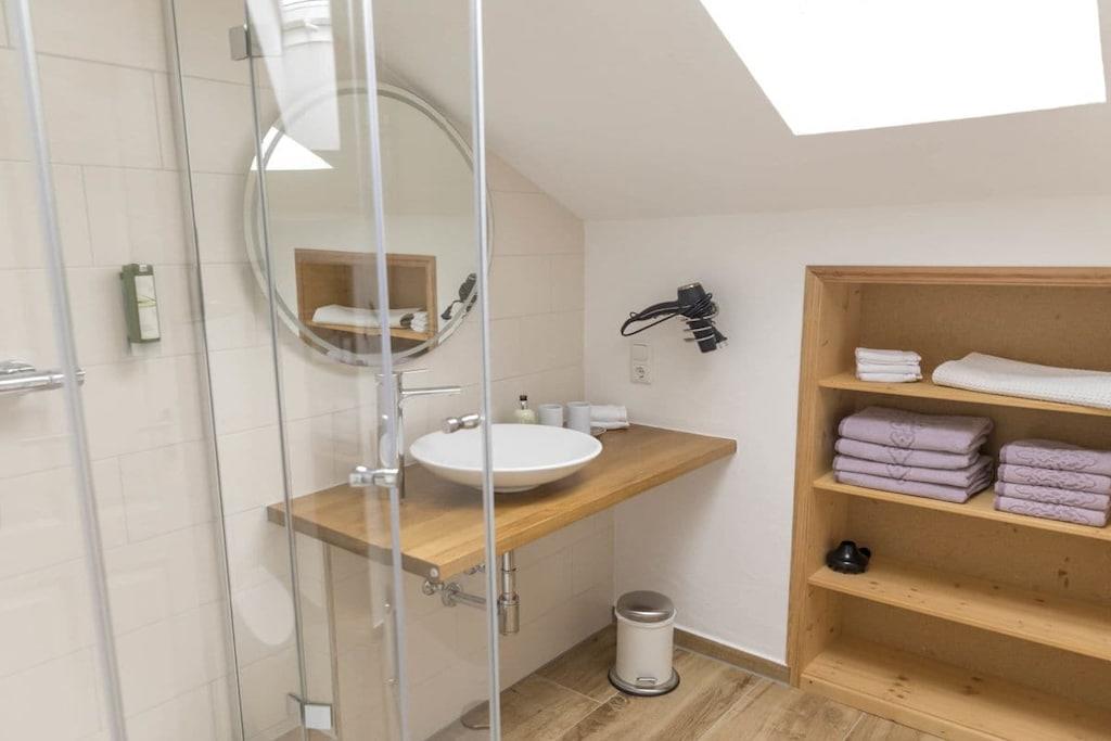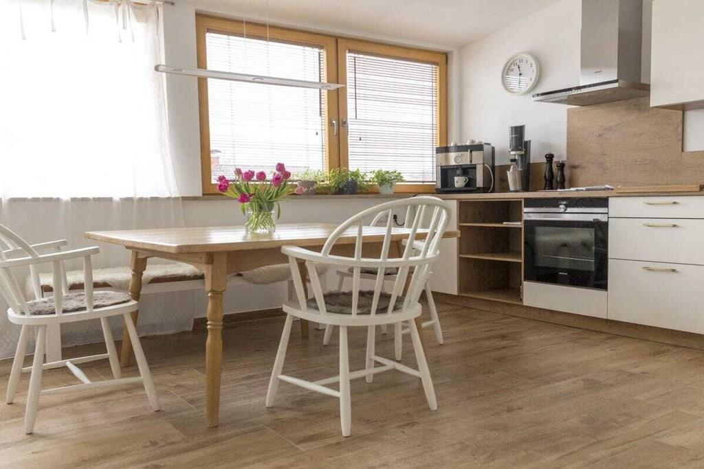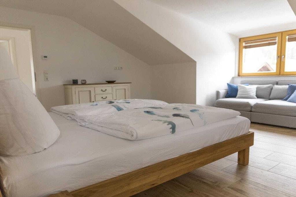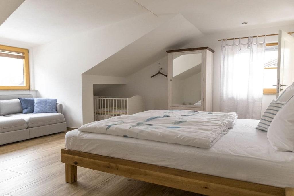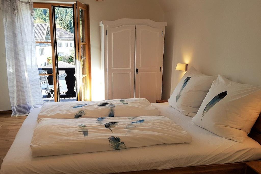 Den fuldstændig renoverede loftslejlighed (100 m²) har 2 soveværelser med dobbeltsenge (180x200 og 160x200) og en sovesofa til 2 personer (tilvalg); 2 badeværelser, entré og en åben, lys stue med spiseplads og stort tekøkken. Den uhindrede panoramaudsigt over hele Wettersteinbjergene med skiløjperne på det lokale bjerg over Alpspitze til Zugspitze er førsteklasses. Det åbne køkken er udstyret til en høj standard: opvaskemaskine, induktion, mikrobølgeovn, ovn, fryser, WMF fuldautomatisk maskine, elektrisk. Citruspresse, brødrister osv. Det træudskårne spisebord har plads til op til 6 personer. Komfort hele vejen rundt: afslappende sofa, smart-tv, Bluetooth-system, højhastigheds-WiFi, balkon, gasgrill, parkeringsplads, skirum, vaskemaskine og meget mere.