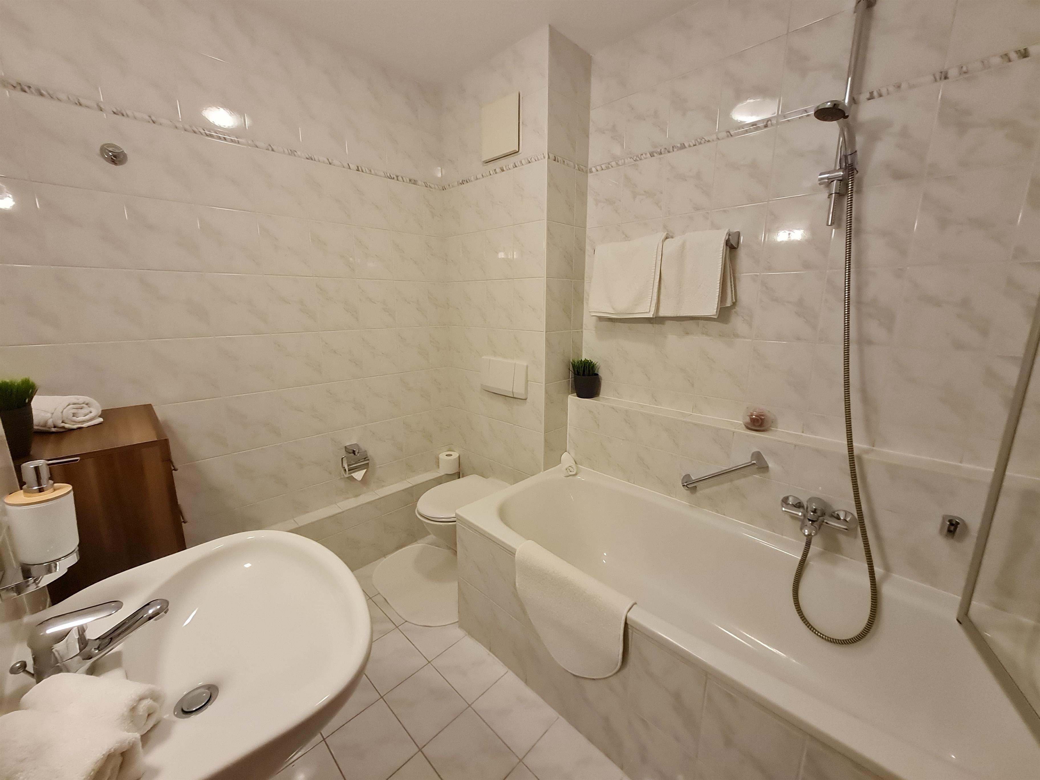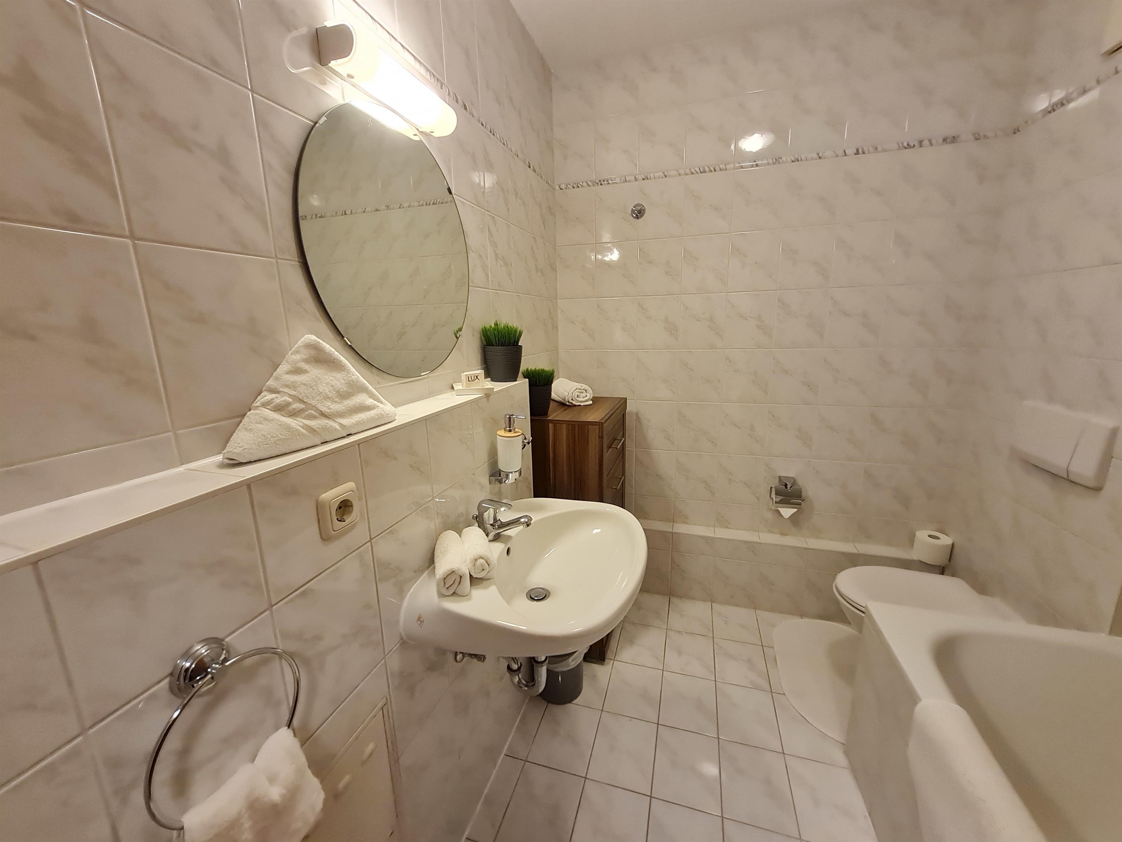 Das Badezimmer ist mit einer Badewanne mit Duschvorrichtung ausgestattet, die separierte Küche befindet sich im Eingangsbereich und bietet alles was man zum Kochen benötigt.