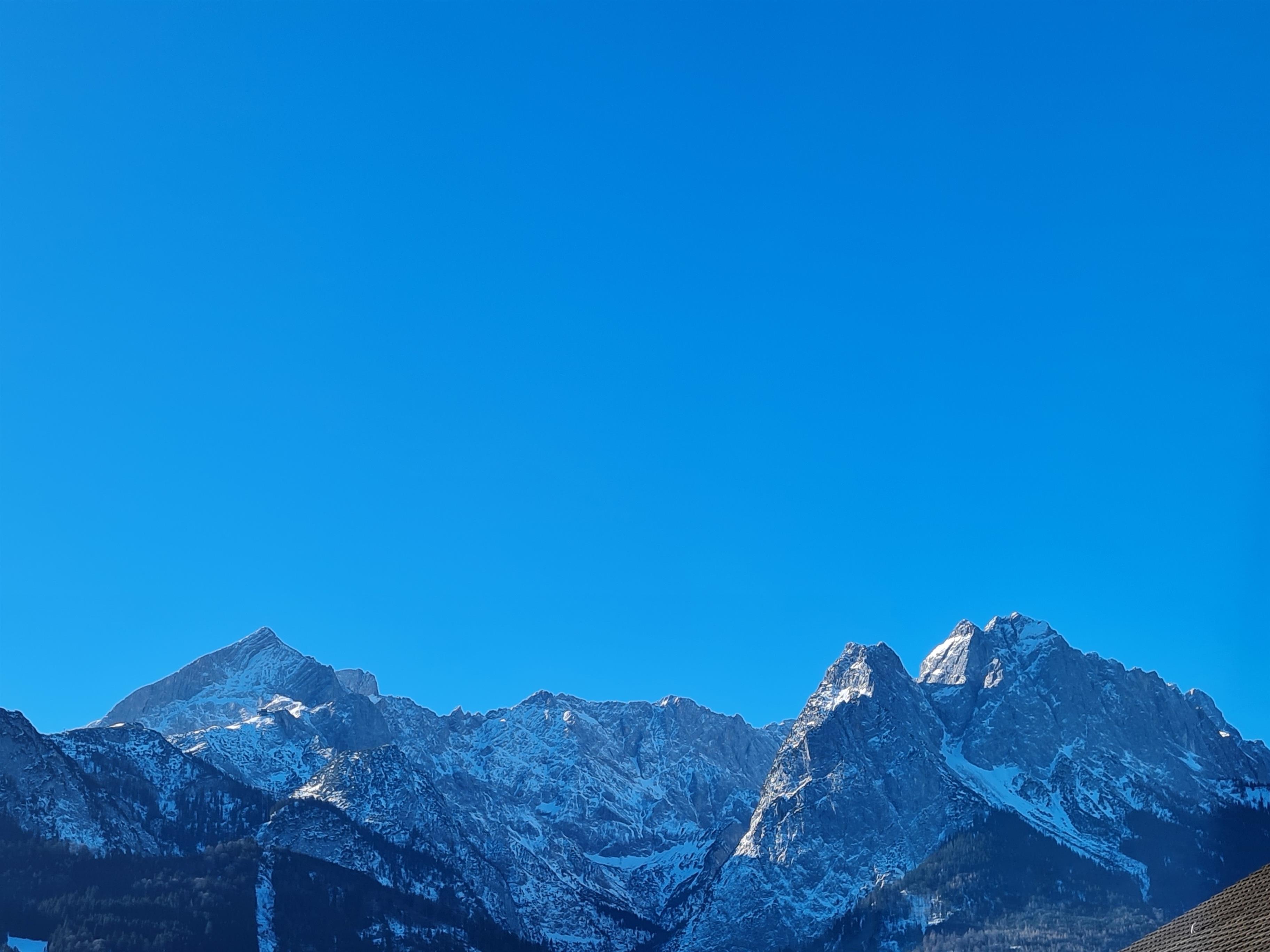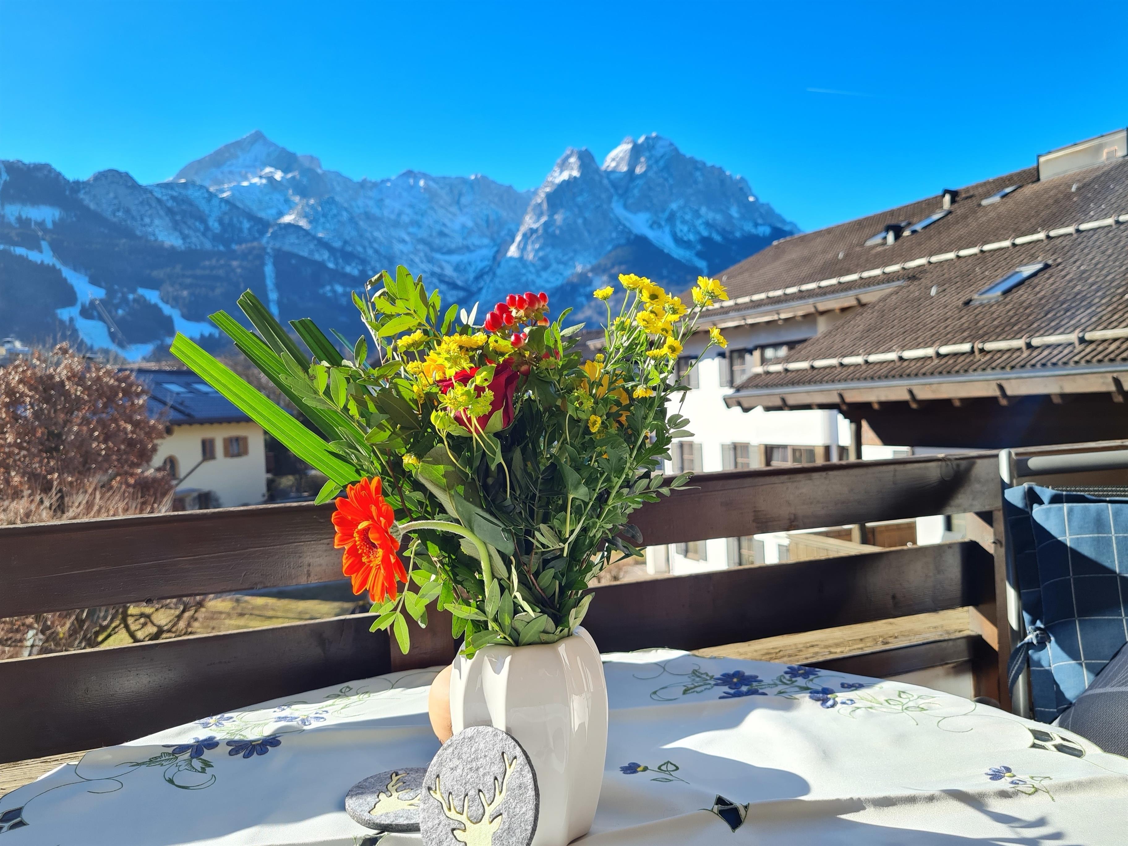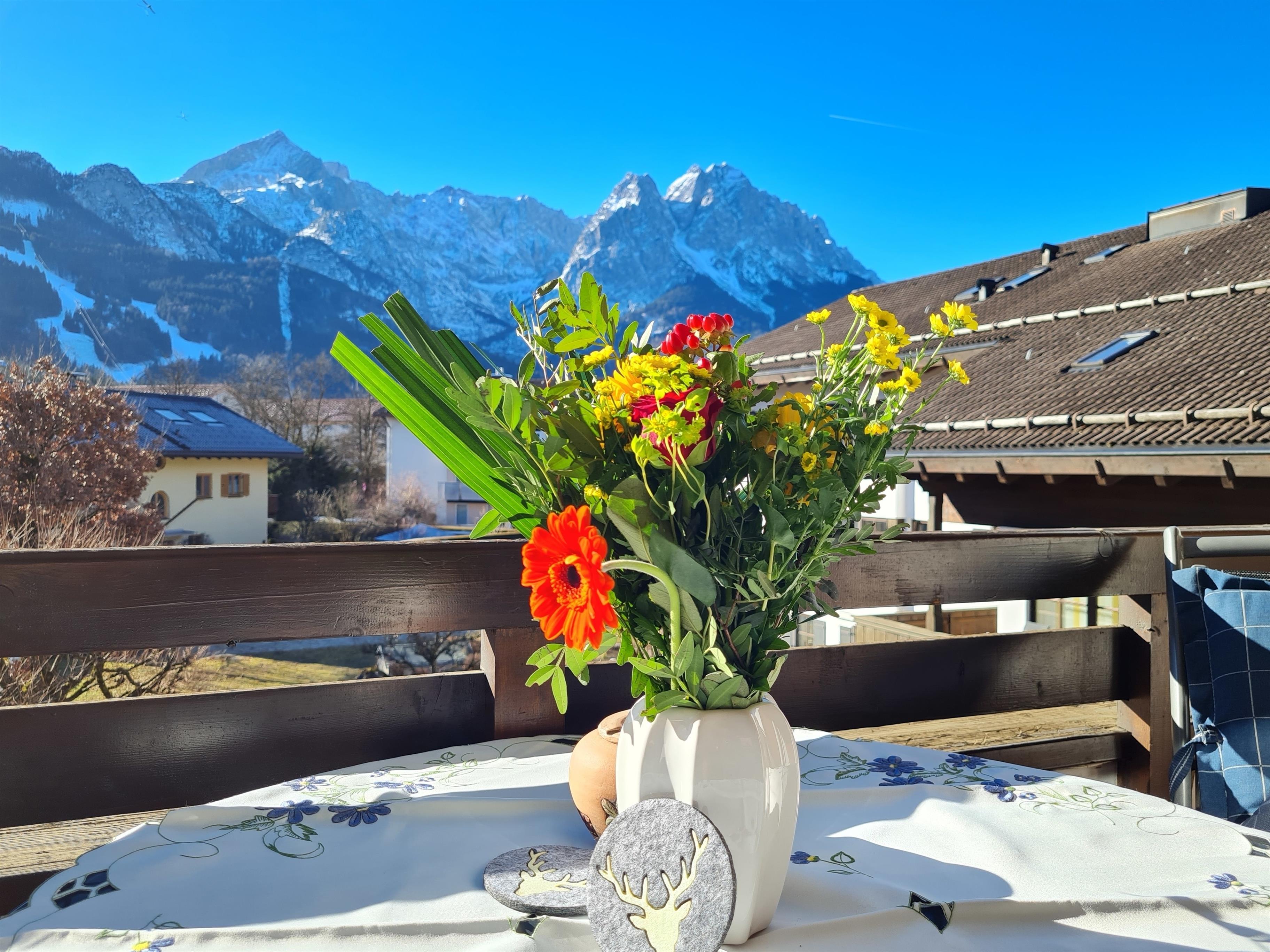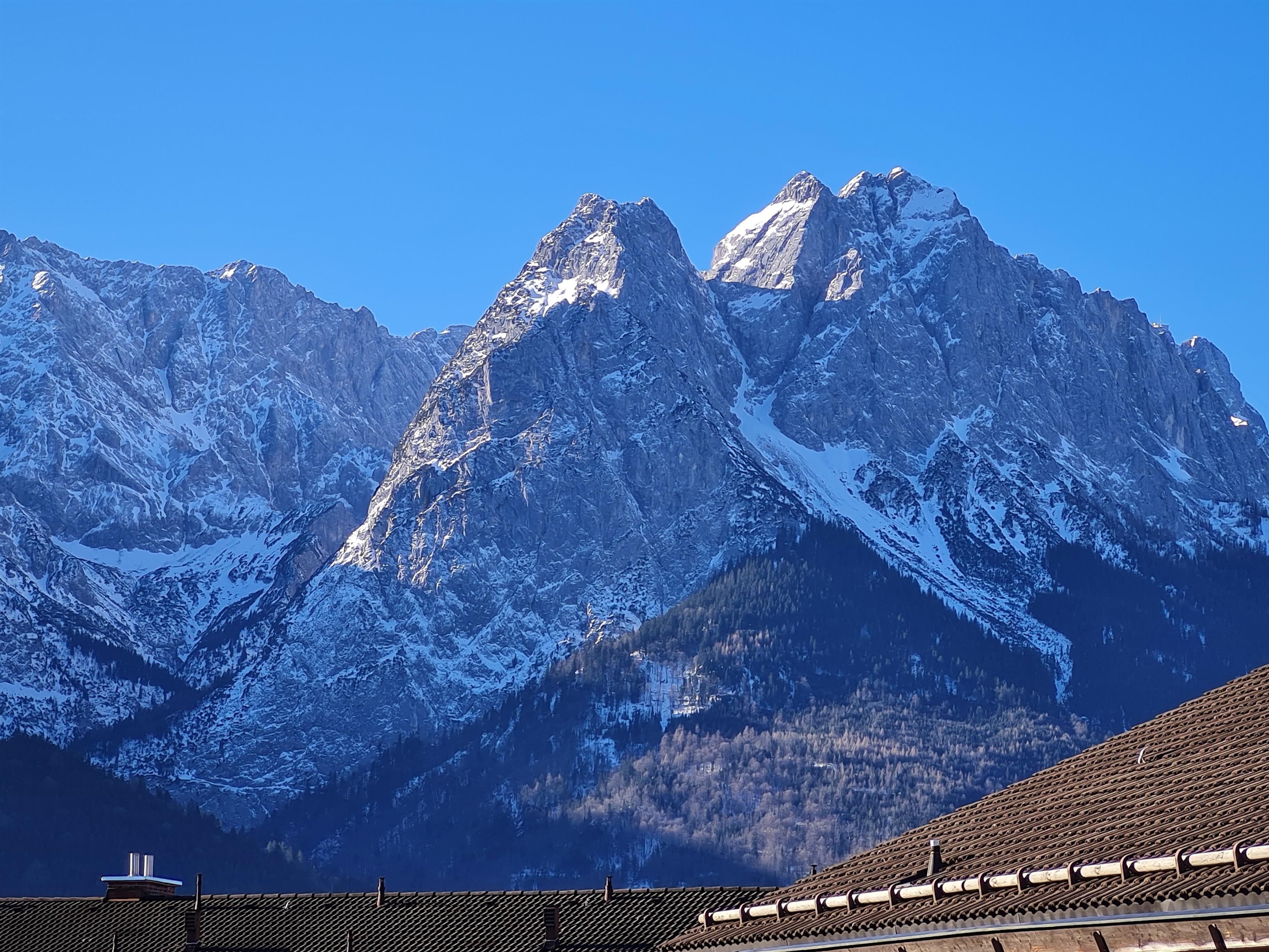 Vom Wohnzimmer aus haben Sie durch die bodentiefen Fenster einen wunderschönen Blick auf das Alpenpanorama des Wettersteinmassives.