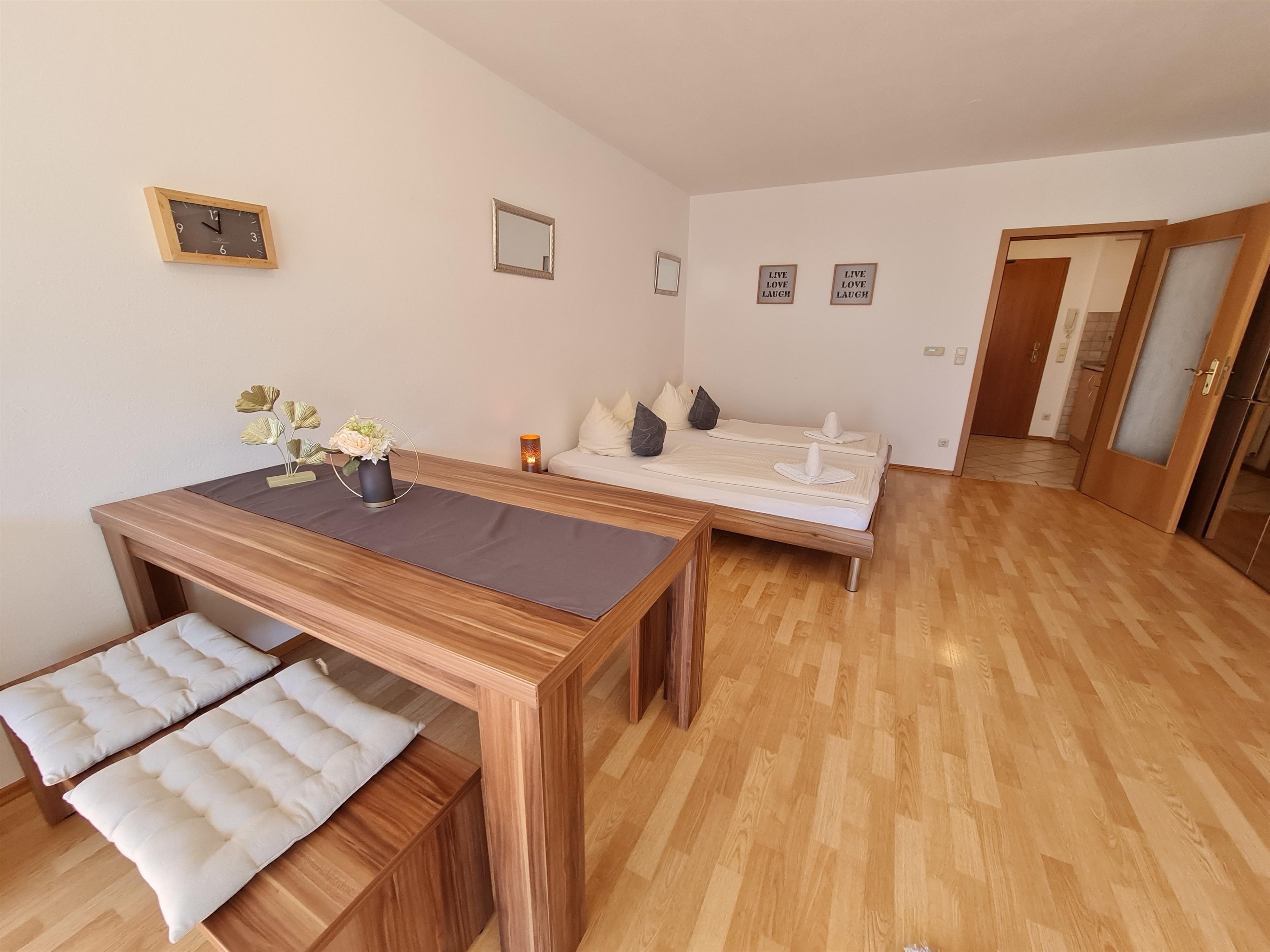 Die Ferienwohnung verfügt über einen gemütlichen und großräumigen Wohn-, Schlaf- und Essbereich, die Schlafecke ist optional abschirmbar.