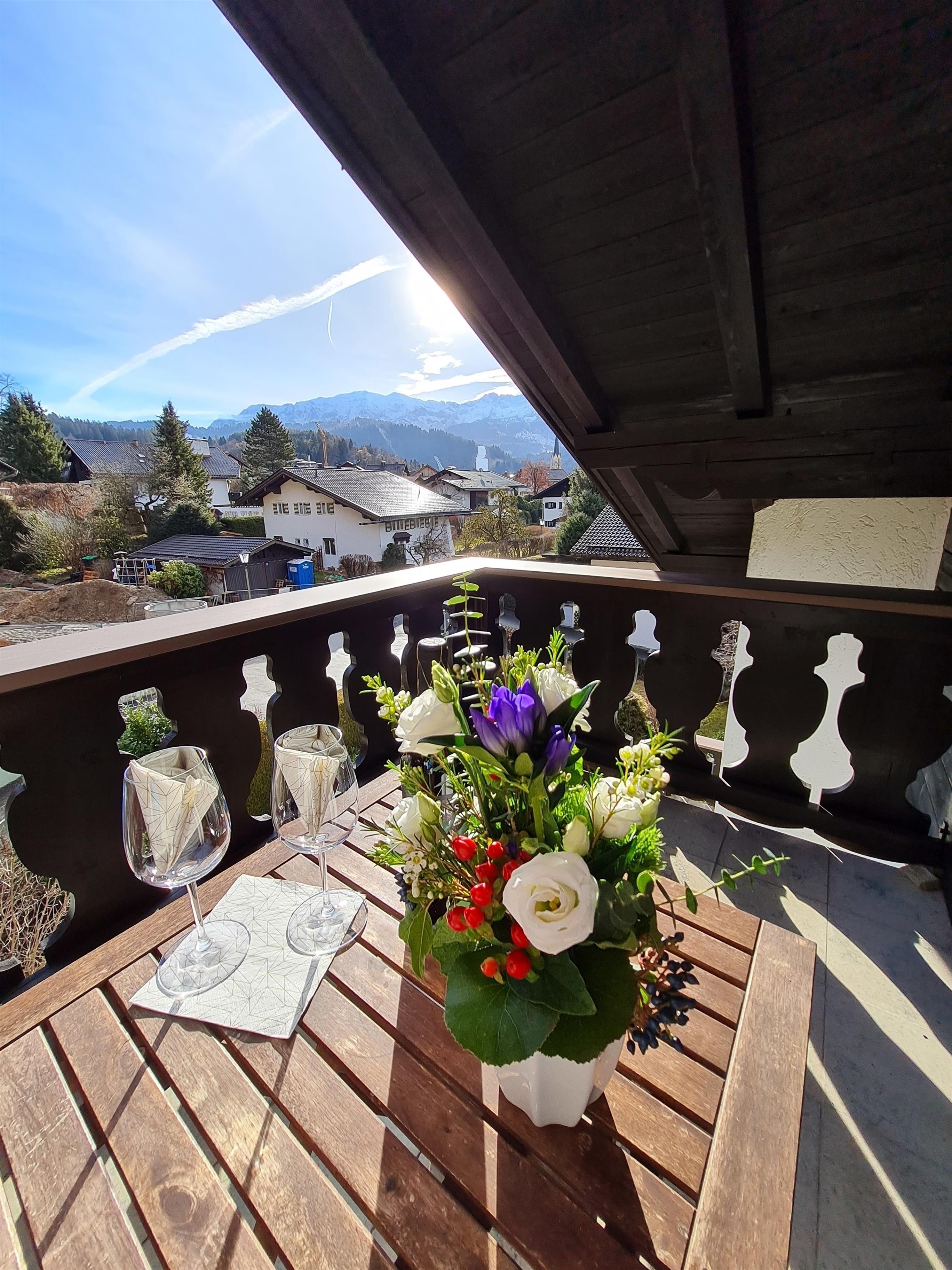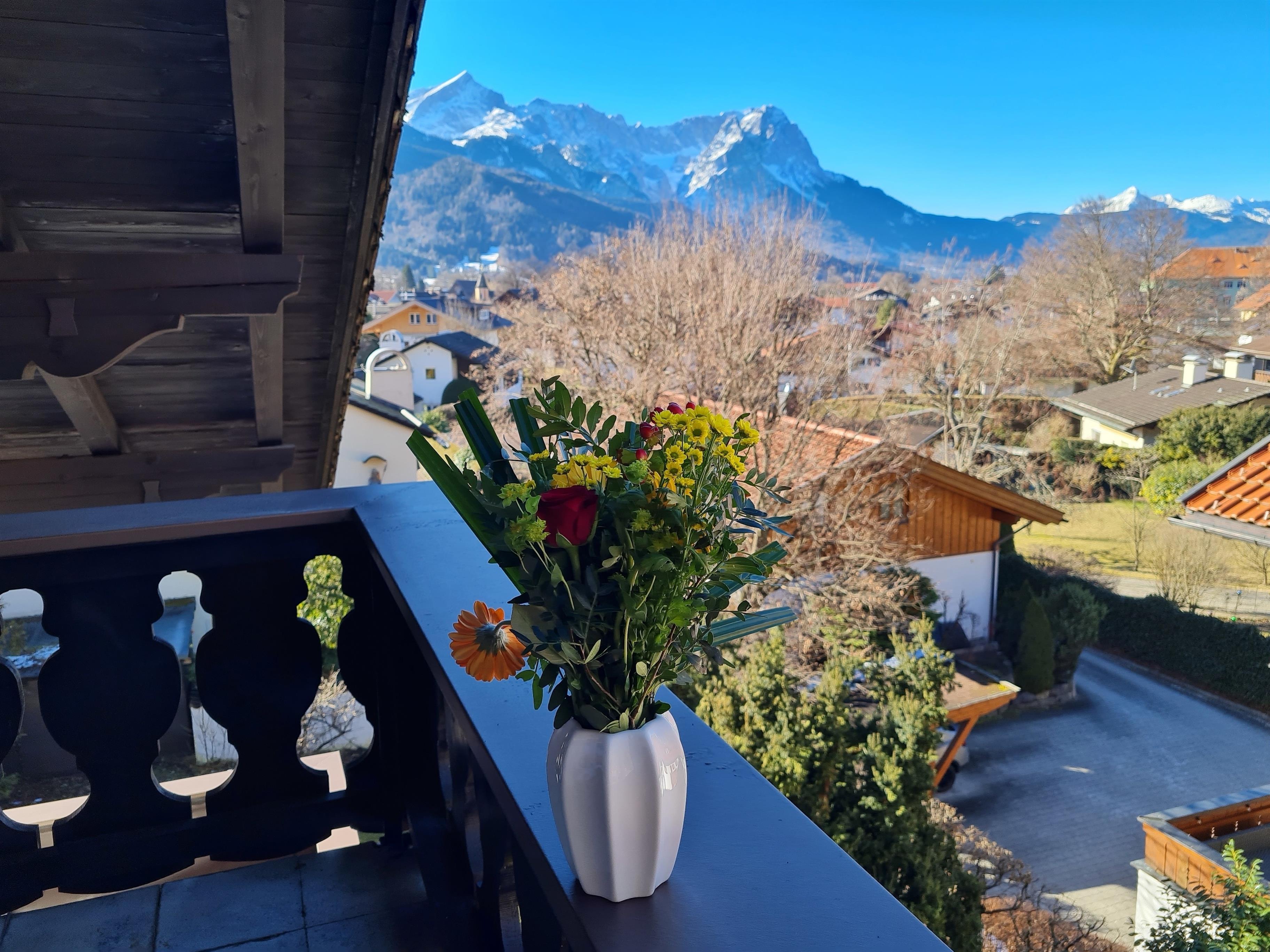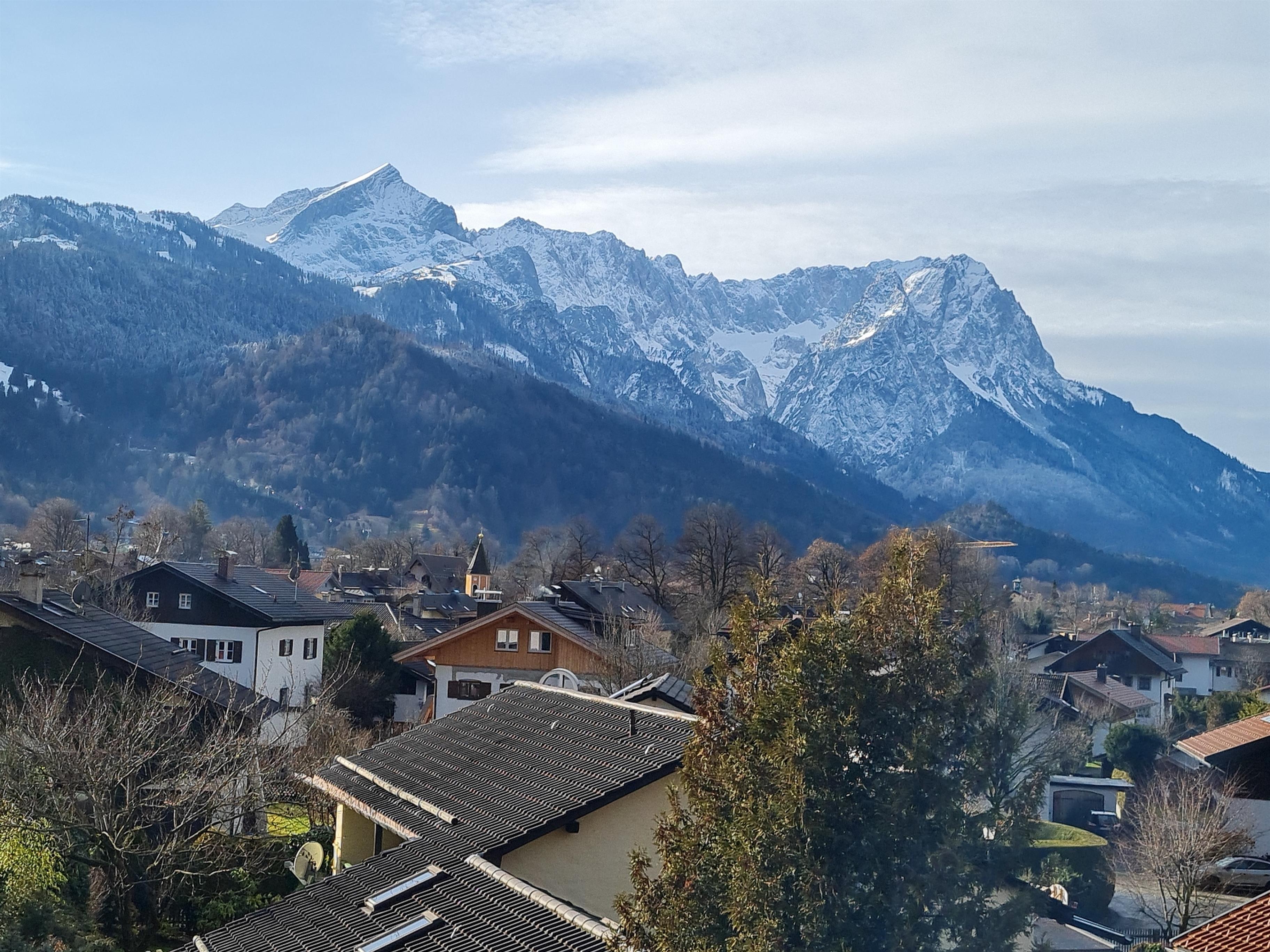 Die Wohnung ist zentrumsnah gelegen. Aber auch die Berge, insbesondere das Wettersteingebirge, befinden sich in der Nähe.