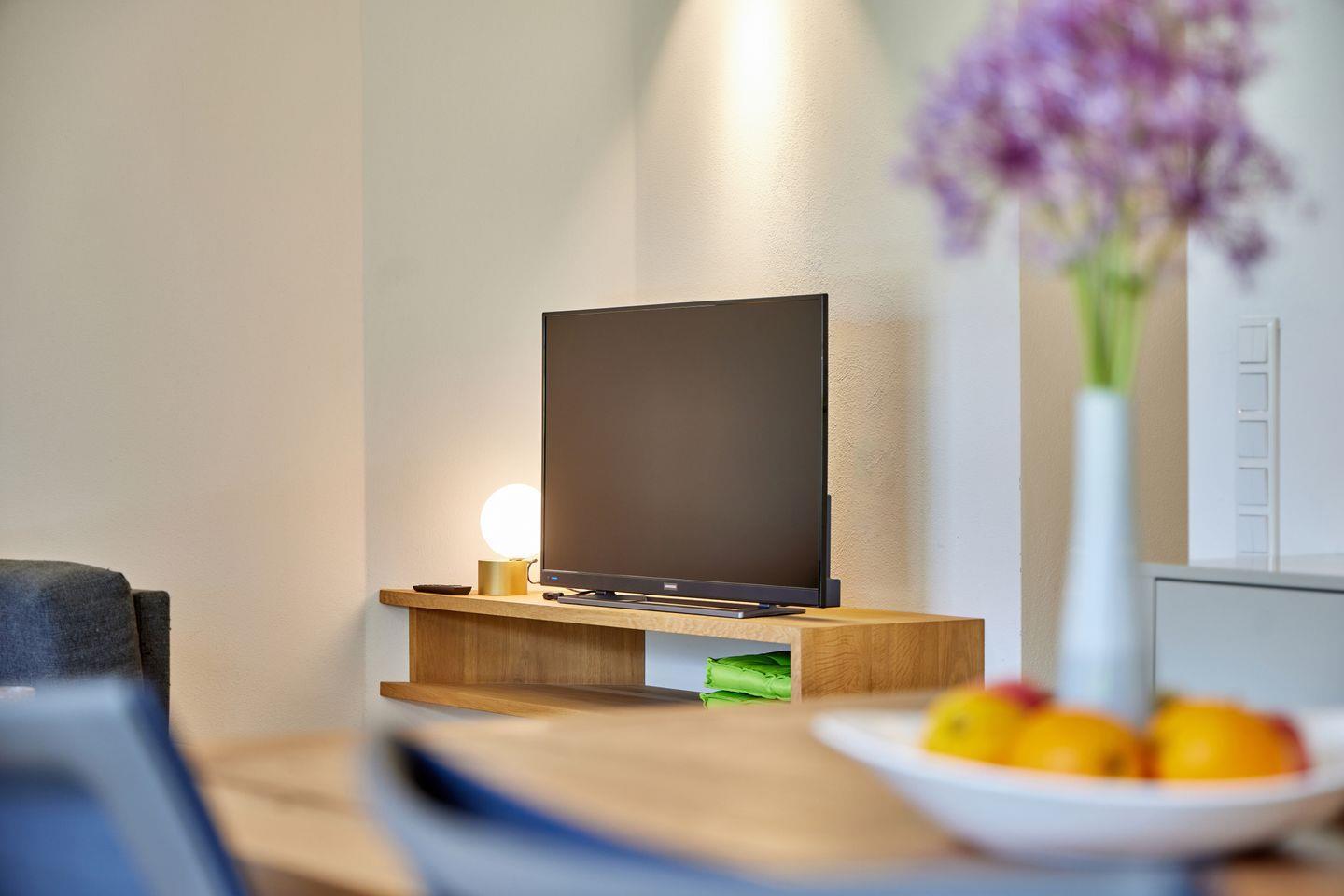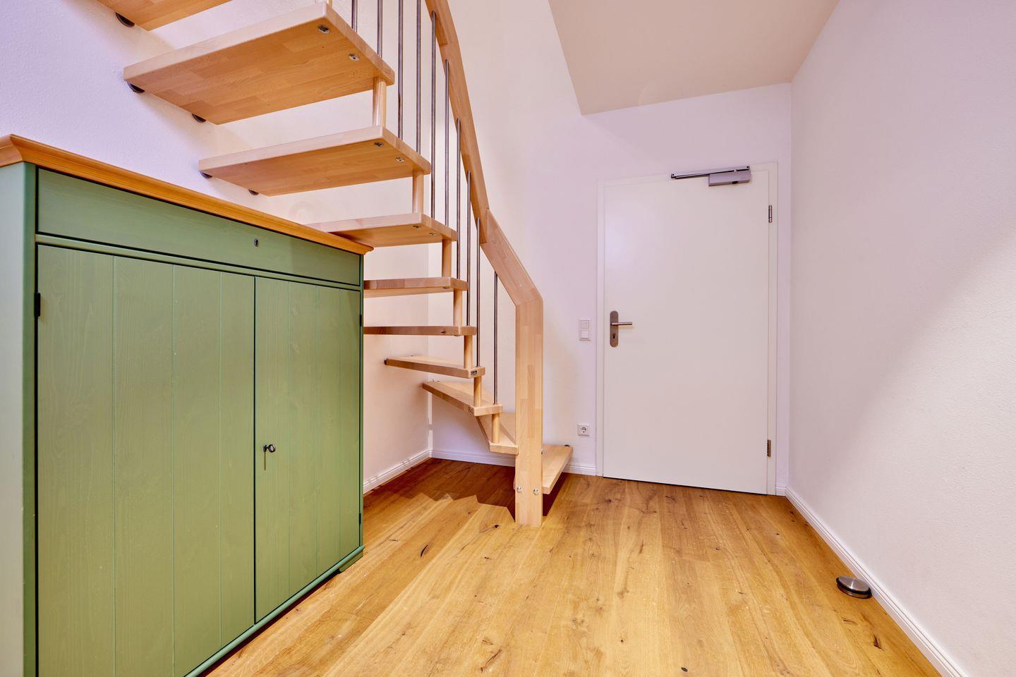 Ein Flachbildfernseher sorgt für die Unterhaltung am Abend und an dem massiven Esstisch aus warmem Holz haben bis zu 4 Personen Platz. Die Räumlichkeiten im Erdgeschoss sind mit elektrischen Rollläden versehen. Die Fußbodenheizung in der gesamten Wohnung lässt kalte Füße nicht zu!