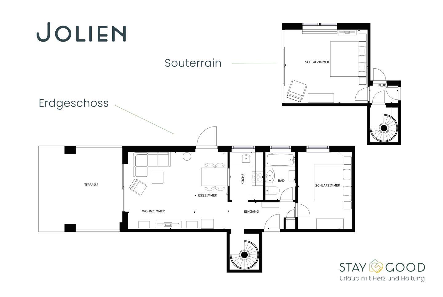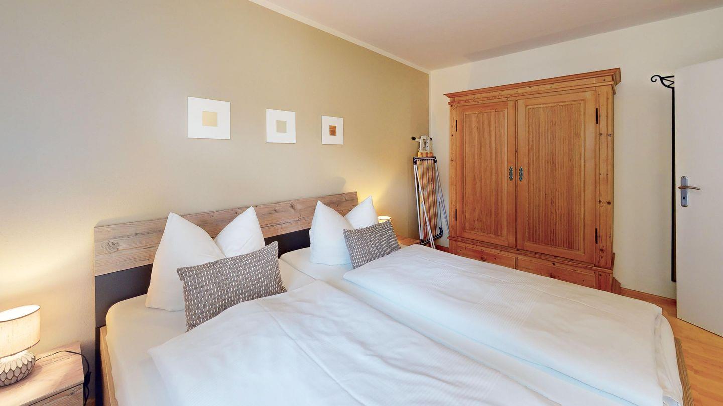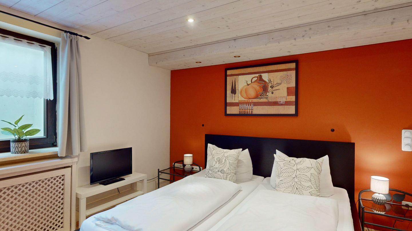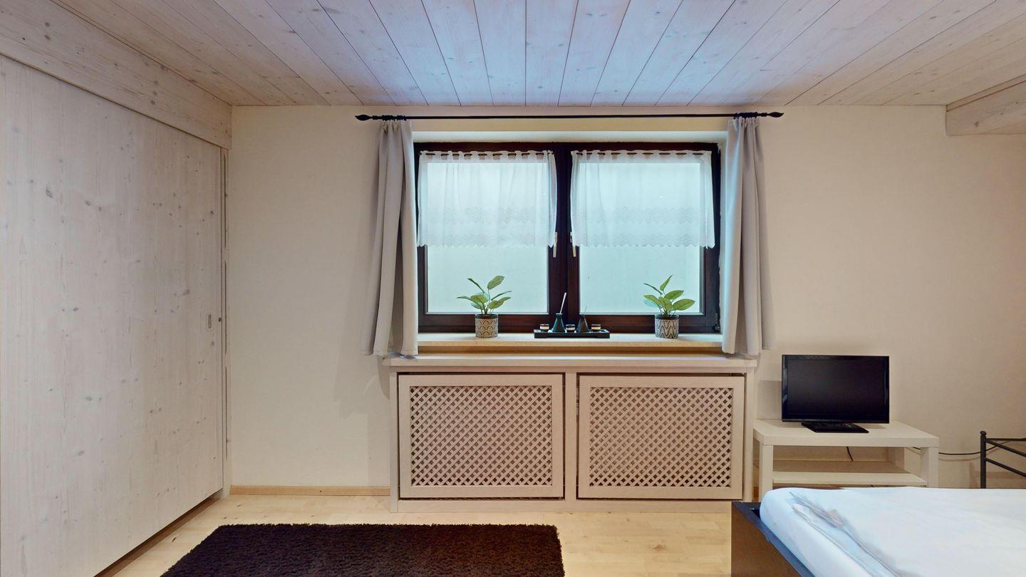 Das 2. Schlafzimmer erreichen Sie durch eine Wendeltreppe ins Untergeschoss. Es handelt sich hier um das gleiche Doppelbett wie im oberen Schlafzimmer und ein Fenster sorgt für genug Licht.