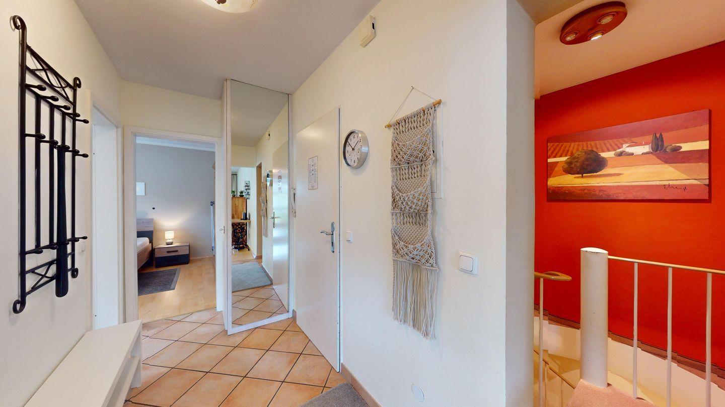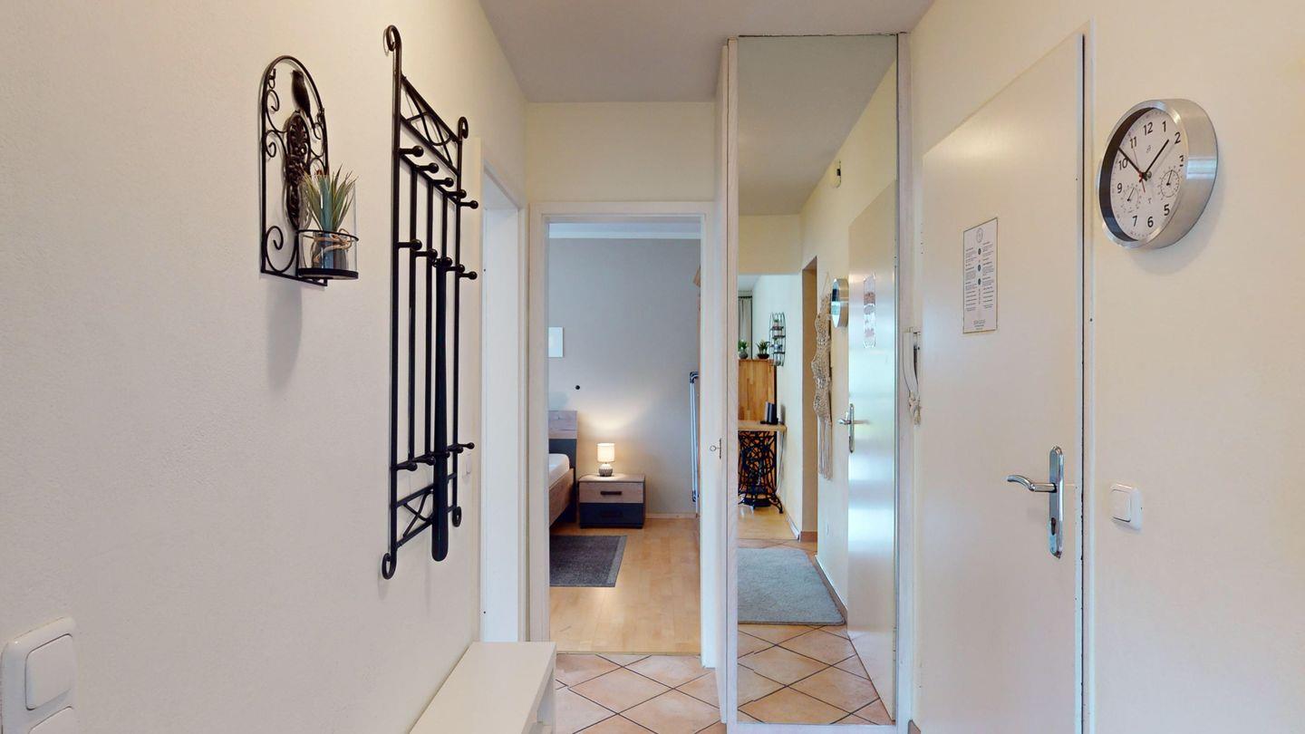 Im vorderen Teil der Wohnung findet sich außerdem das weiß geflieste Tageslichtbad mit Badewanne und darin integrierter Duschvorrichtung sowie WC.