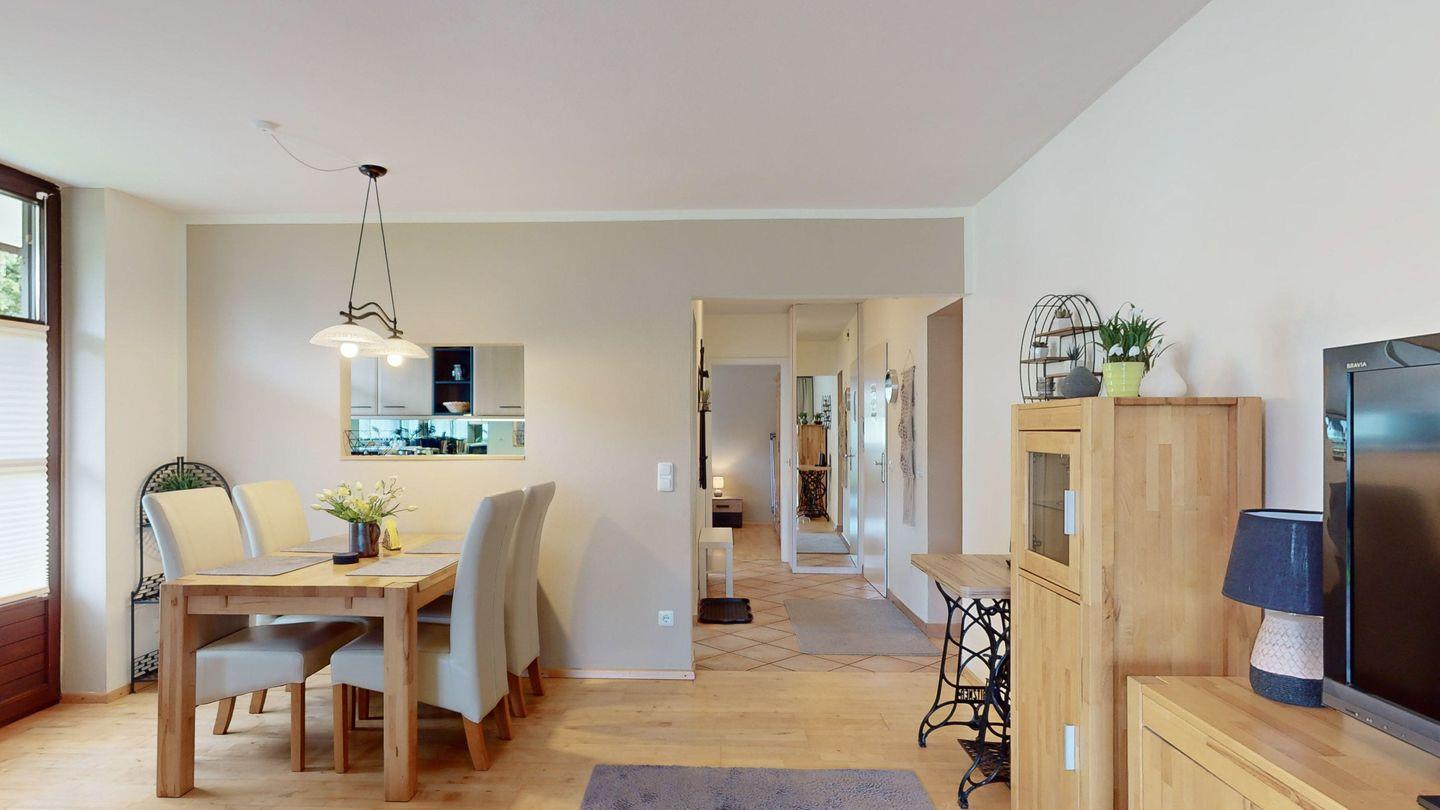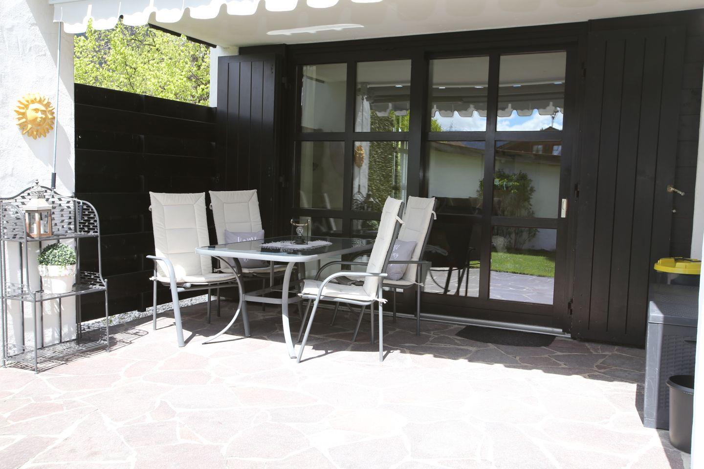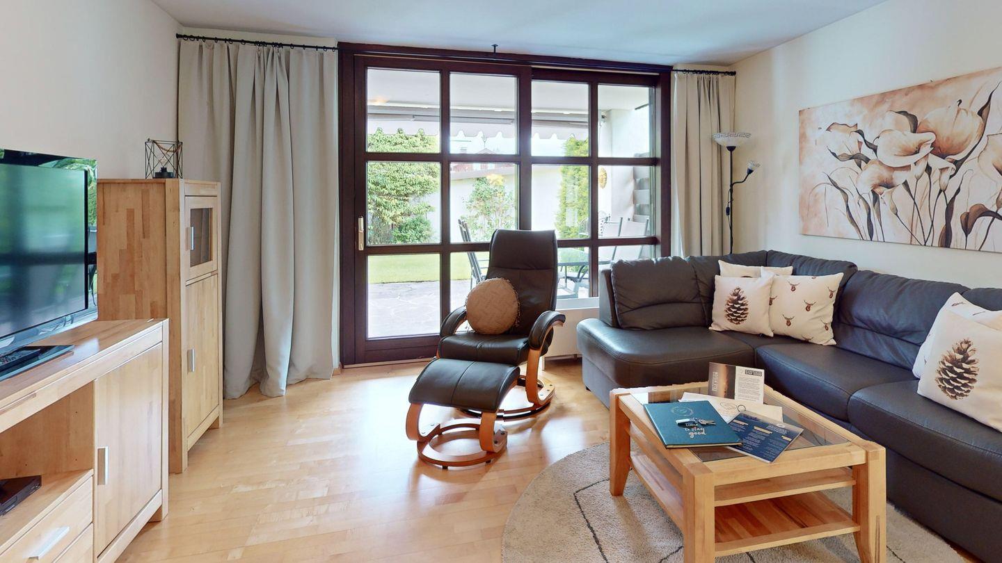 Es erwarten Sie ein großzügiges, helles Wohnzimmer mit Flachbild-TV, gemütlicher Sitzgruppe und separatem Essbereich sowie Zugang zur eigenen Terrasse mit Garten.