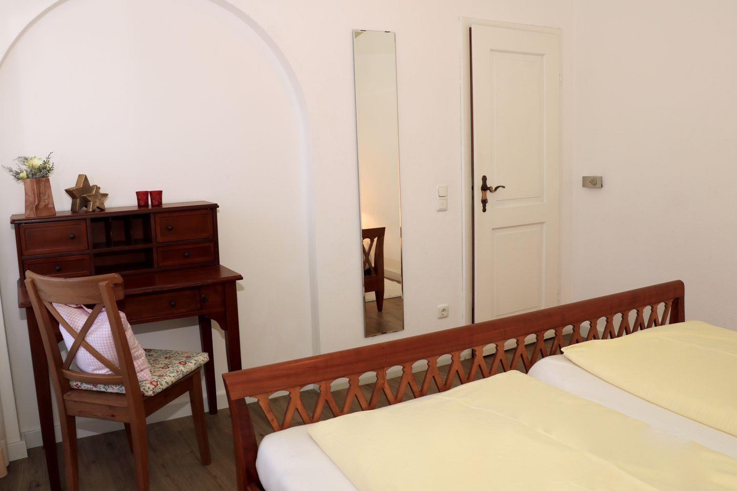 Das 1. Schlafzimmer findet sich ebenfalls hier, im Anschluss an das Wohnzimmer. Es wartet ein gemütliches Doppelbett für ausreichend Platz für 2 Personen auf Sie. Wie der Rest der Wohnung ist auch das Schlafzimmer mit ausreichend Fenstern ausgestattet.