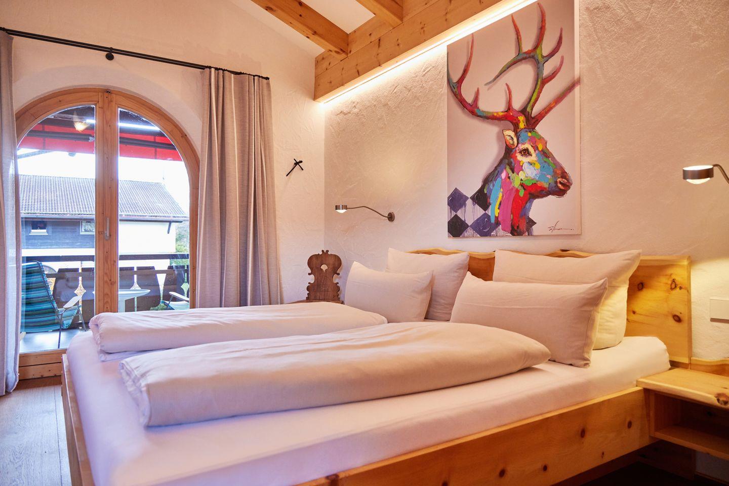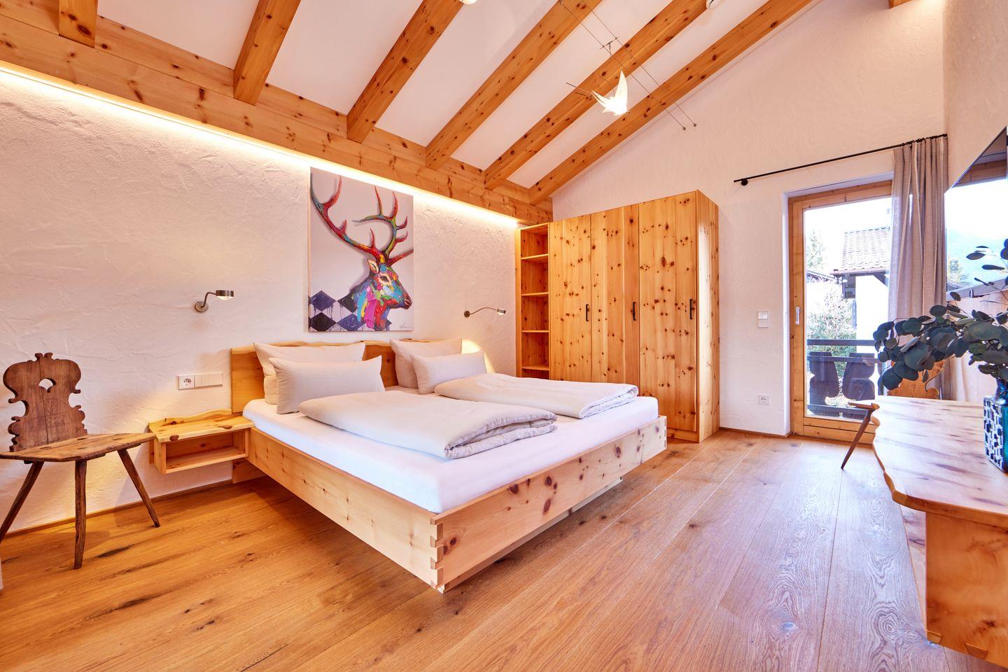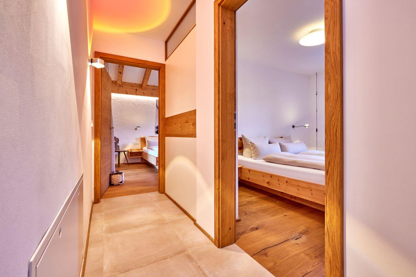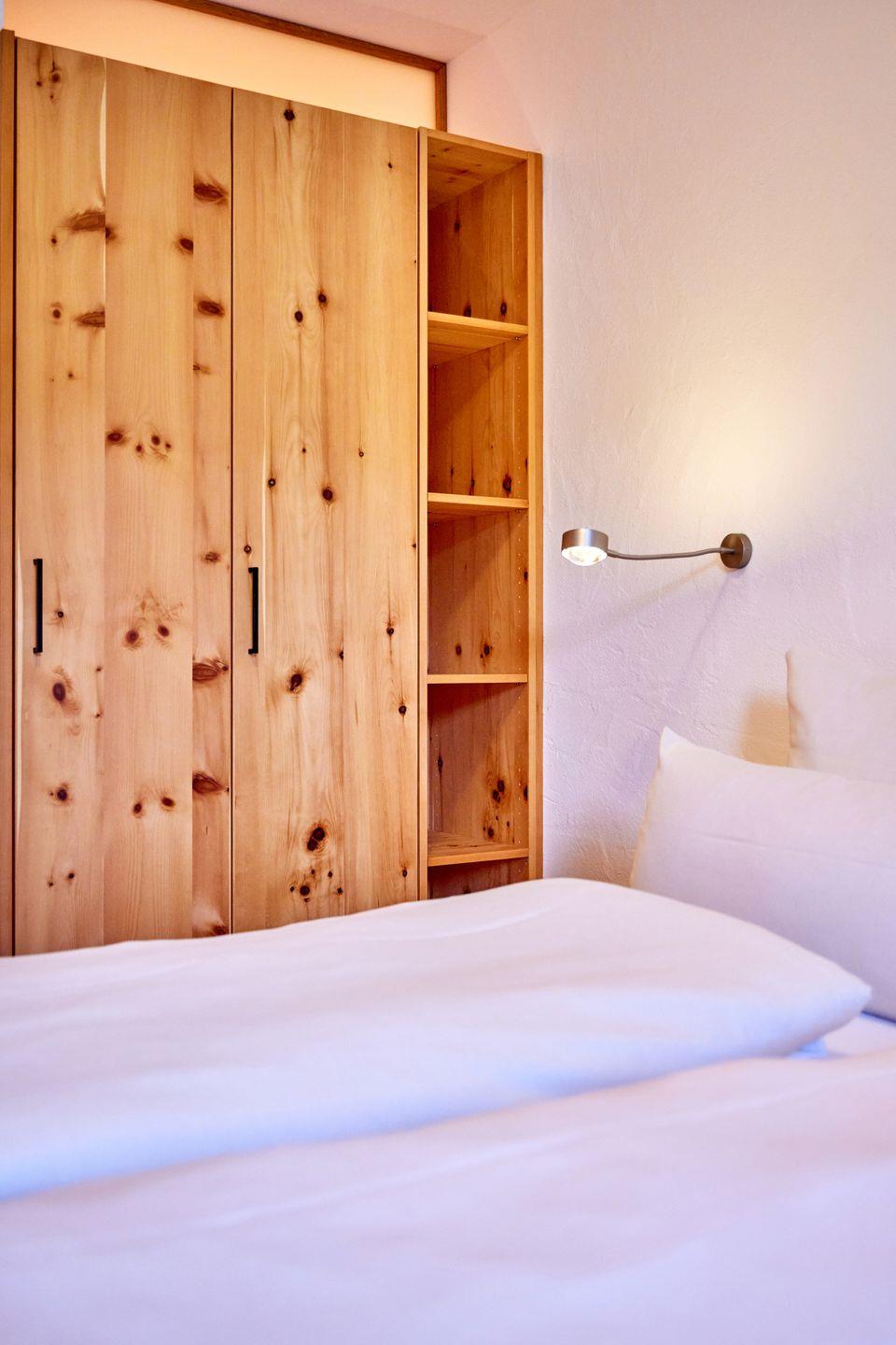 Ein großes und ein kleineres Schlafzimmer bieten, jeweils mit einem Doppelbett und großzügigen Kleiderschränken ausgestattet, die perfekten Rückzugsorte. Die hier verwendeten Zirbenholz-Möbel verbreiten einen beruhigenden Duft und versprechen tiefenentspannte Nachtruhe. Wer morgens der Sonne lieber aus dem Weg geht, kann mithilfe der elektrischen Rollläden alle Fenster in der Wohnung abdunkeln.
