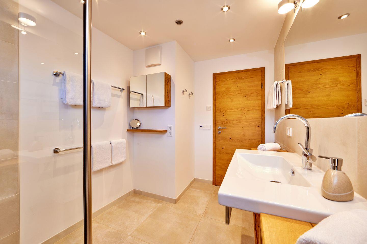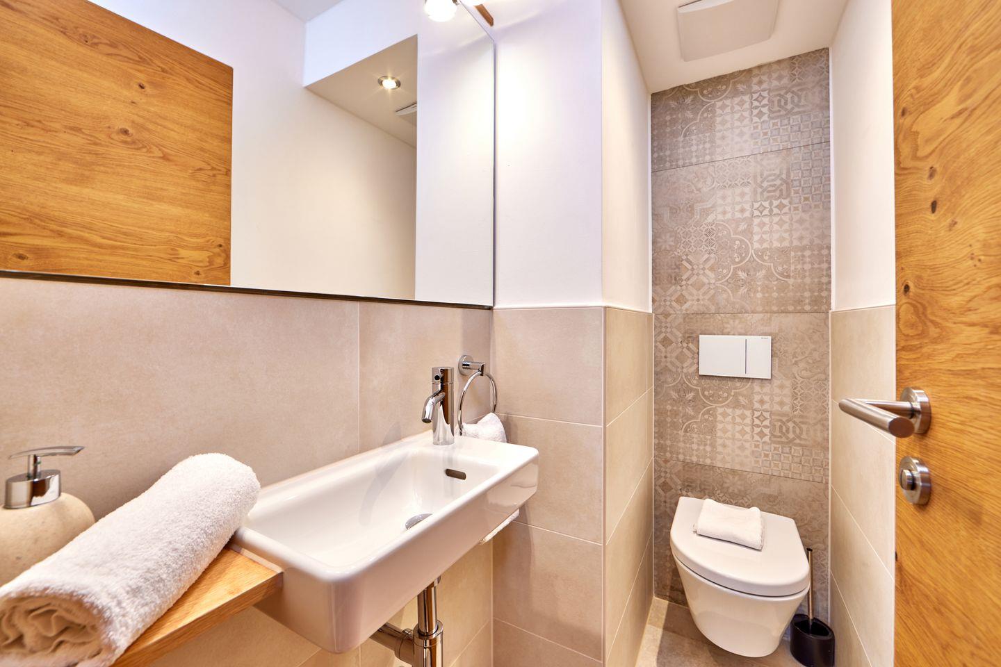 Im modernen Bad mit großer, ebenerdiger Dusche starten Sie dank der eingebauten Lautsprecher und Radio immer mit dem richtigen Sound in den Tag. Zusätzlich verfügt die Wohnung über ein separates Gäste-WC.