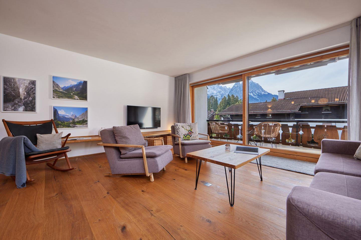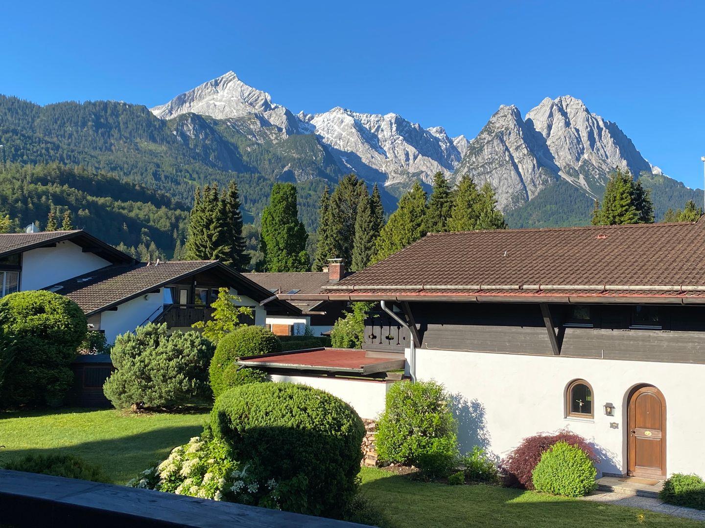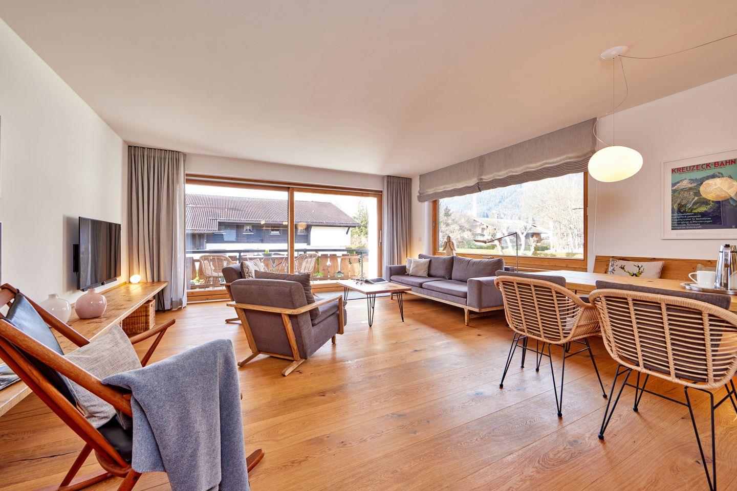 3 Balkone halten ein traumhaftes Bergpanorama bereit und geben Ihnen die Möglichkeit, über den Tag mit der Sonne zu wandern. Morgens ist der Ostbalkon der ideale Platz, um die ersten Sonnenstrahlen einzufangen. Der Südwestbalkon gewährt einen grandiosen Blick auf die Alpspitze und die Waxensteine und in der Loggia lässt es sich auch bei schlechterem Wetter bequem und windgeschützt sitzen.