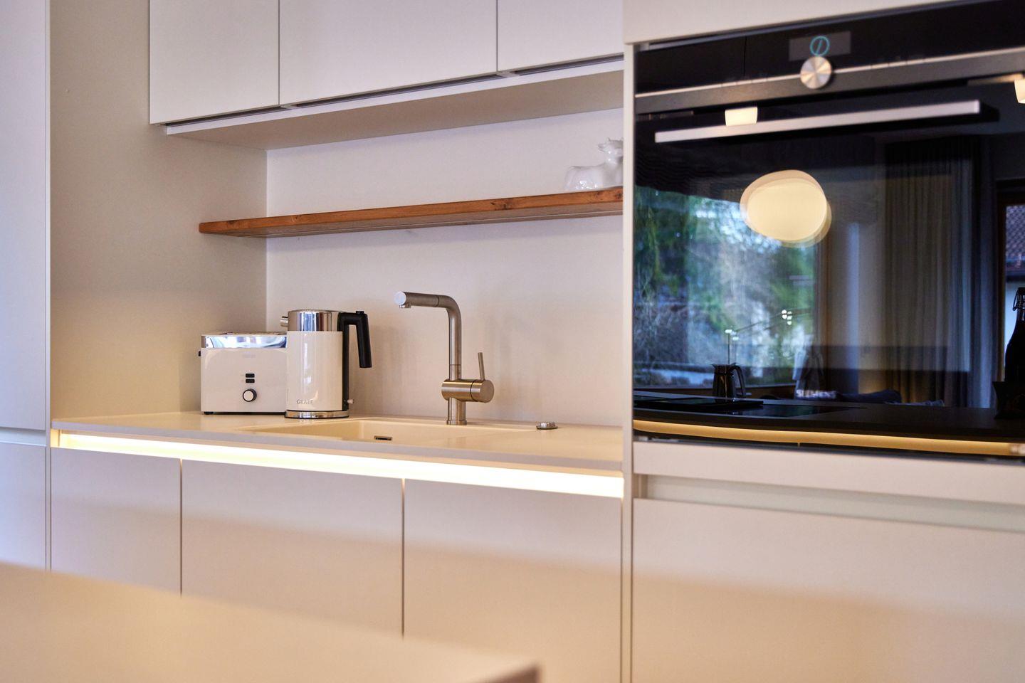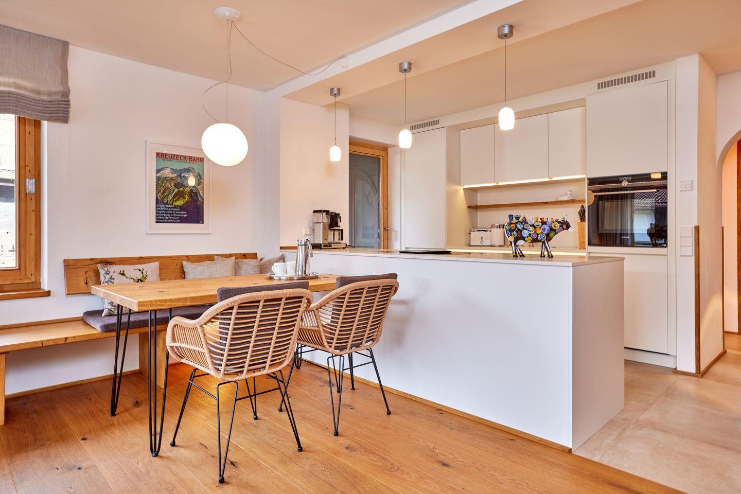 Das Herzstück der Wohnung bildet ein einladender Wohn- und Essraum. Die gemütliche Wohnlandschaft mit bequemem Sofa und herrlichen Sesseln lädt zum Verweilen ein, der Esstisch mit Sitzgruppe zum entspannten Zusammensitzen. Die offene Küche ist mit hochwertigen Utensilien und Küchengeräten voll ausgestattet und lässt auch begeisterte Hobbyköche nichts vermissen. Ein durchdachtes Beleuchtungskonzept rundet die Ausstattung ab und sorgt besonders zu späterer Stunde für eine angenehme Atmosphäre.