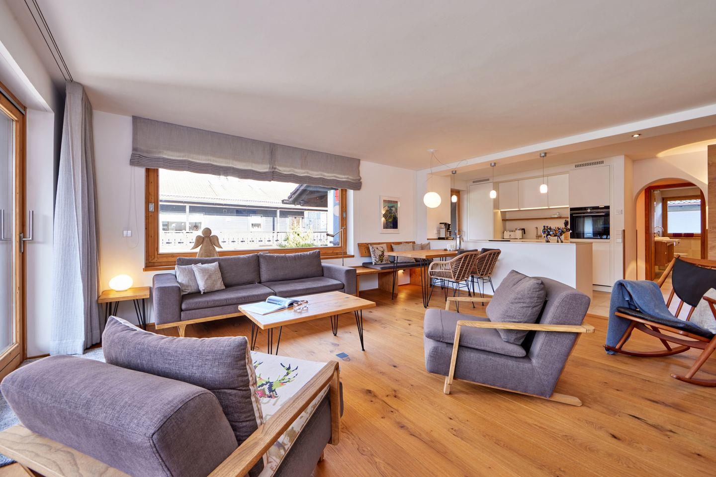 Im 1. OG gelegen, erwartet Sie in dieser Wohnung auf 85 qm ein ganz besonderer Wohlfühlort. Hochwertige Einrichtung, natürliche Materialien und viele besondere Details ergeben eine harmonische Kombination aus hochwertigem Design und alpinem Charme mit Wohlfühl-Faktor.