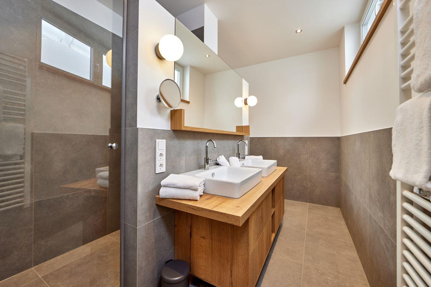 Angrenzend zum Wohnbereich befinden sich ein Gäste-WC und eines der Schlafzimmer. Ausgestattet mit einem komfortablen Doppelbett, Flachbild-Fernseher, geräumigem Kleiderschrank und eigenem Badezimmer mit Dusche, finden Sie hier einen idealen Rückzugsort und kuscheliges Plätzchen für die Nachtruhe.