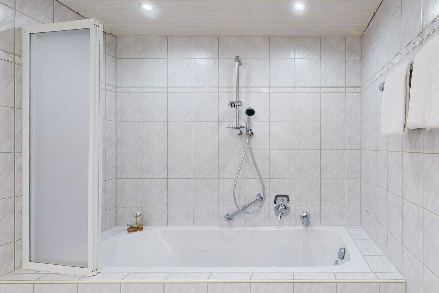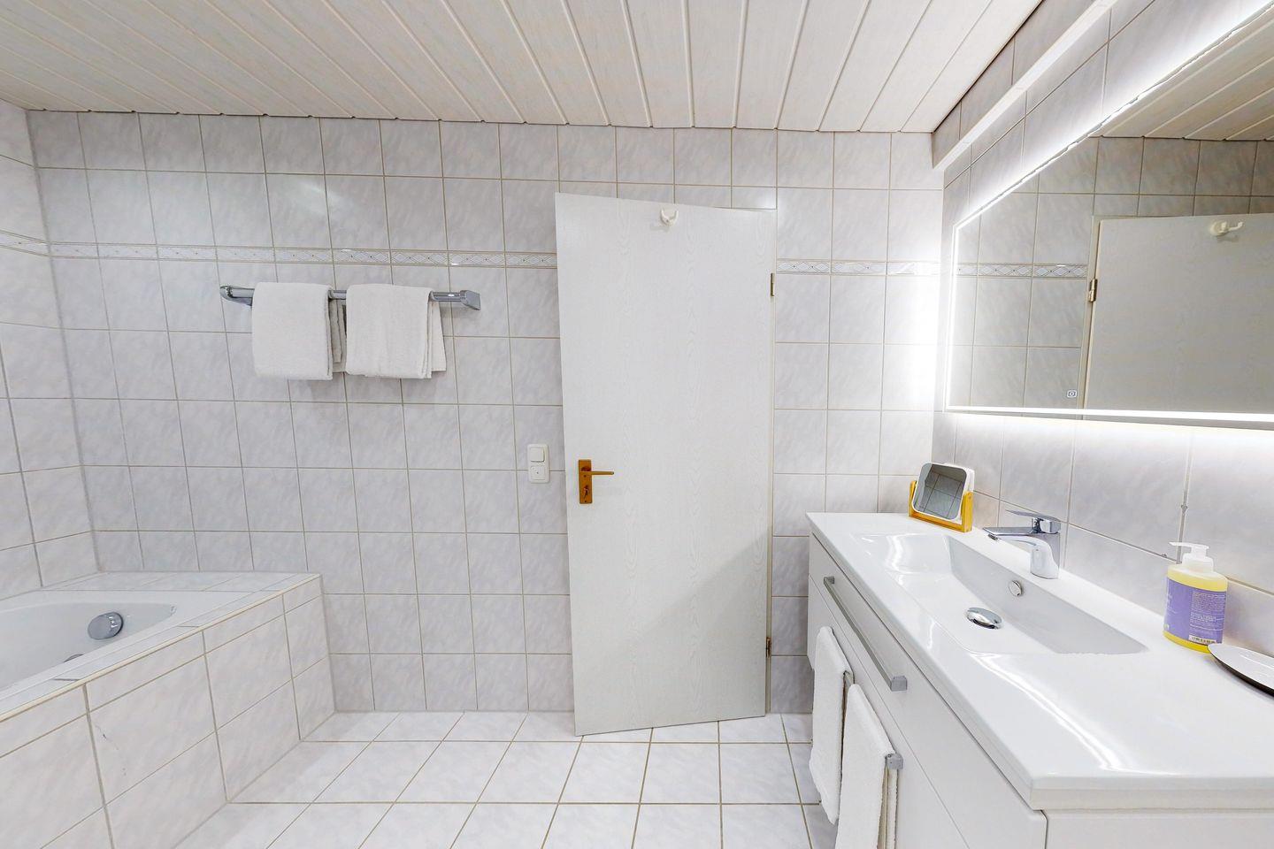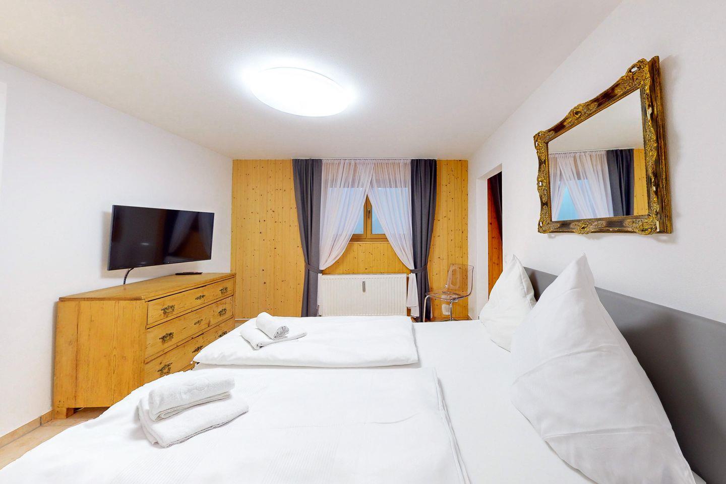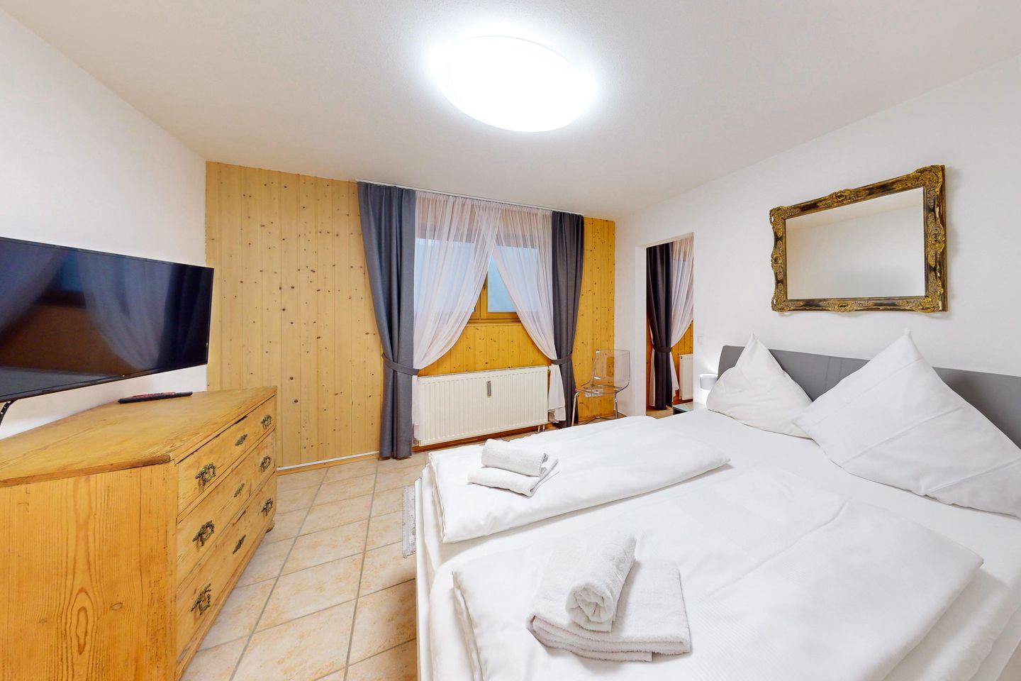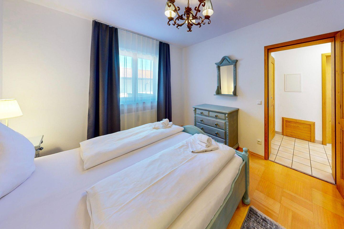 Die Wohnung verfügt über zwei Schlafzimmer mit gemütlichen Doppelbetten, eines im Erdgeschoss und eines im Untergeschoss mit eigenem Badezimmer. Zudem stehen Ihnen insgesamt zwei Badezimmer zur Verfügung, was besonders für Familien oder kleine Gruppen ideal ist.