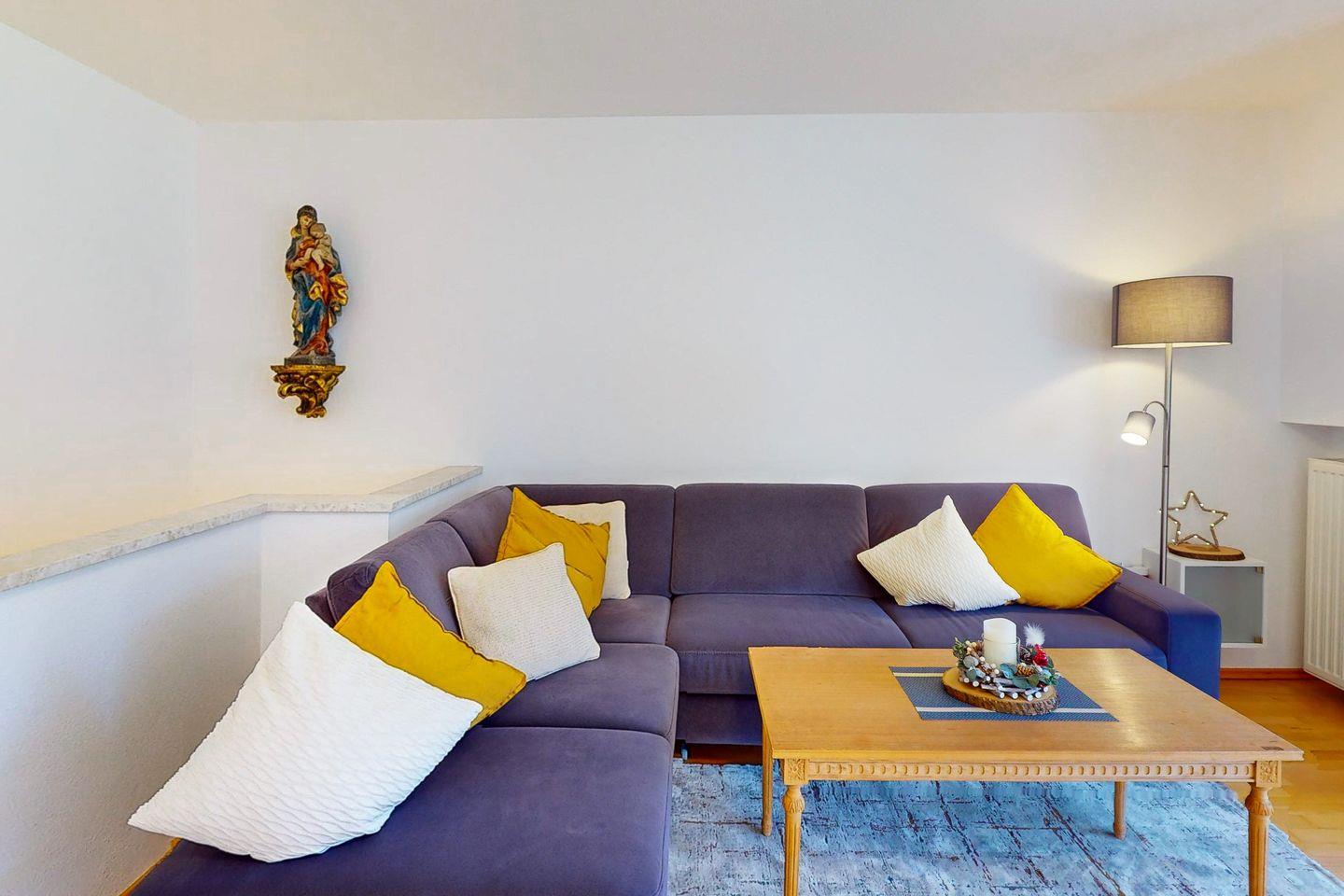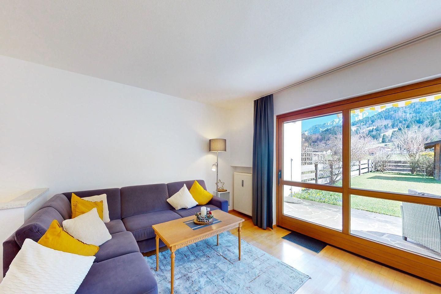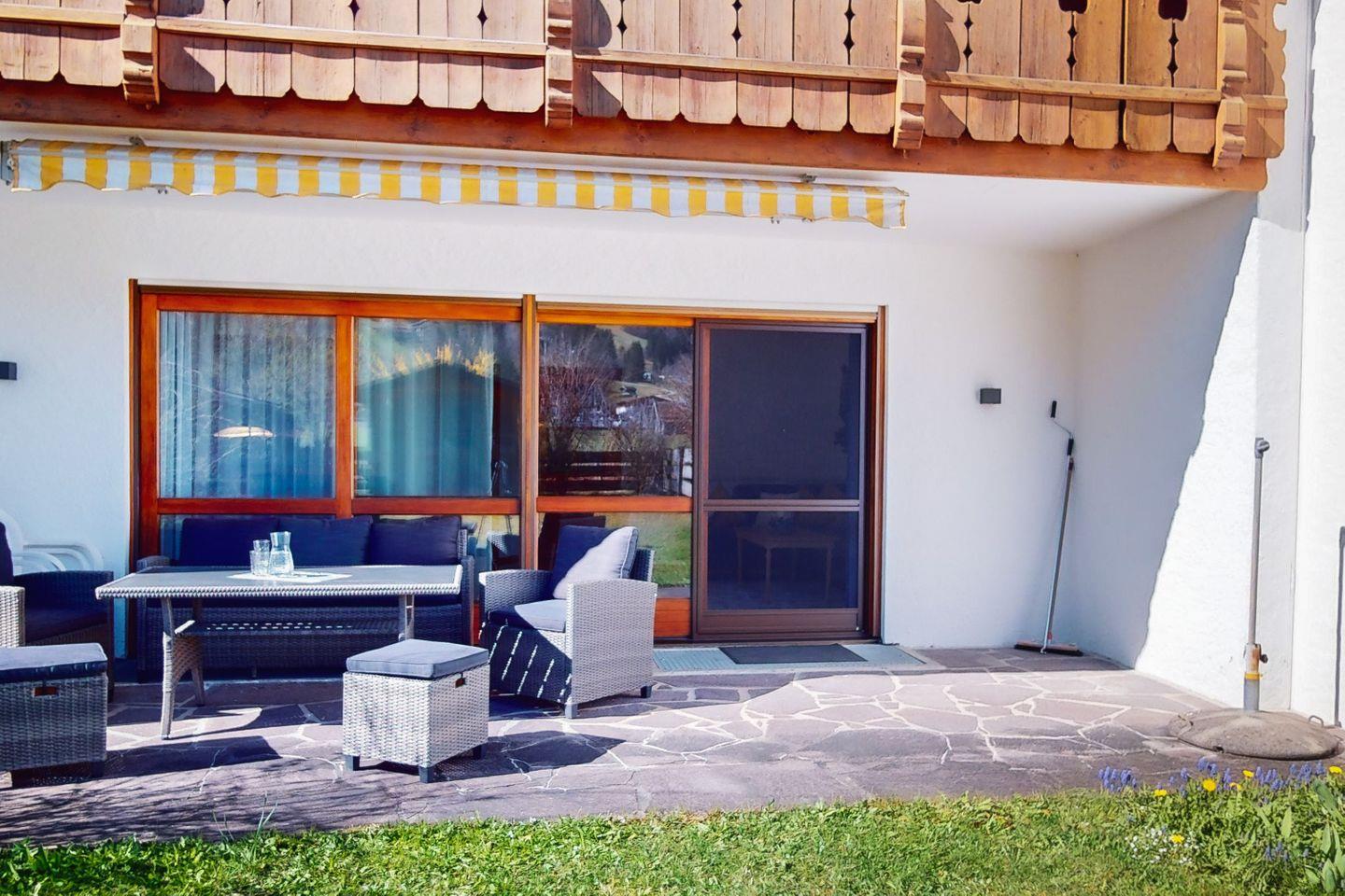 Eine nach Süden ausgerichtete Terrasse mit traumhaftem Bergblick und kleinem Garten lädt zum Entspannen und Verweilen ein. Hier können Sie die Sonne genießen und den Blick auf die imposanten Gipfel der Umgebung schweifen lassen – ein Anblick, der Sie garantiert begeistern wird.