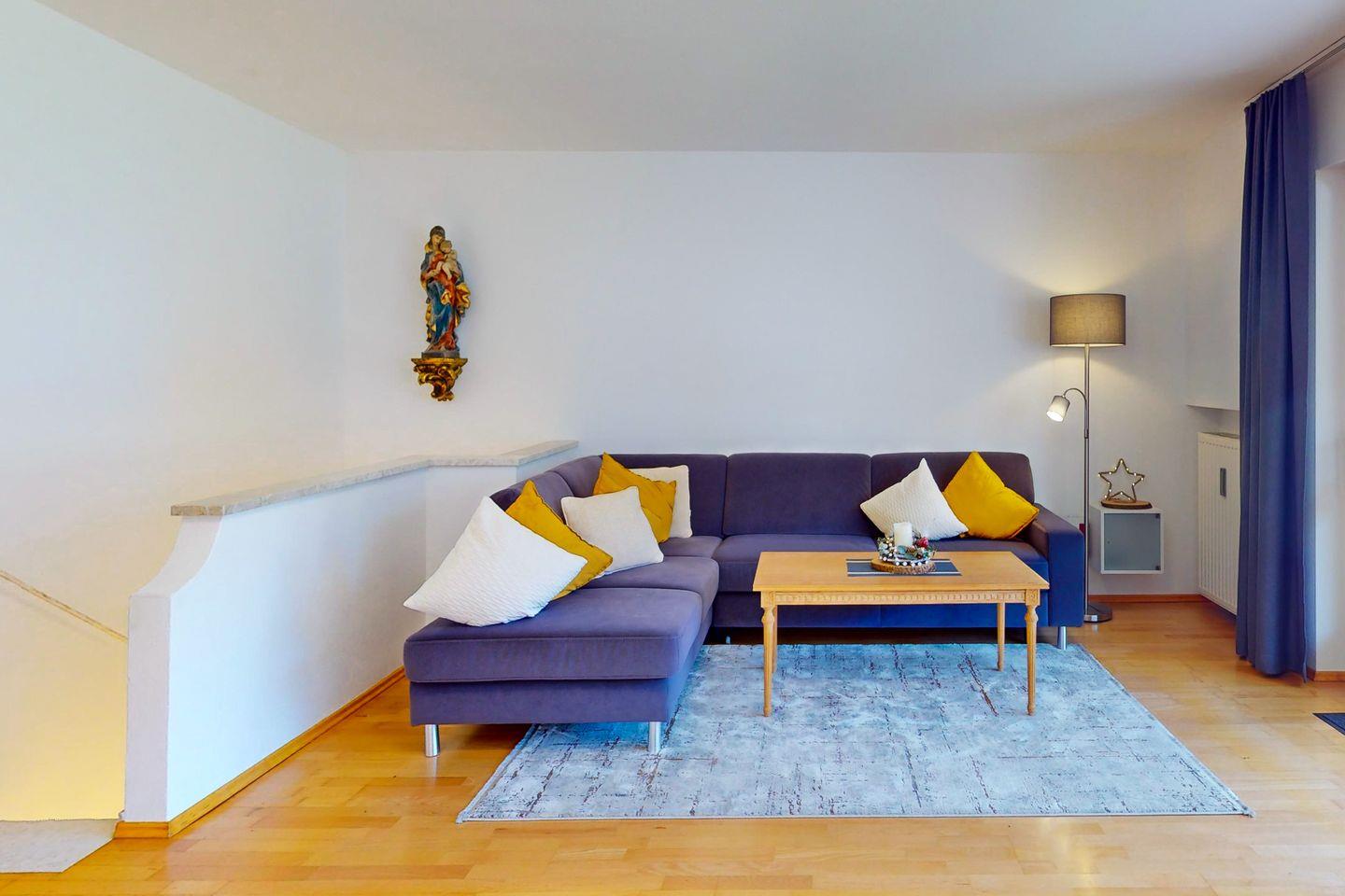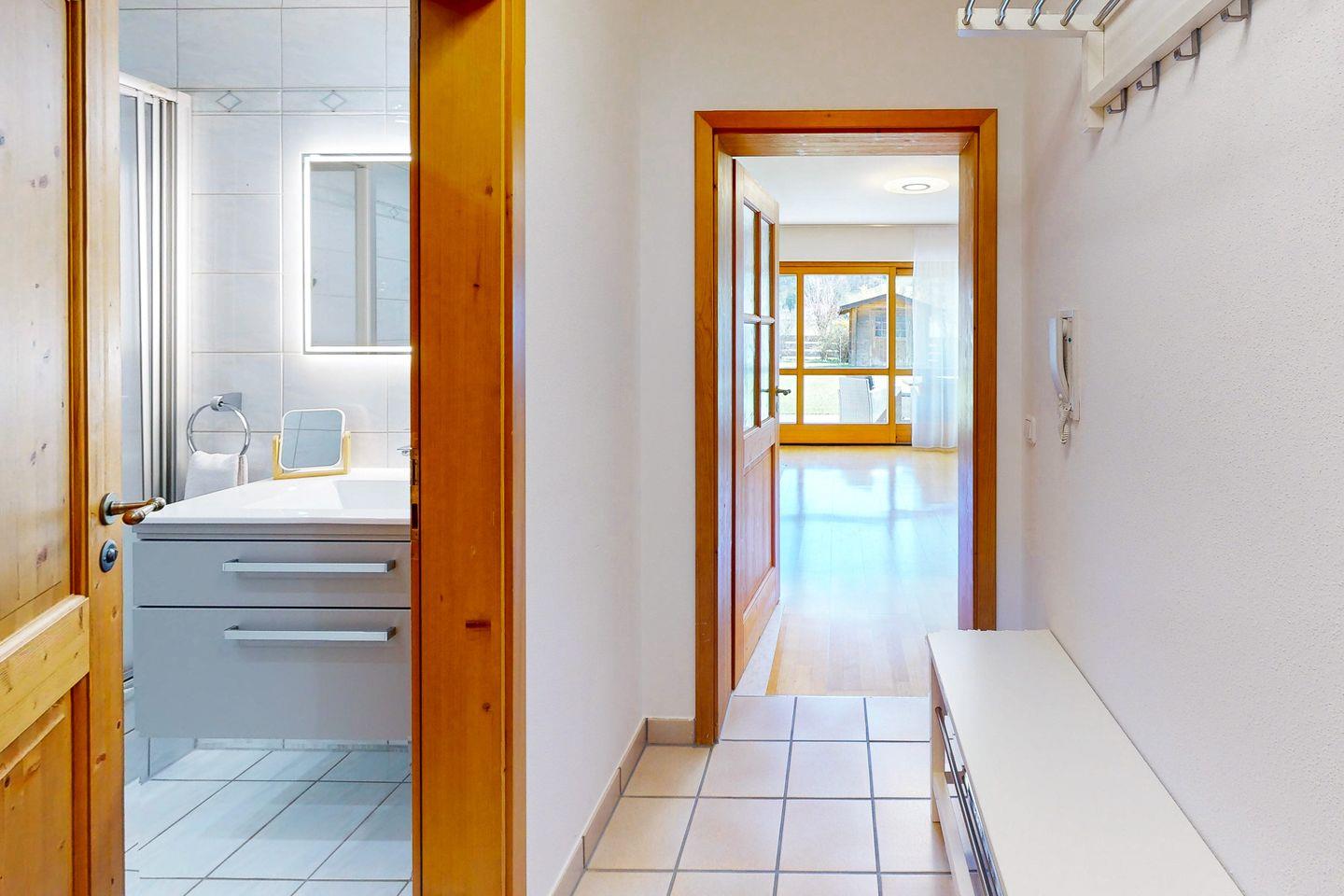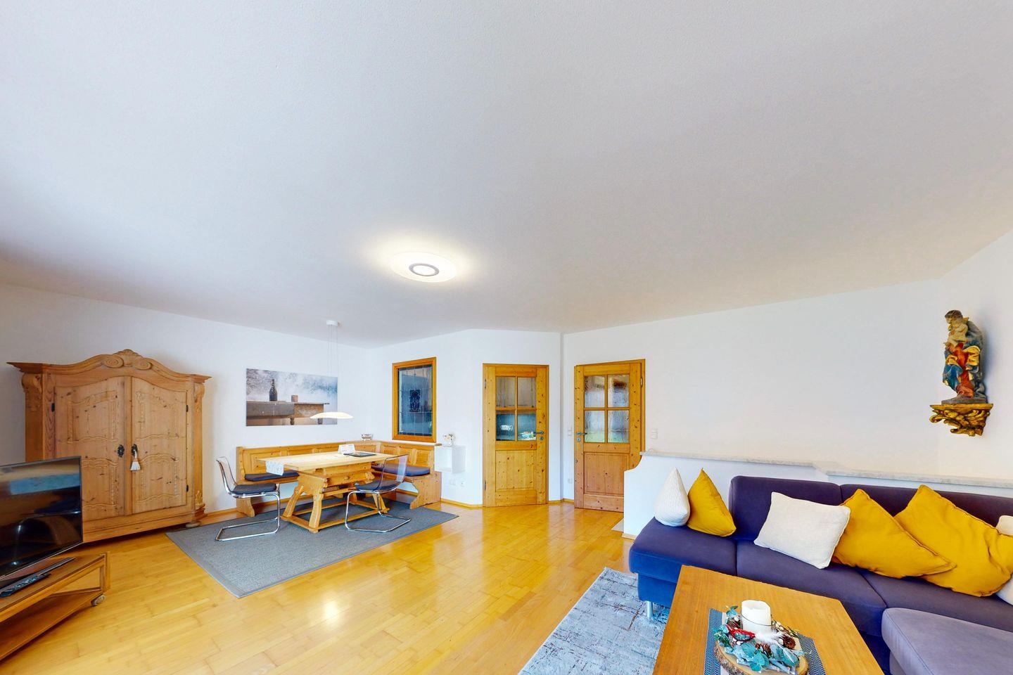 Eine nach Süden ausgerichtete Terrasse mit traumhaftem Bergblick und kleinem Garten lädt zum Entspannen und Verweilen ein. Hier können Sie die Sonne genießen und den Blick auf die imposanten Gipfel der Umgebung schweifen lassen – ein Anblick, der Sie garantiert begeistern wird.