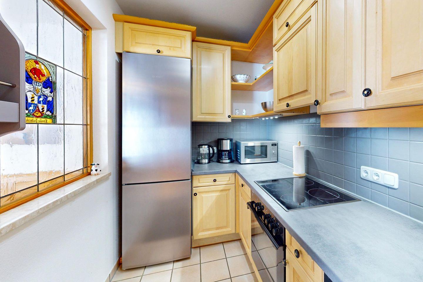Der helle und gemütliche Wohnraum lädt zum Entspannen ein und bietet eine bequeme Sofalandschaft sowie einen Esstisch für 4 Personen. Die separate Küche ist voll ausgestattet und bietet alles, was Sie benötigen, um Ihre Lieblingsgerichte zuzubereiten.